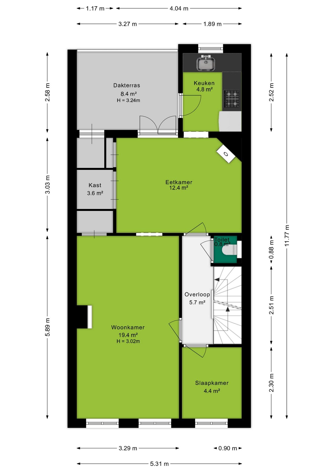 Bij binnenkomst op de eerste verdieping ontvouwt zich een stijlvolle en karaktervolle leefruimte waar licht, hoogte en sfeer de hoofdrol spelen. Vanaf de overloop, met toegang tot het toilet en de trapopgang, stap je direct de woonkamer binnen. De woonkamer en eetkamer vormen samen een prettige leefruimte waar je moeiteloos een comfortabele zithoek en een eettafel kunt plaatsen. De lichte laminaatvloer en neutrale afwerking creëren een warme, uitnodigende sfeer die past bij uiteenlopende woonstijlen. Grenzend aan de woonkamer bevindt zich een praktische werkkamer, ideaal voor thuiswerken of als rustige plek voor administratie. Dankzij het grote, hoge raam valt er veel daglicht binnen, waardoor de ruimte licht en prettig aanvoelt. Er is voldoende plek voor een bureau en extra opbergruimte, terwijl de ligging naast de woonkamer zorgt voor een fijne balans tussen verbondenheid en privacy. Vanuit de eetkamer zijn er dubbele deuren die toegang bieden naar het dakterras. Op het dakterras heb je de beschikking over een praktische bergruimte.