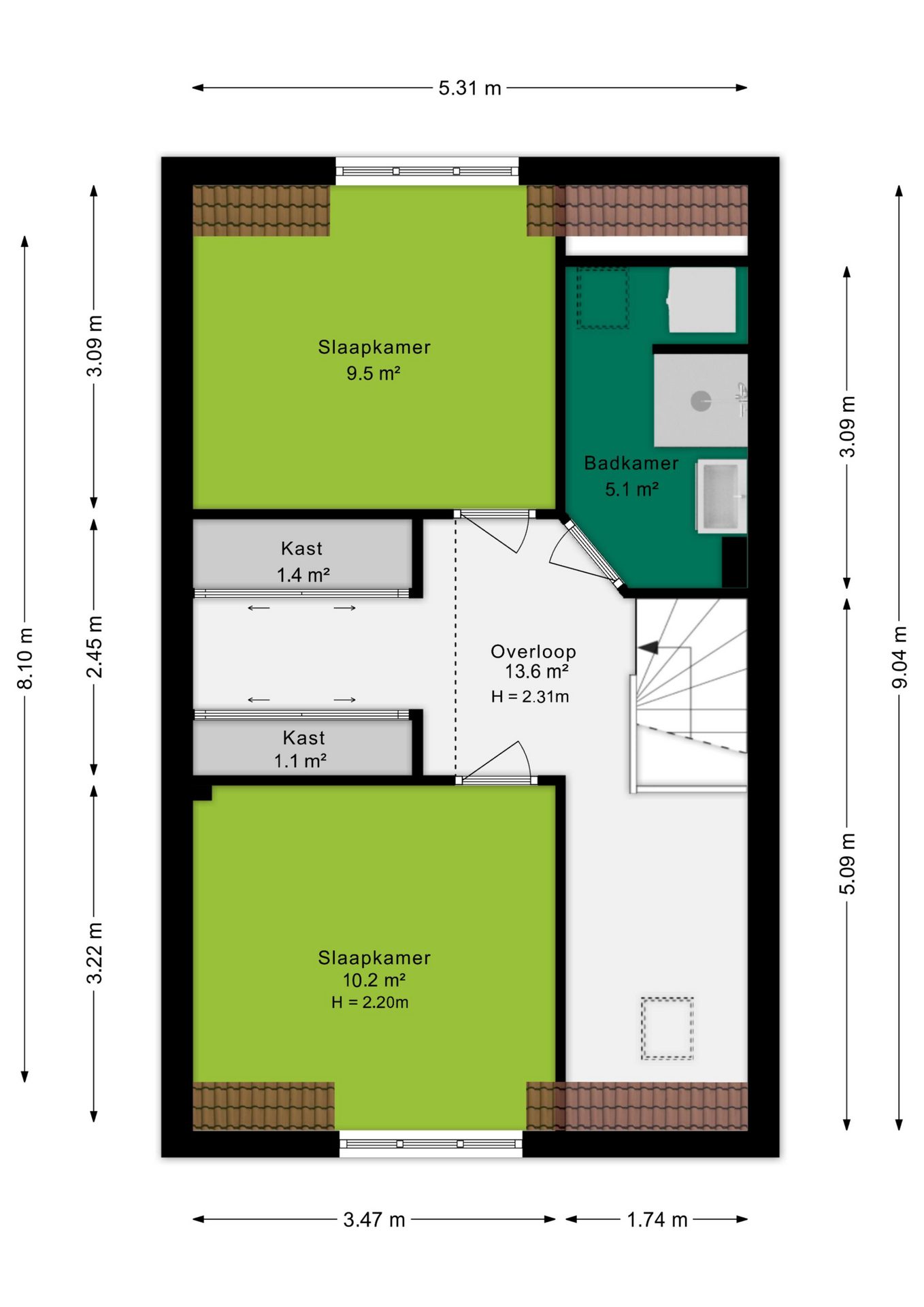 Op de ruime overloop bevinden zich twee praktische vaste schuifdeurkasten en is er toegang tot twee slaapkamers en de badkamer. Beide slaapkamers zijn circa 10 m² groot en beschikken over een dakkapel. De badkamer is voorzien van een dakraam voor natuurlijk licht en ventilatie, en uitgerust met een douche, wastafelmeubel en een aansluiting voor de wasmachine.