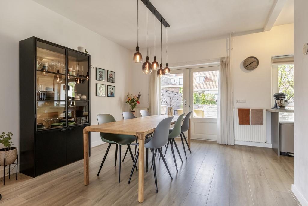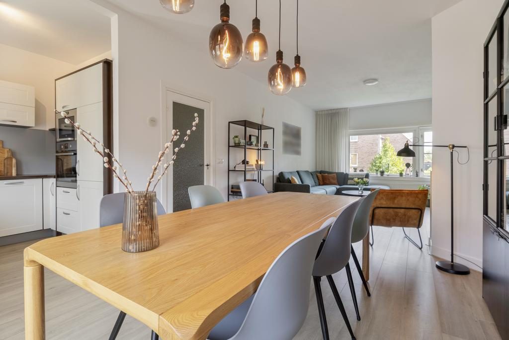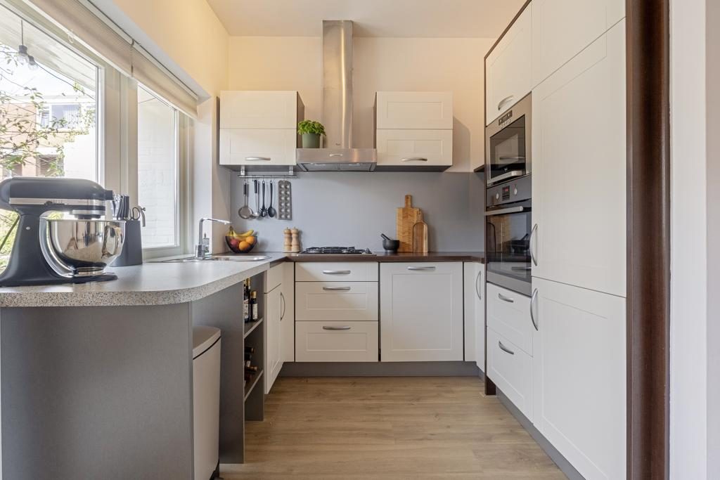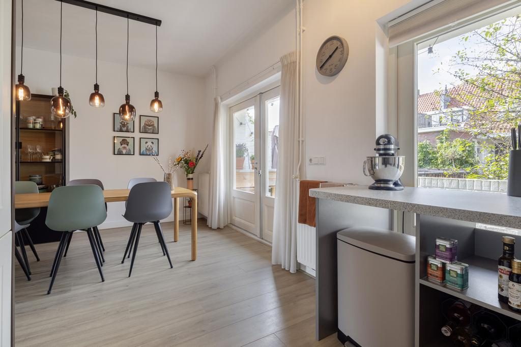 De overloop met toilet geeft toegang tot alle vertrekken. De sfeervolle en ruim bemeten woonkamer heeft een oppervlakte van 31,5m², is voorzien van een laminaatvloer en heerlijk veel lichtinval door de grote raampartijen. Door de fijne afmeting is er plek genoeg voor een eettafel. De open keuken is opgesteld in een lichte kleurstelling en voorzien van diverse inbouwapparatuur, te weten: een gasfornuis, afzuigkap, magnetron, oven (2022), koelkast, vriezer en een vaatwasser (2022). De (werk)kamer heeft een afmeting van 5,1m².