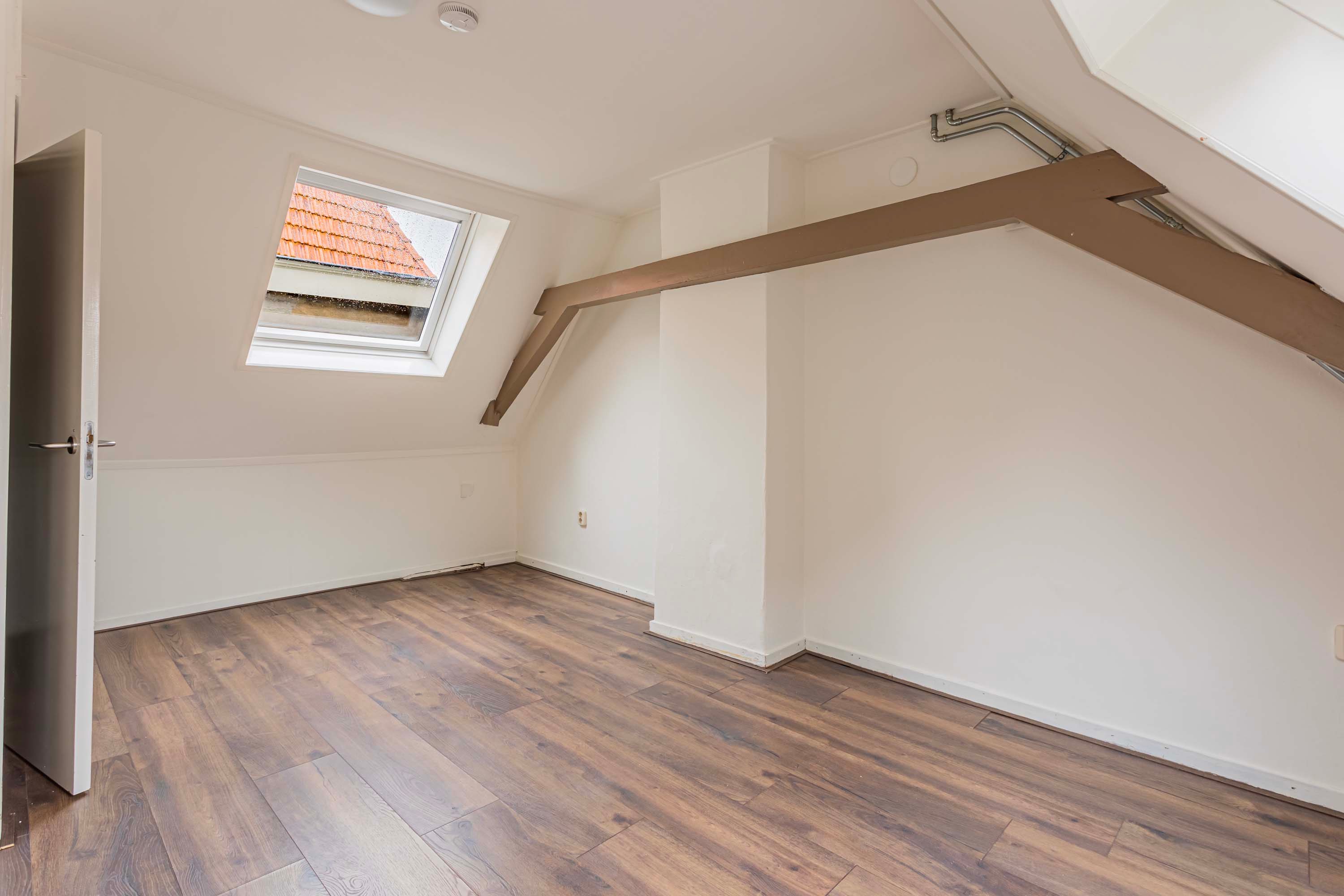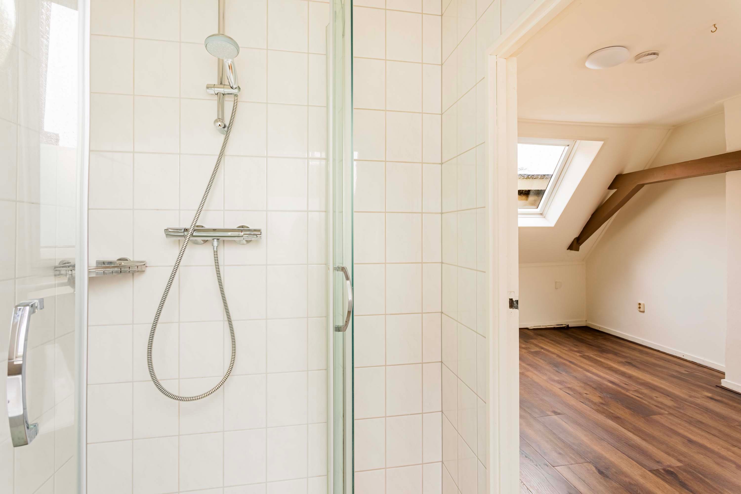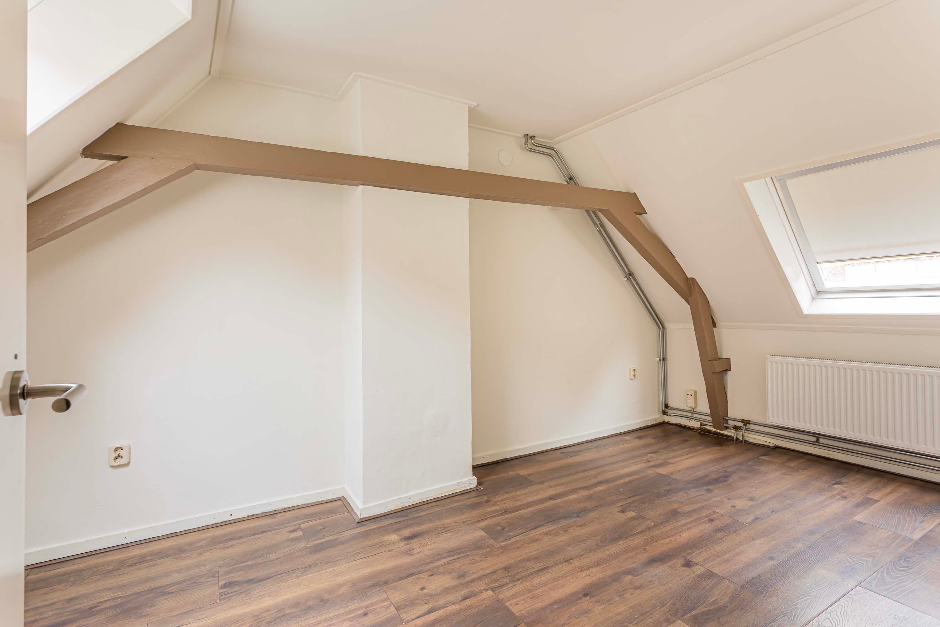 Middels de entree, met toegang naar de kelder, is via de trapopgang de eerste verdieping te bereiken. Op de eerste verdieping beschik je over een kleine overloop, met toegang naar de toiletruimte en de woonkamer. De woonkamer beschikt over een warme houtlook laminaatvloer met een open keuken. Door de raampartijen in de keuken ervaar je hier een prettig daglicht. Vanuit de keuken is de trapopgang naar de tweede verdieping te bereiken. Op de overloop tref je de C.V. opstelling, is via een losse trap de bergvliering te bereiken en is er toegang naar de slaapkamer. De ruime slaapkamer van circa 12m² en aansluitend de badkamer douche en wastafel. Zowel de slaapkamer als de badkamer beschikken over een Velux dakraam.