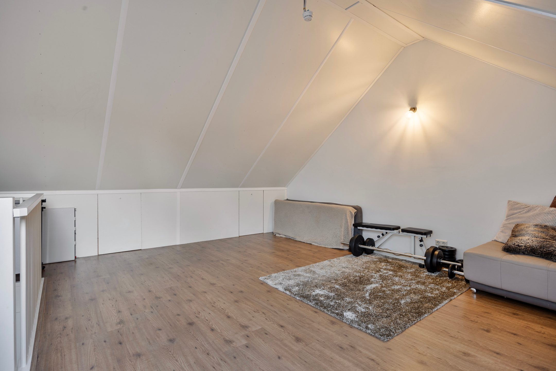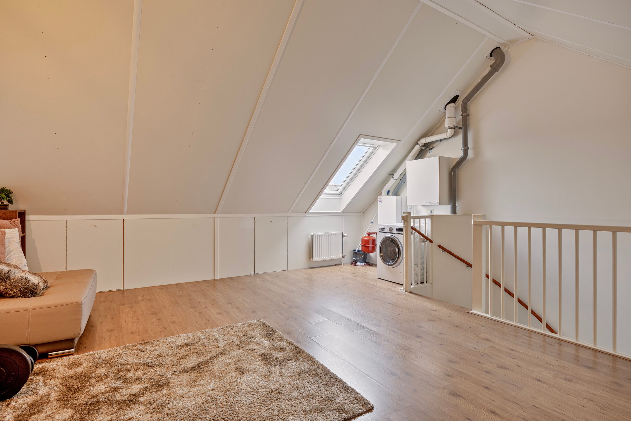 Het plaatsen van een dakkapel aan de achterzijde (vergunningsvrij) biedt bovendien een uitstekende manier om zowel de woonruimte als het lichtinval aanzienlijk te vergroten. Achter de knieschotten is extra bergruimte aanwezig, ideaal voor spullen die je uit het zicht wilt opbergen. De witgoedaansluitingen en de opstelling van de C.V.-ketel zijn op deze verdieping aanwezig.