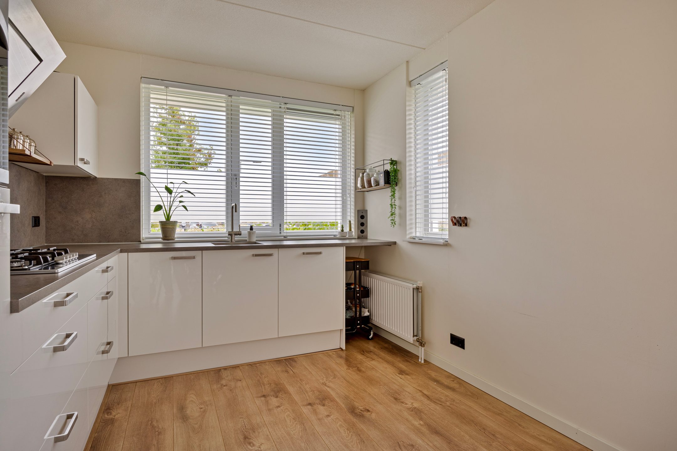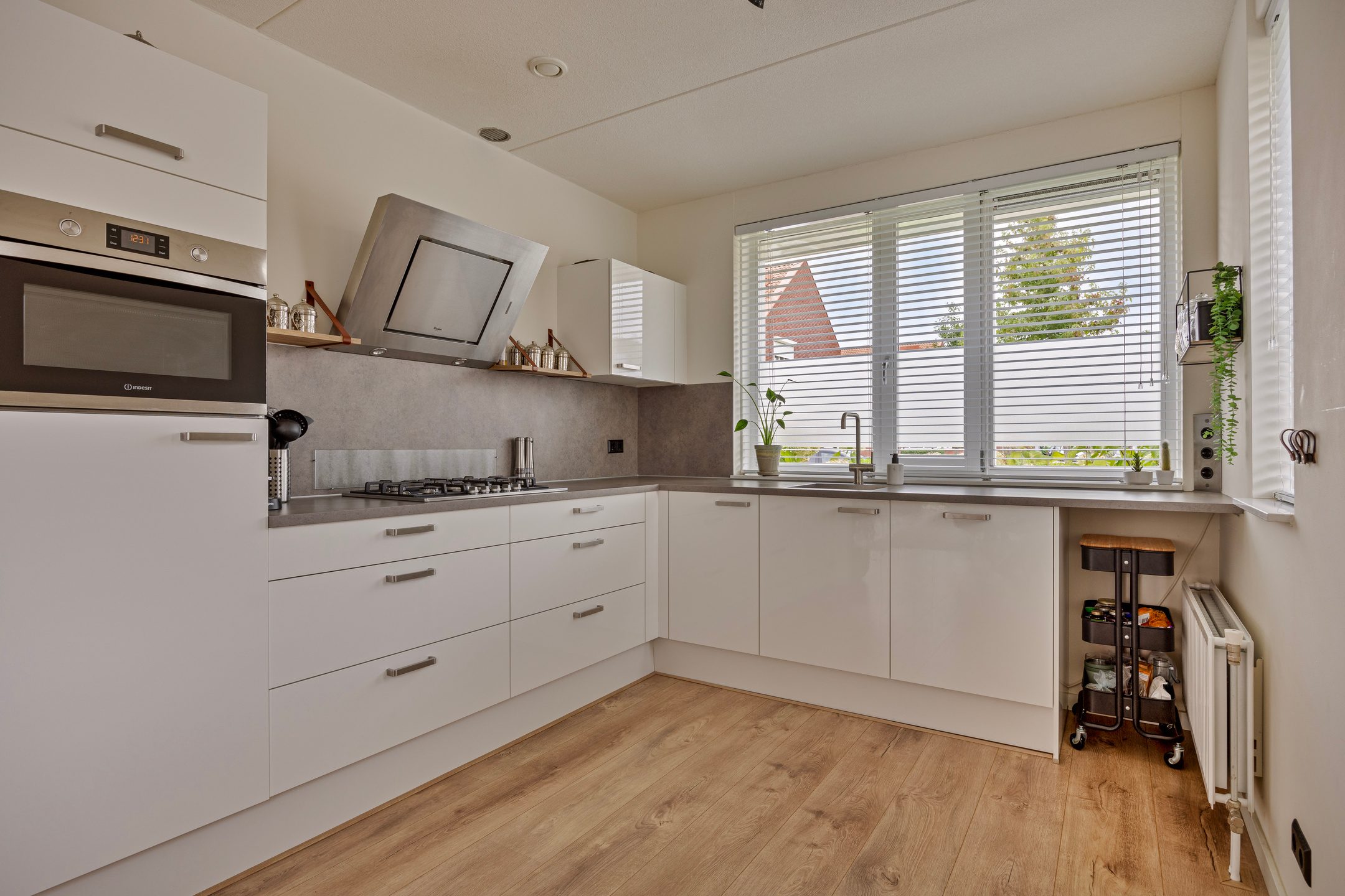 De moderne keuken (2020) in lichte kleuropstelling is uitgerust met diverse inbouwapparatuur, waaronder een gaskookplaat, schuine afzuigkap, combi-oven/magnetron, koel-vriescombinatie en een vaatwasser. De extra ramen in de zijgevel versterken het licht en maken deze leefruimte bijzonder aangenaam.