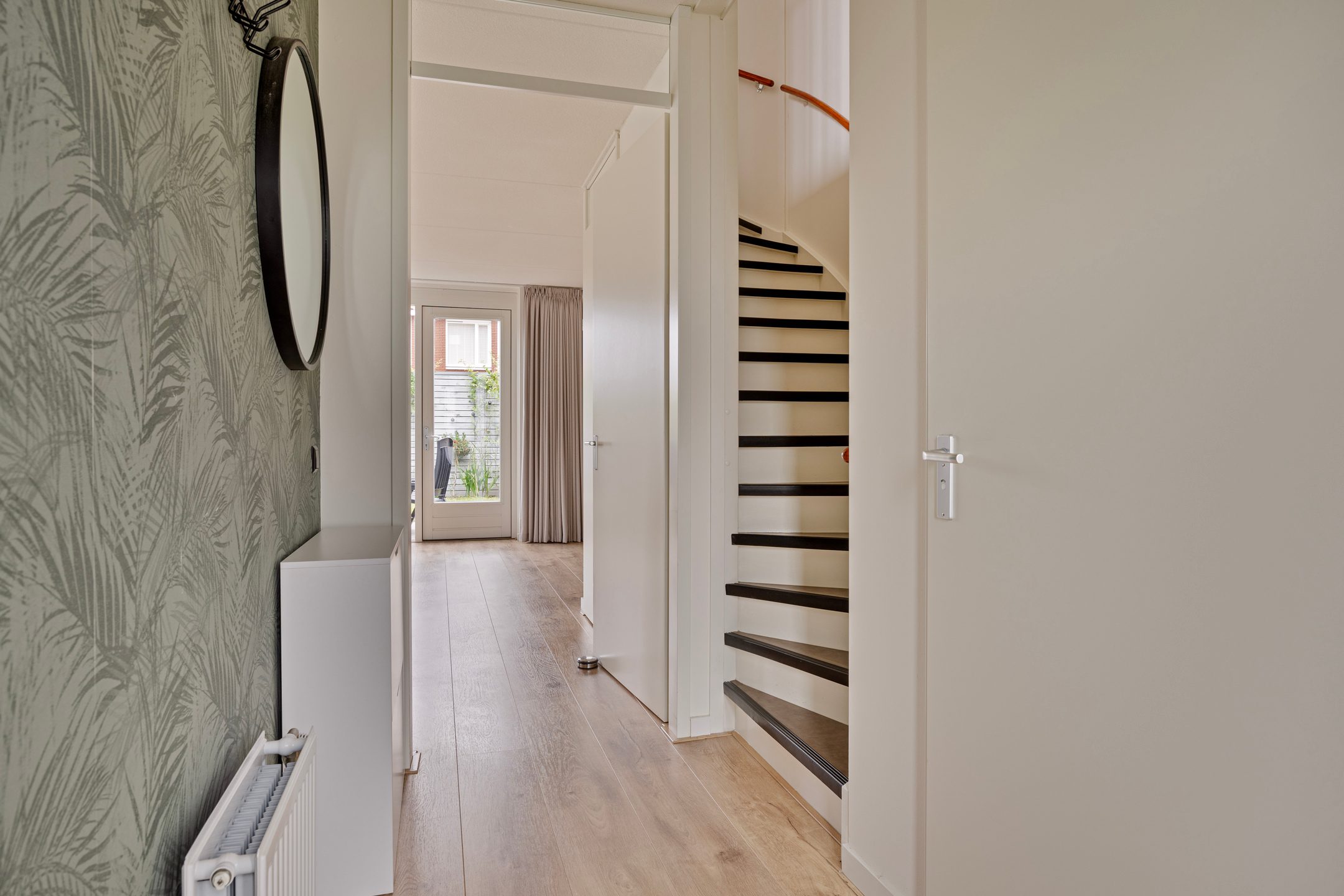 Via de entree kom je in de ruime hal met meterkast en een separaat toilet. Vanuit hier is er toegang tot de woonkamer en de keuken. De lichte woonkamer van ca. 30 m² is voorzien van een sfeervolle laminaatvloer, strak afgewerkte wanden en veel natuurlijke lichtinval. De sfeerhaard met tv-nis vormt een mooi middelpunt in de ruimte. Dankzij de fijne indeling is er voldoende plaats voor een grote eettafel, waarbij de ligging tussen de woonkamer en keuken zorgt voor een prettige verbinding tussen beide ruimtes.