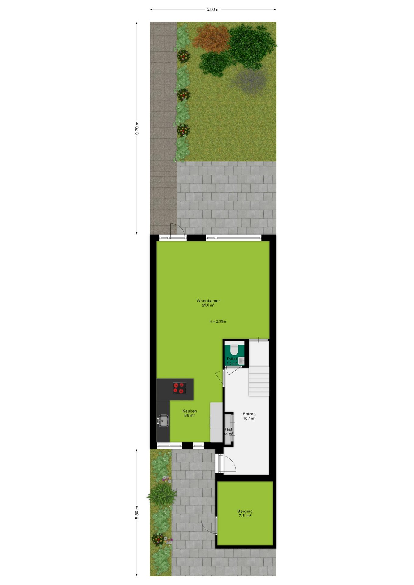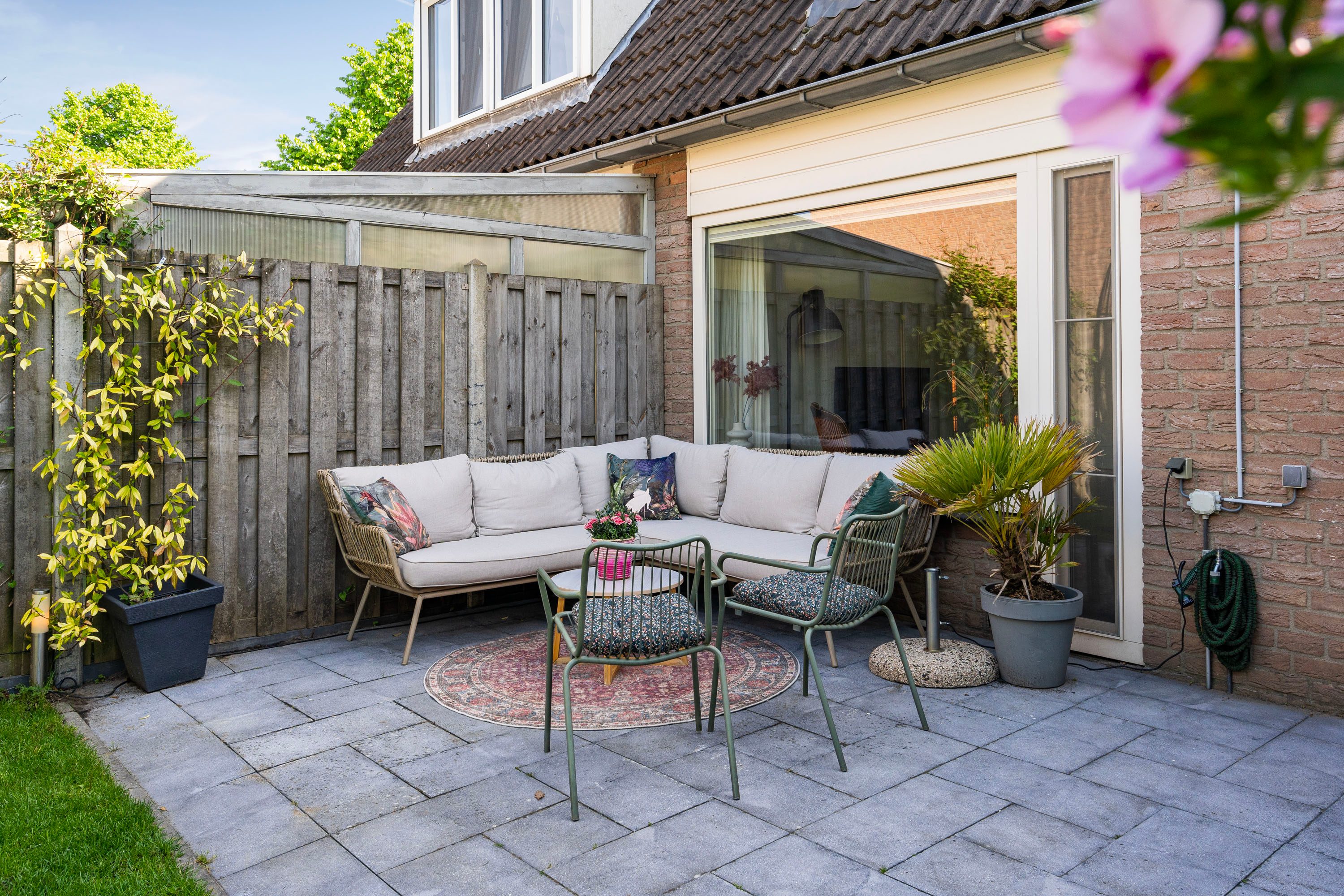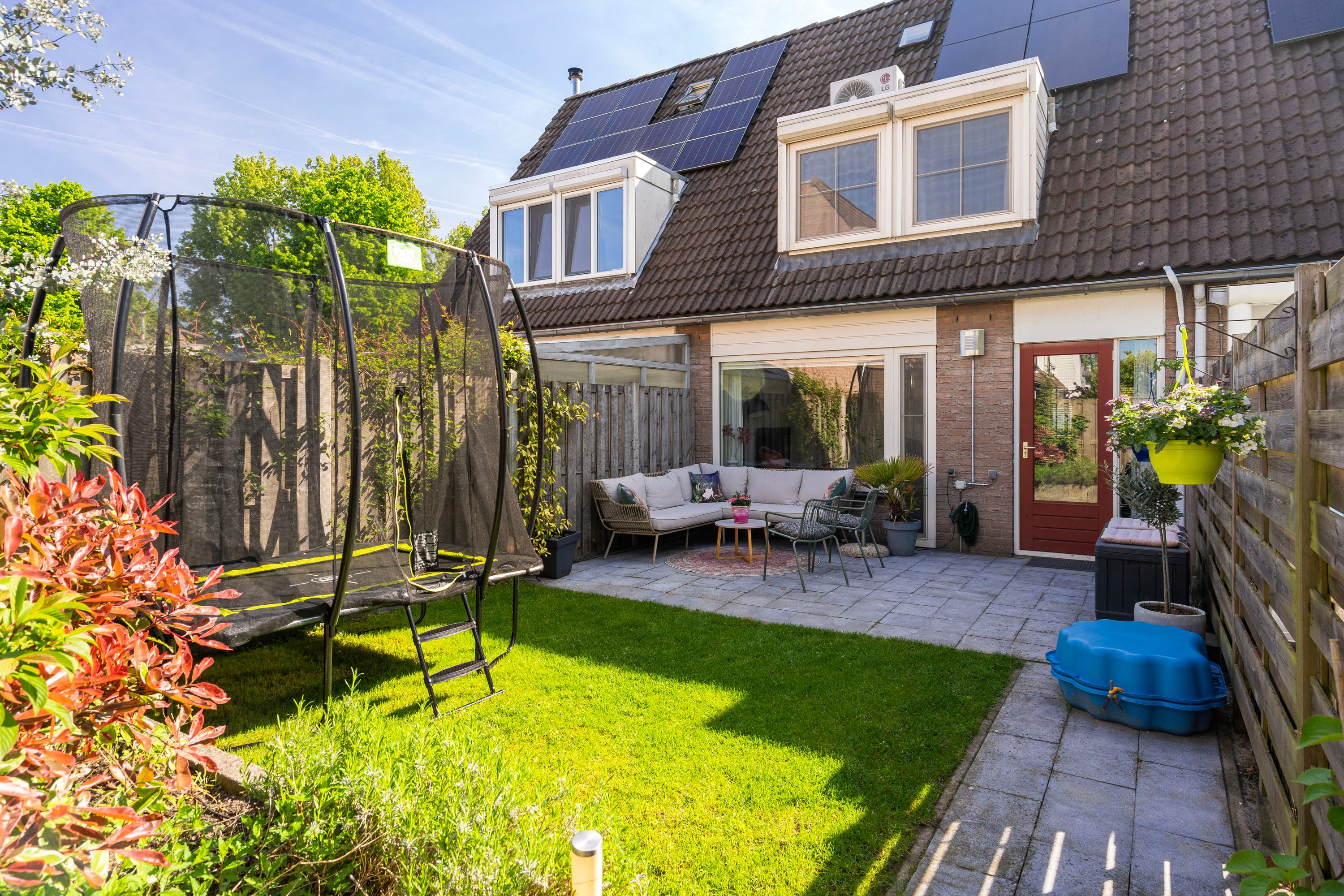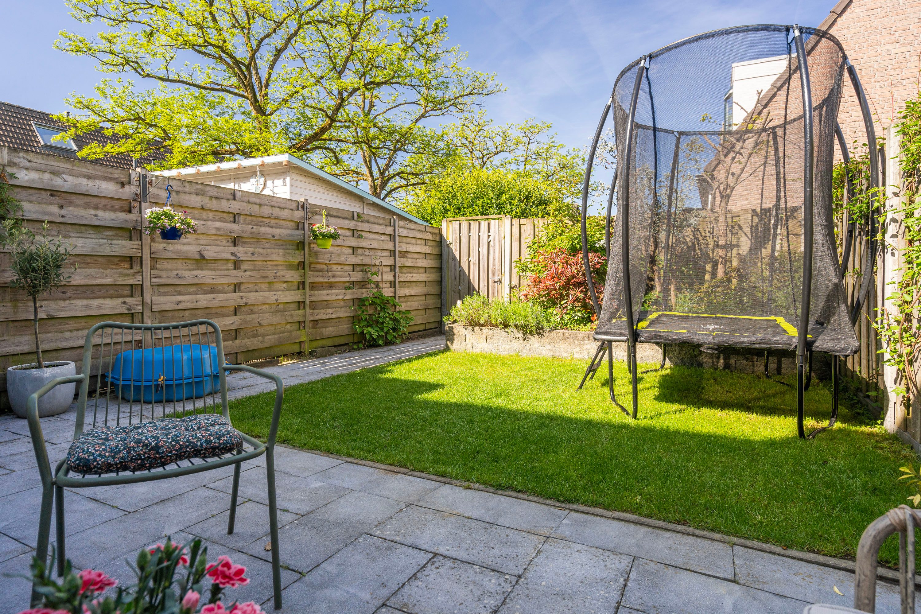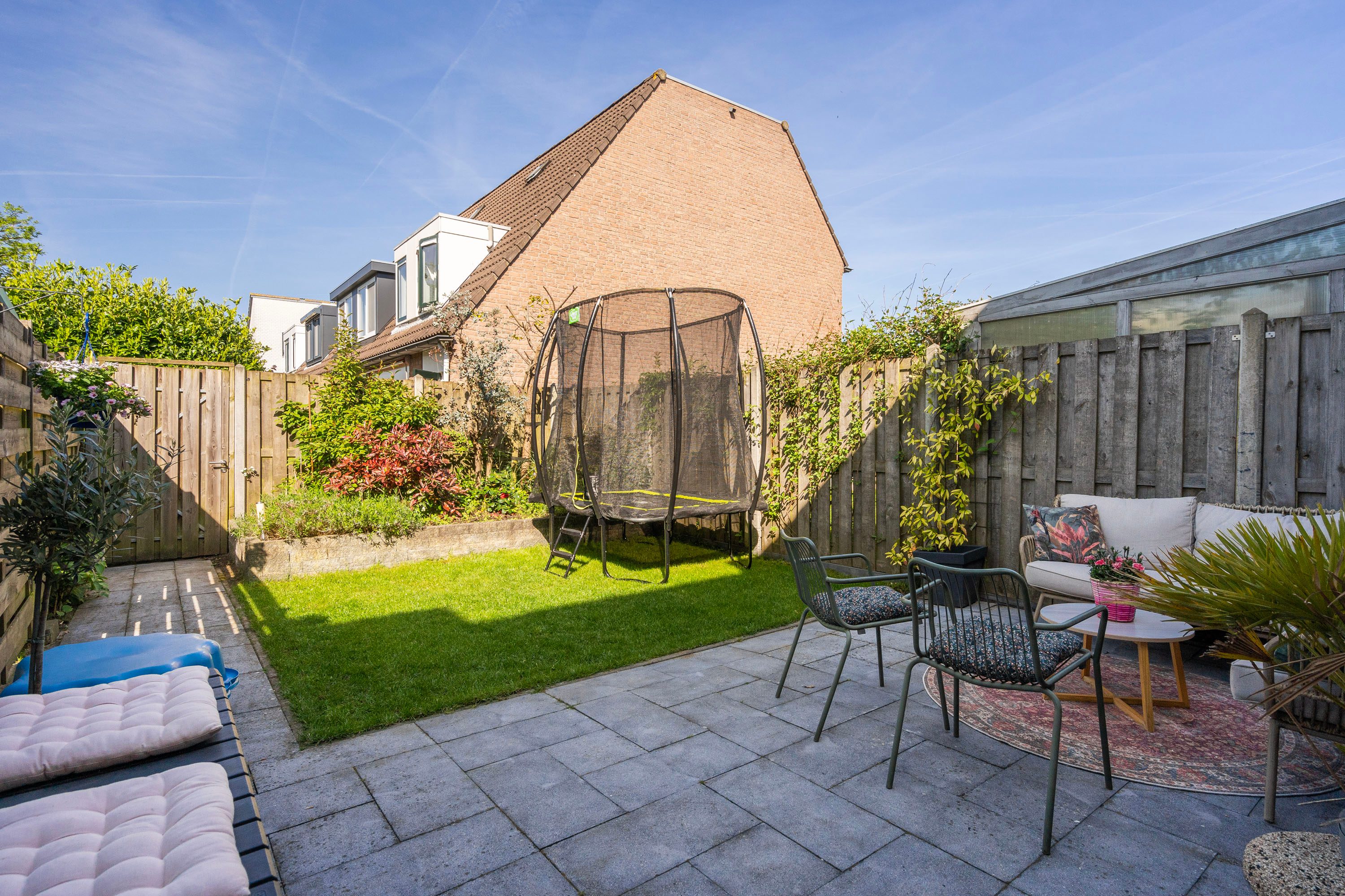 Zowel de voortuin als achtertuin zijn fraai aangelegd met groene beplanting en een terras. Ook fijn is de privacy die je ervaart in de achtertuin, hier kan je echt genieten van het buitenleven! Daarnaast is de achtertuin onderhoudsvriendelijk aangelegd, gelegen op het westen en voorzien van een achterom. De berging aan de voorzijde van de woning is ideaal voor extra opslag en het stallen van de fiets.