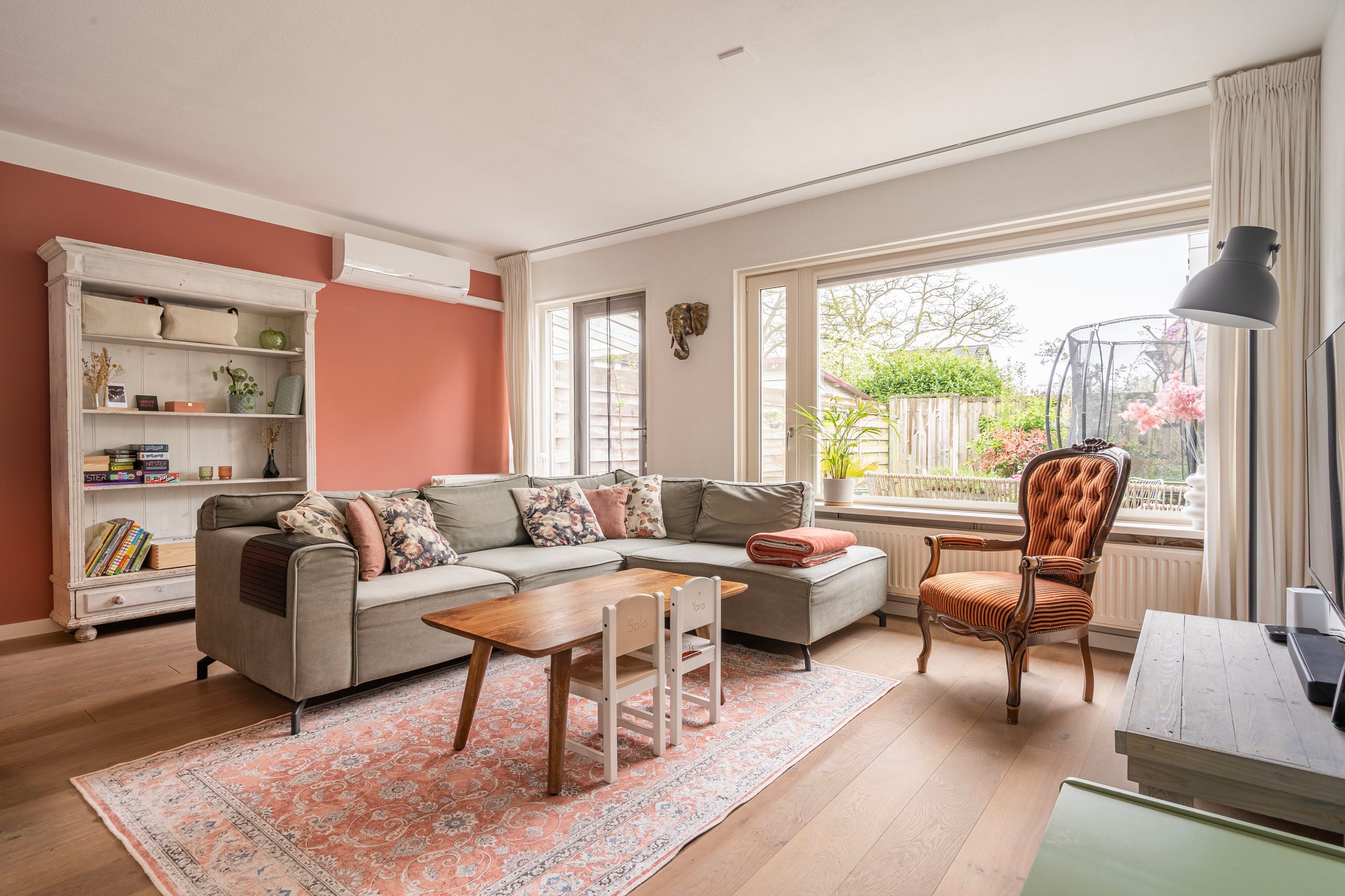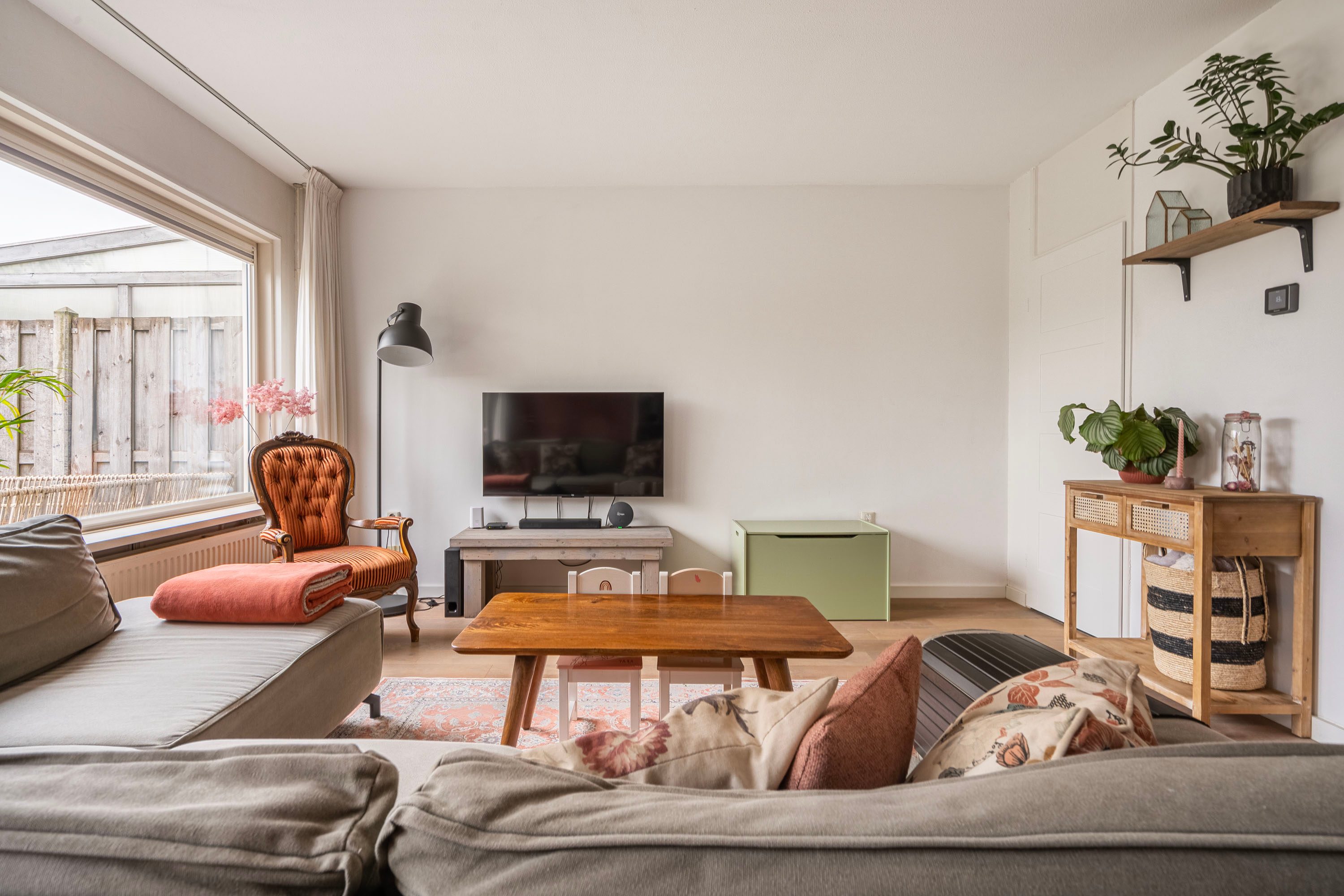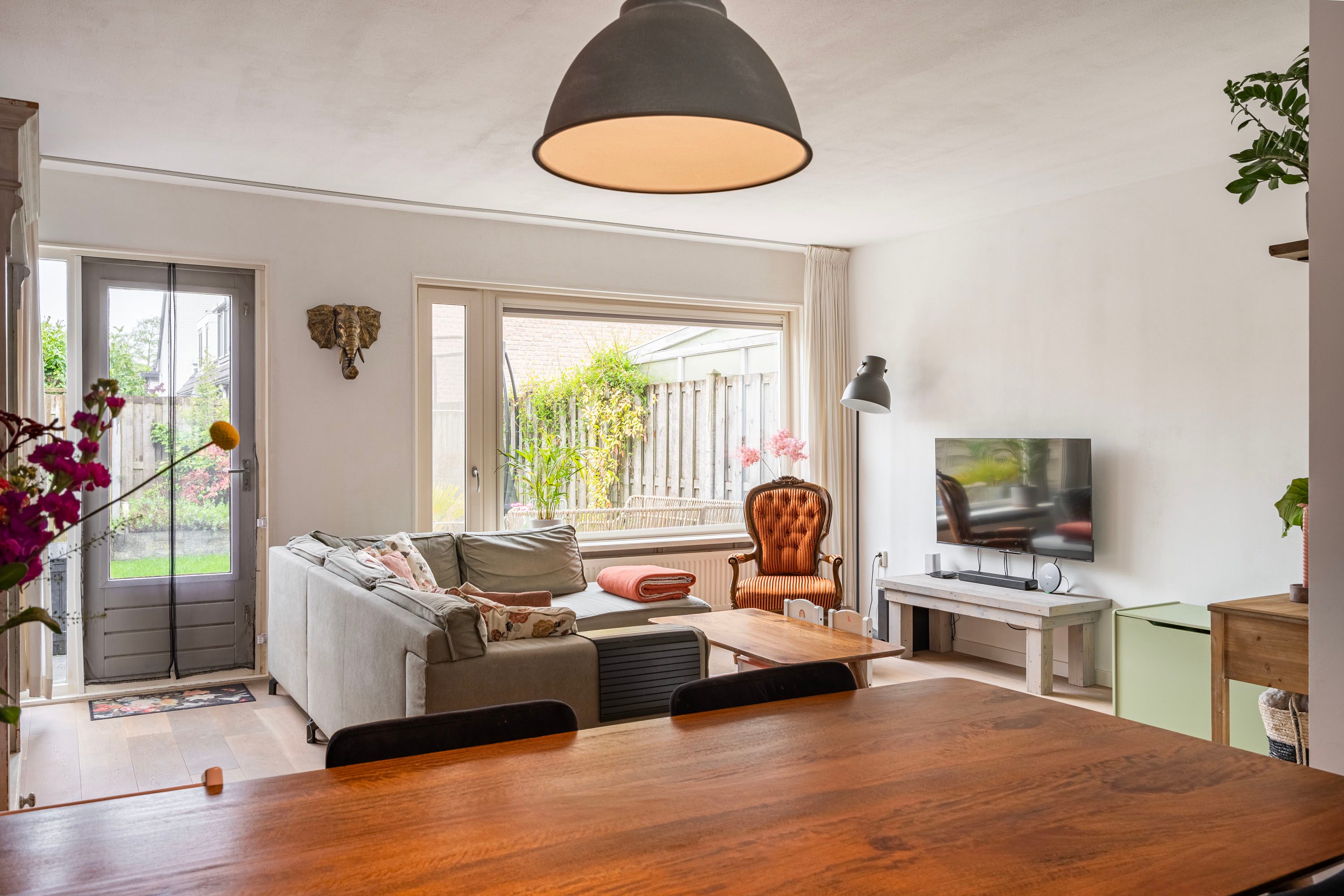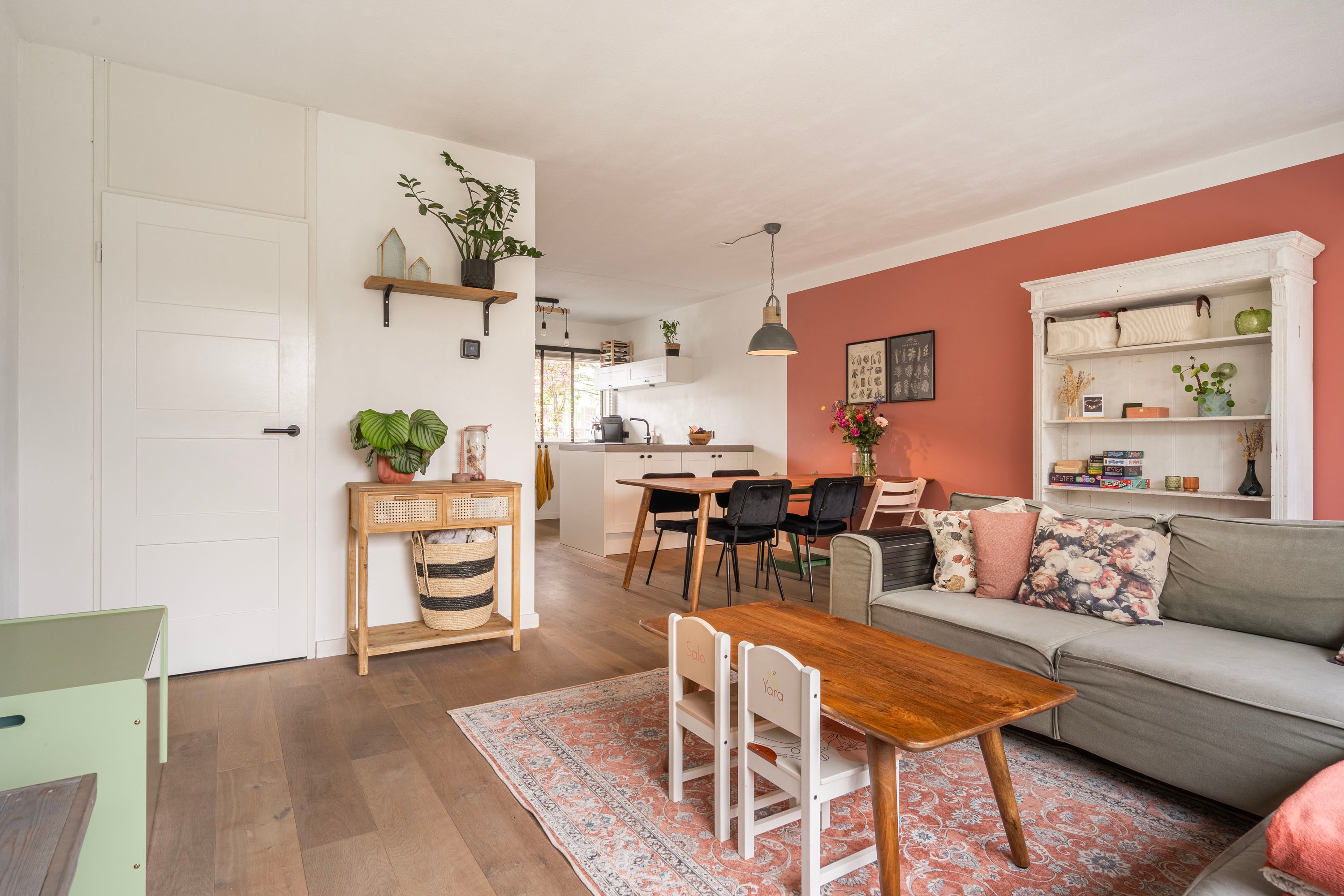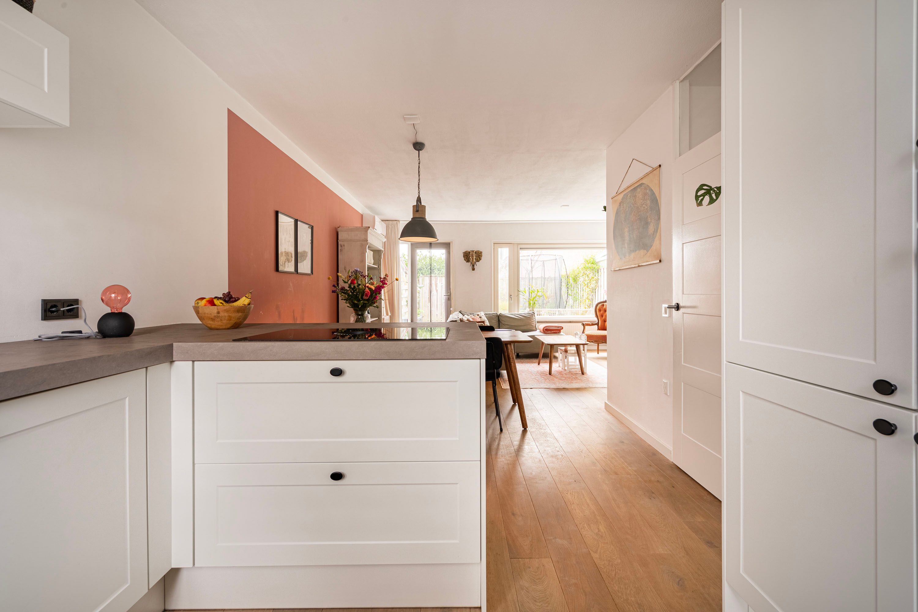 Bij binnenkomst in de ruime hal voel je direct de fijne afwerking. De hal is voorzien van een toiletruimte, trapopgang naar de verdieping en biedt toegang naar de woonkamer met open keuken. De tuingerichte woonkamer is sfeervol ingericht met een houten vloer en voldoende ruimte voor een gezellige zithoek, speelhoek voor de kinderen en het plaatsen van een 6-persoons eettafel. Vanuit de woonkamer is er toegang naar de achtertuin. Daarnaast is de praktische trapkast is ideaal voor extra voorraad en opbergruimte. De keuken, geplaatst in 2021, is opgesteld in een lichte kleuropstelling met een kastenwand en keukenblok met geïntegreerde kookplaat met afzuiging en diverse inbouwapparatuur zoals o.a. een koel-/vriescombinatie, combi-oven, vaatwasser en een kokend waterkraan. Door deze opstelling heb je tijdens het koken een open verbinding met de woonkamer, ideaal voor als er visite is om gezellig te tafelen, of om een oogje in het zeil te houden naar de kinderen. De kasten bieden voldoende opslagruimte voor het kookgerei.