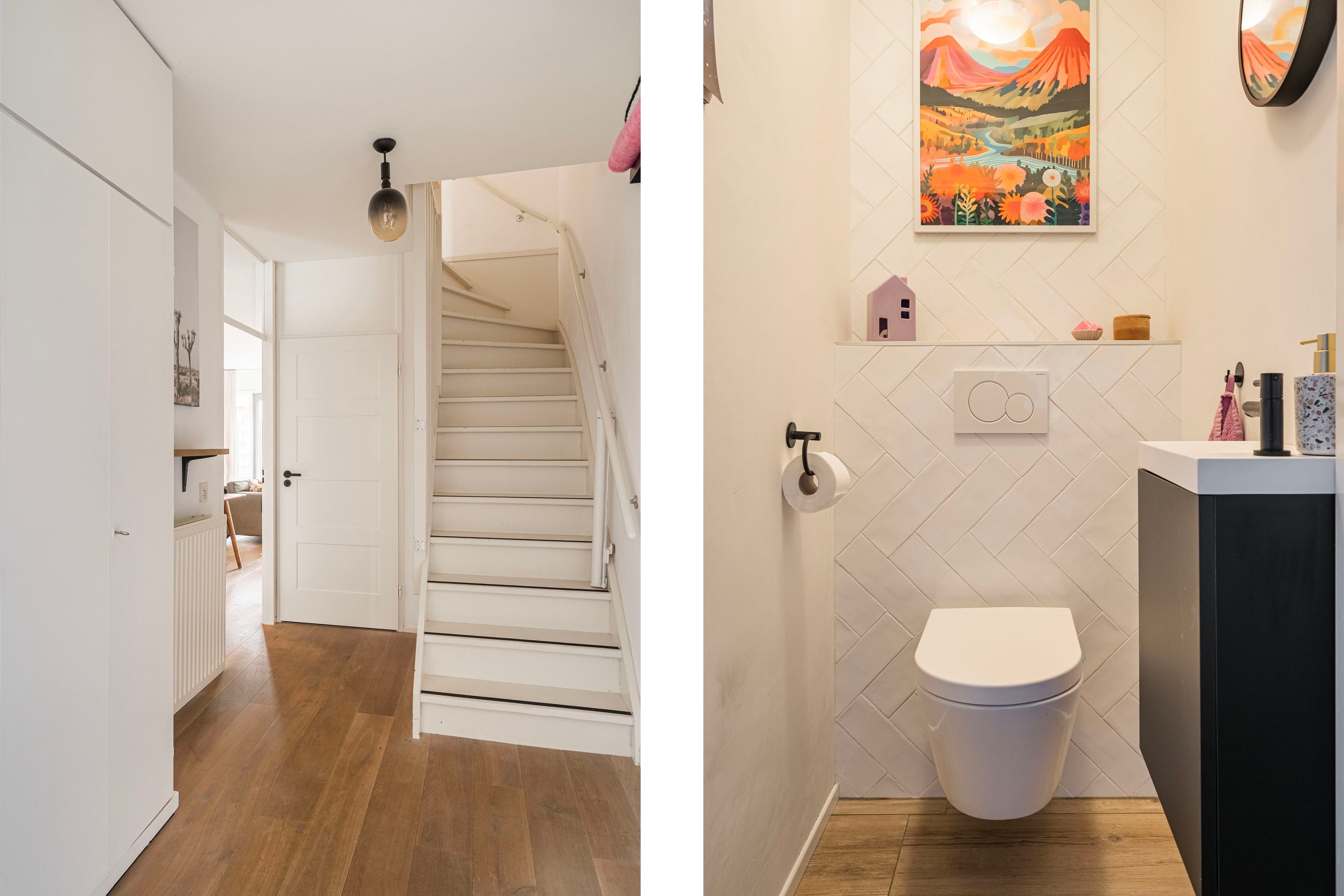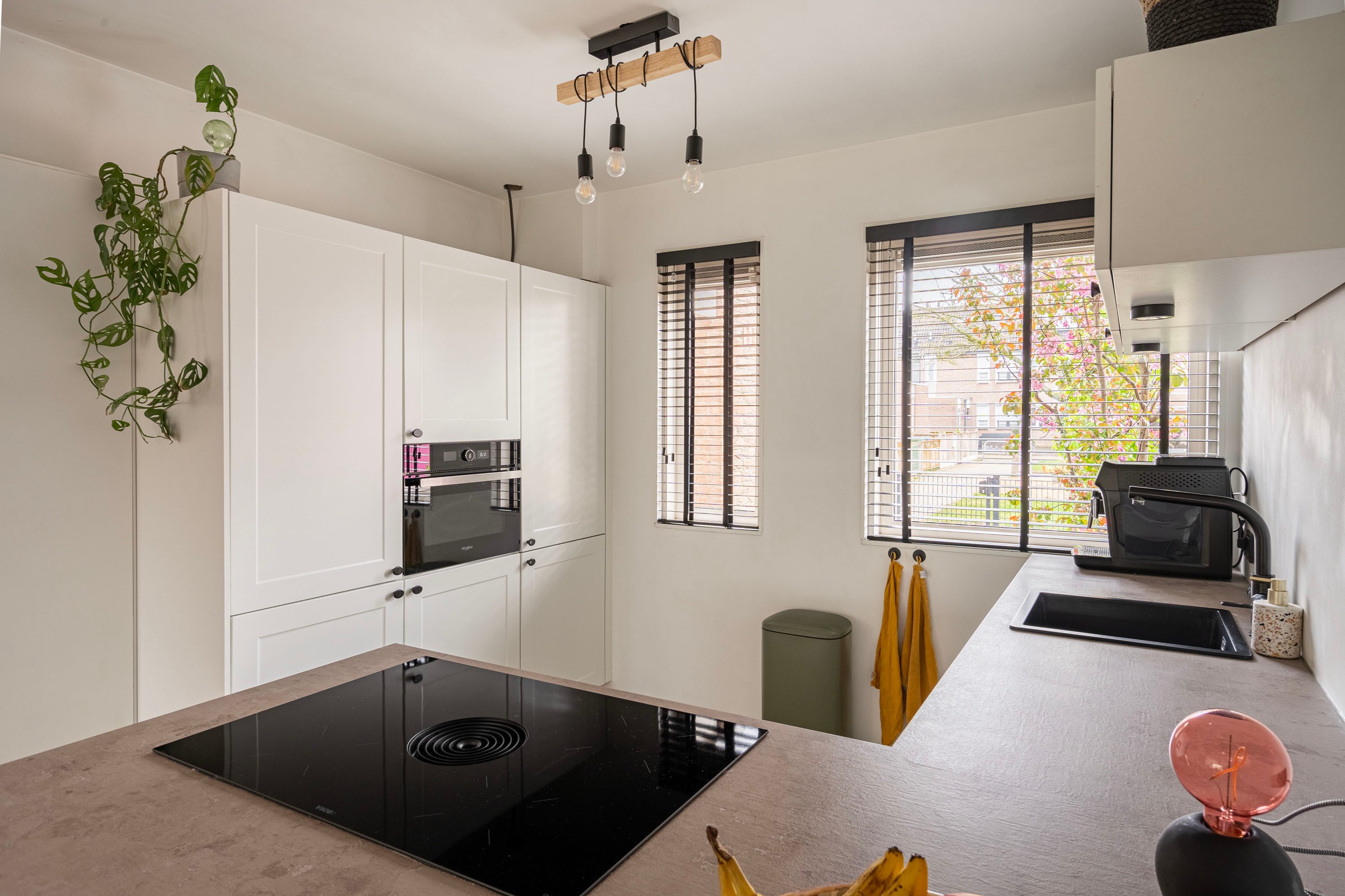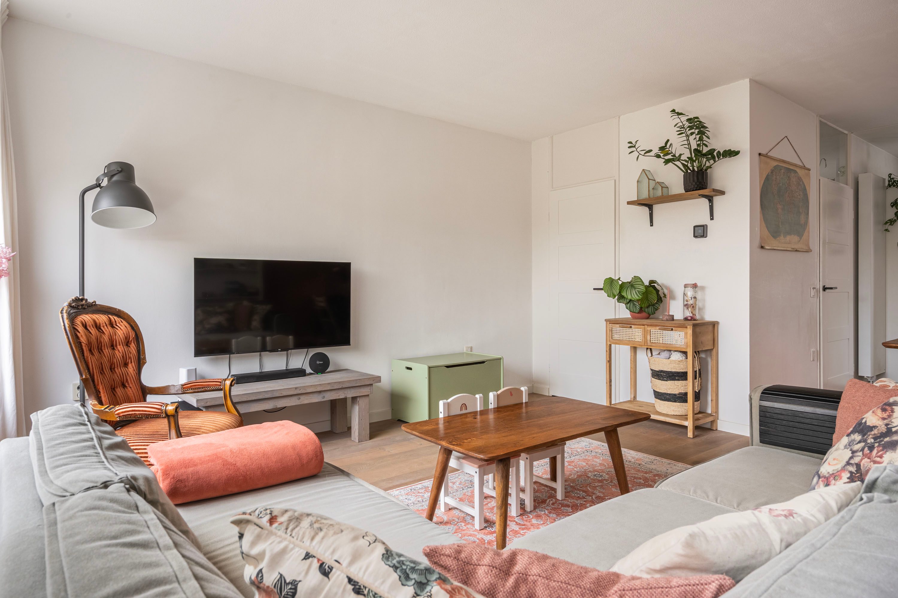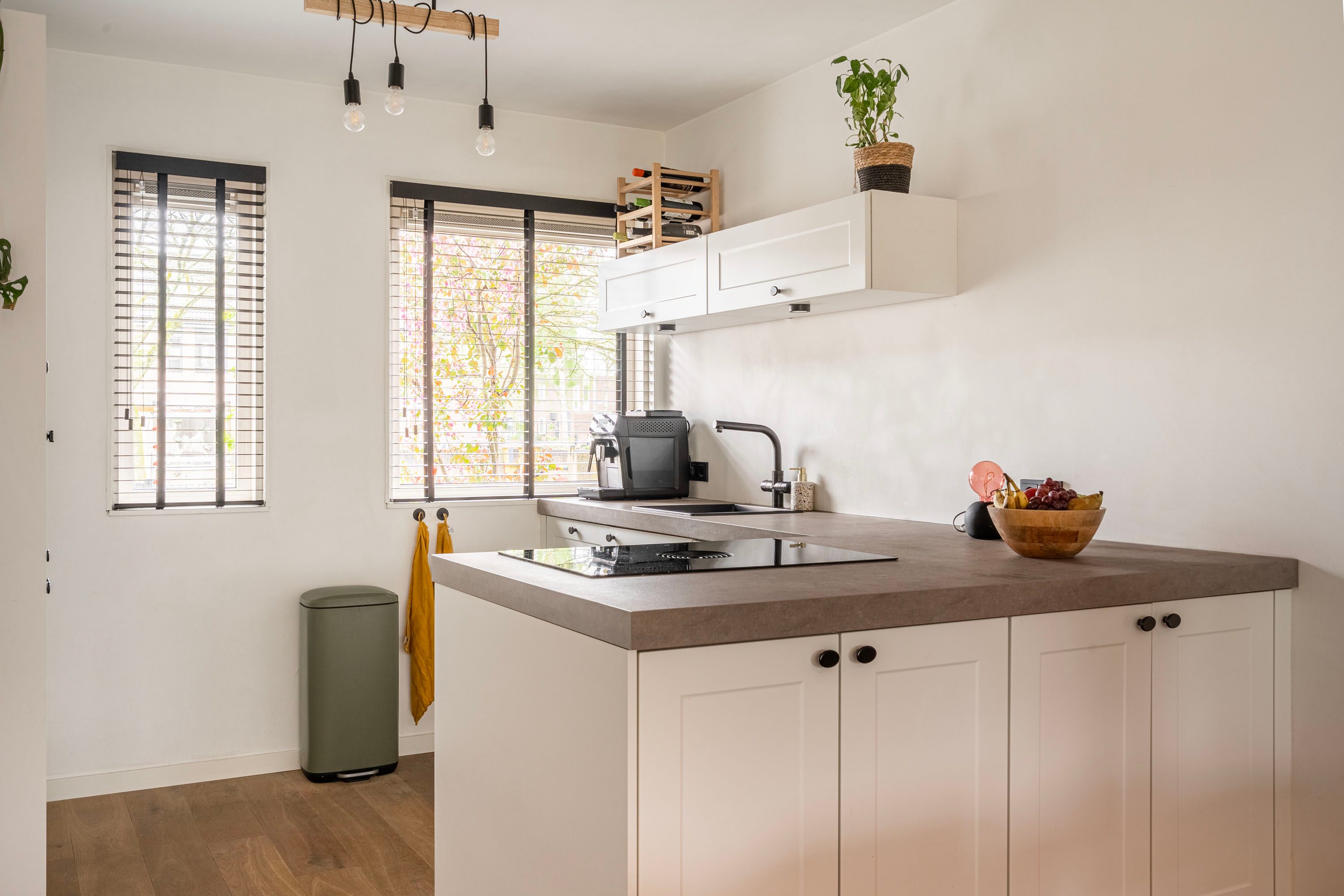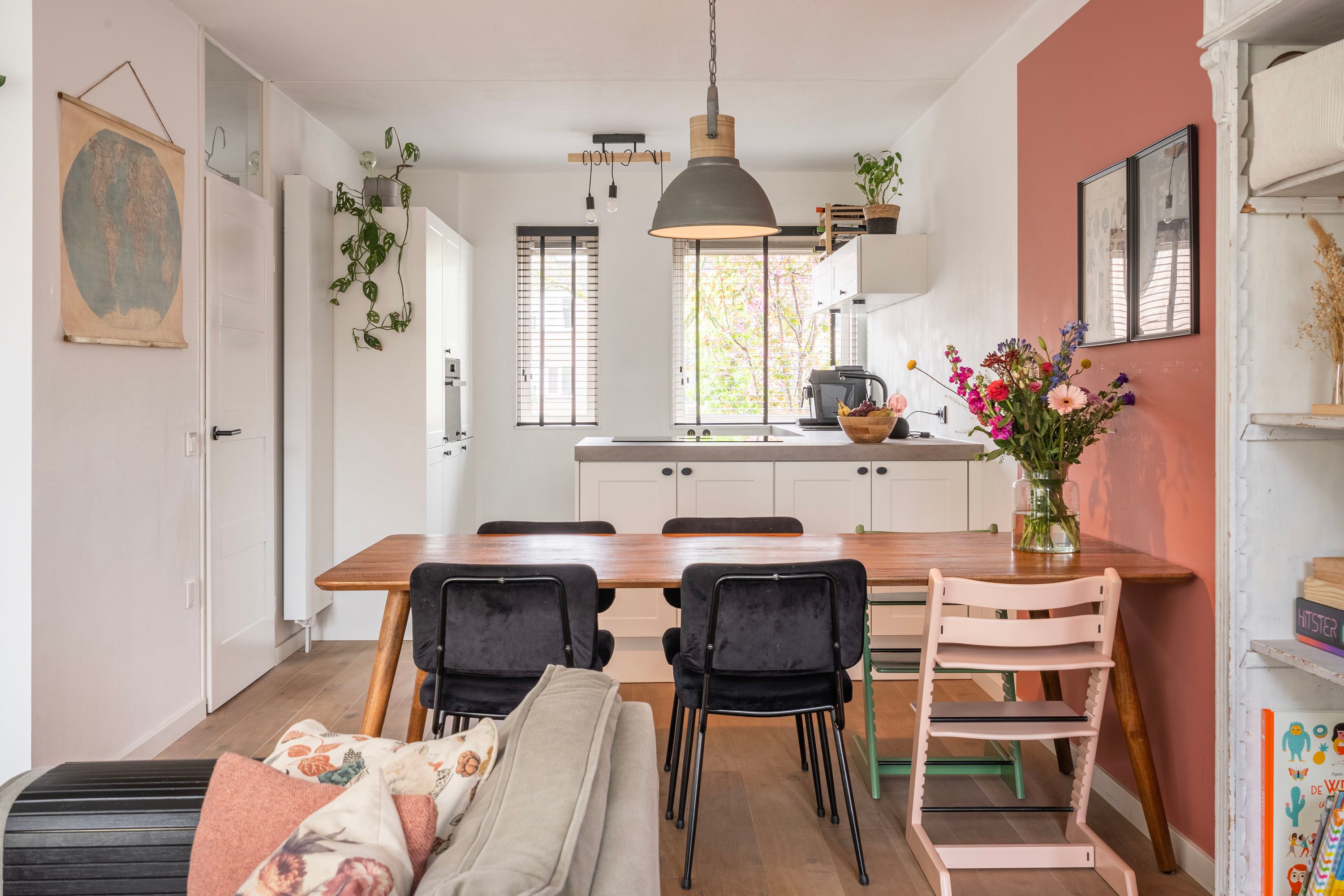 Bij binnenkomst in de ruime hal voel je direct de fijne afwerking. De hal is voorzien van een toiletruimte, trapopgang naar de verdieping en biedt toegang naar de woonkamer met open keuken. De tuingerichte woonkamer is sfeervol ingericht met een houten vloer en voldoende ruimte voor een gezellige zithoek, speelhoek voor de kinderen en het plaatsen van een 6-persoons eettafel. Vanuit de woonkamer is er toegang naar de achtertuin. Daarnaast is de praktische trapkast is ideaal voor extra voorraad en opbergruimte. De keuken, geplaatst in 2021, is opgesteld in een lichte kleuropstelling met een kastenwand en keukenblok met geïntegreerde kookplaat met afzuiging en diverse inbouwapparatuur zoals o.a. een koel-/vriescombinatie, combi-oven, vaatwasser en een kokend waterkraan. Door deze opstelling heb je tijdens het koken een open verbinding met de woonkamer, ideaal voor als er visite is om gezellig te tafelen, of om een oogje in het zeil te houden naar de kinderen. De kasten bieden voldoende opslagruimte voor het kookgerei.