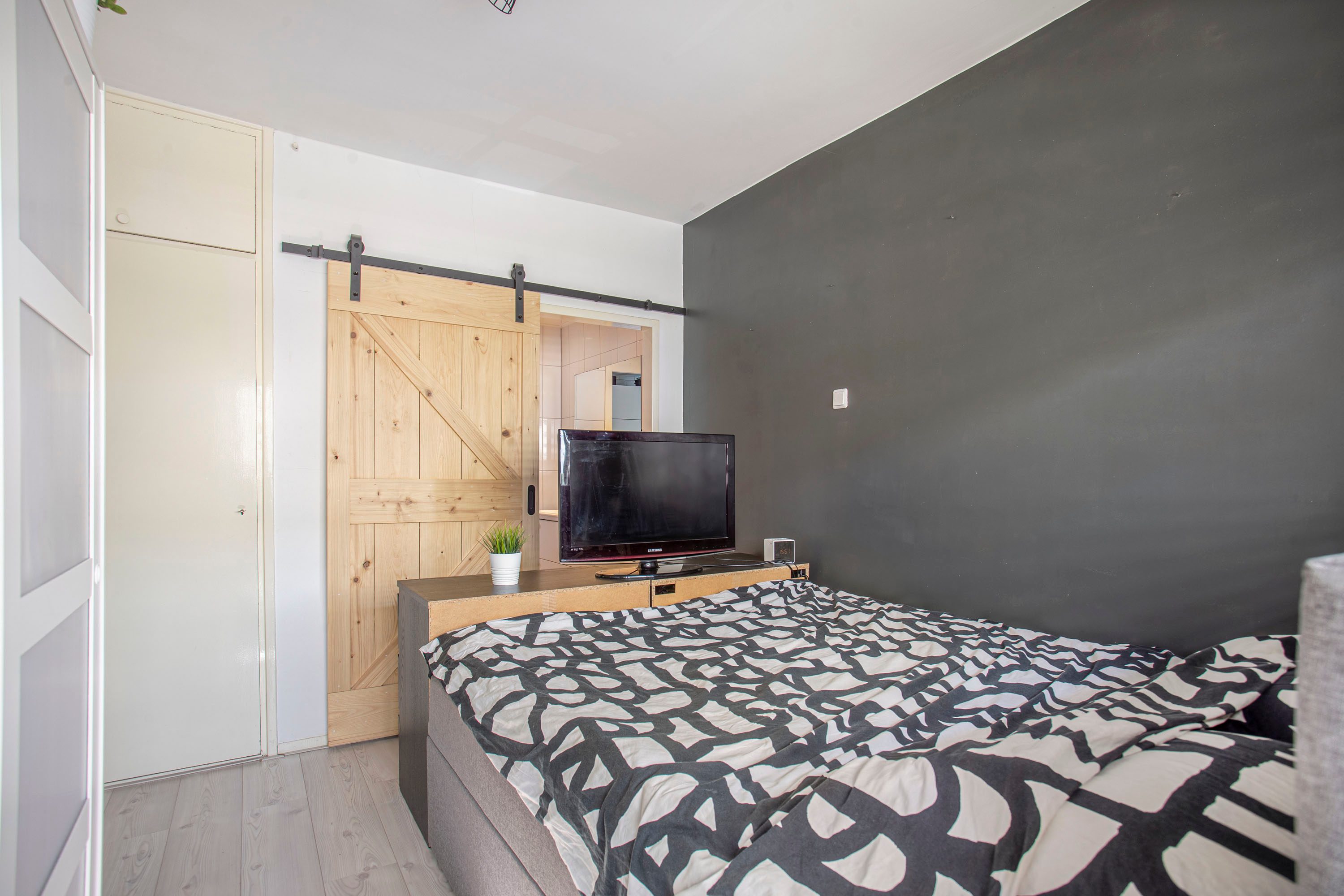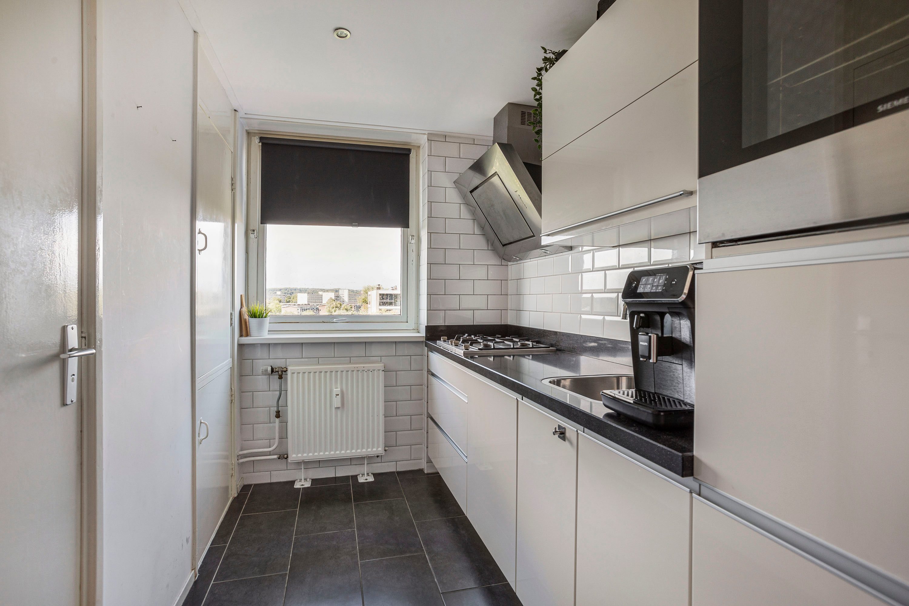 Bij binnenkomst vind je de entree, meterkast, vaste kast en een modern toilet met fontein. De lichte woonkamer heeft een tv-meubel en toegang tot het zonnige balkon op het westen. De moderne keuken is uitgerust met een koelkast, vaatwasser, inductiekookplaat, afzuigkap en combi-oven. Vanuit de keuken bereik je de badkamer met wastafelmeubel en inloopdouche. De badkamer geeft toegang tot de ruime slaapkamer met vaste kast en deur naar het balkon. In de tweede slaapkamer zijn de boiler en wasmachine-aansluiting geplaatst.