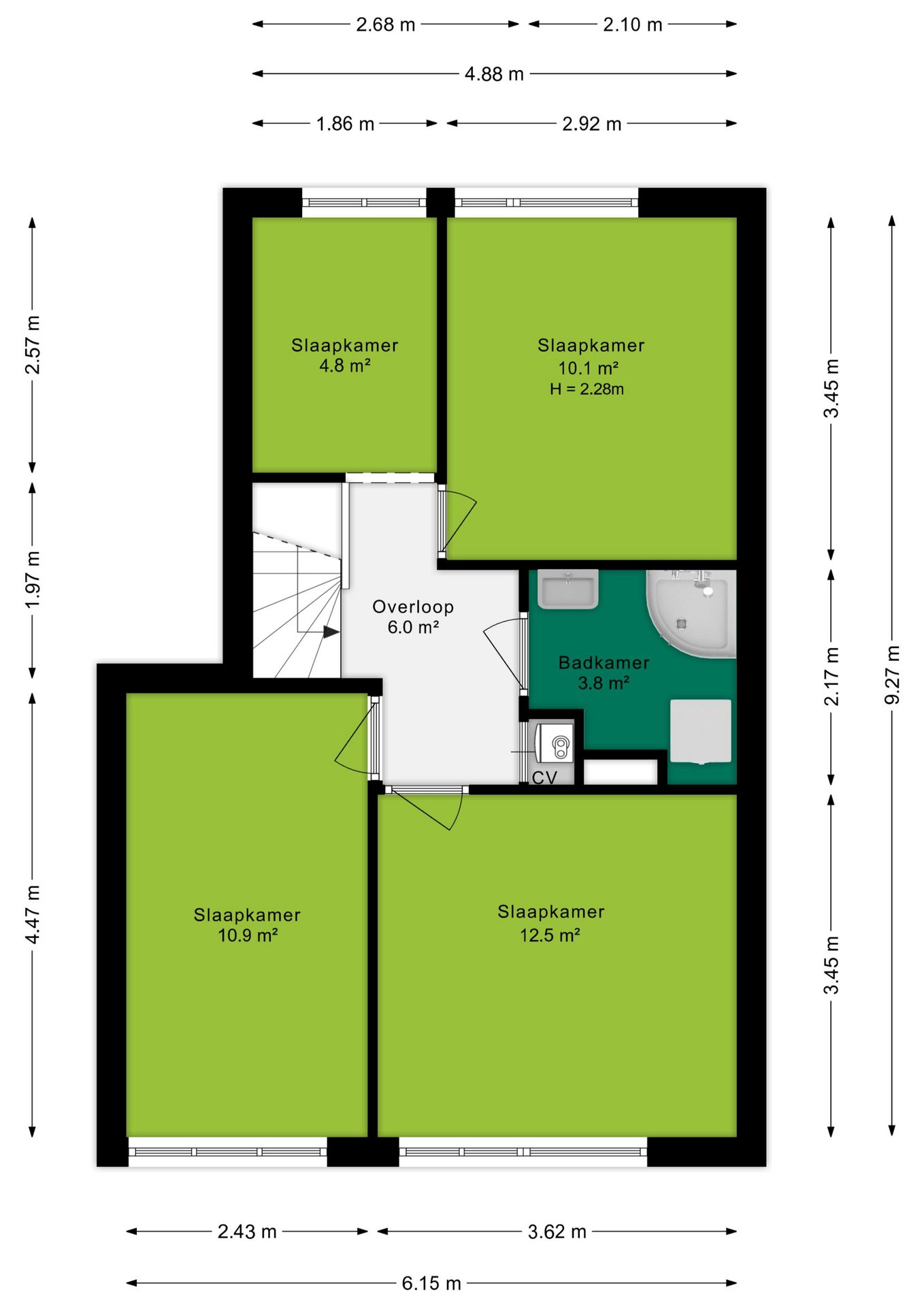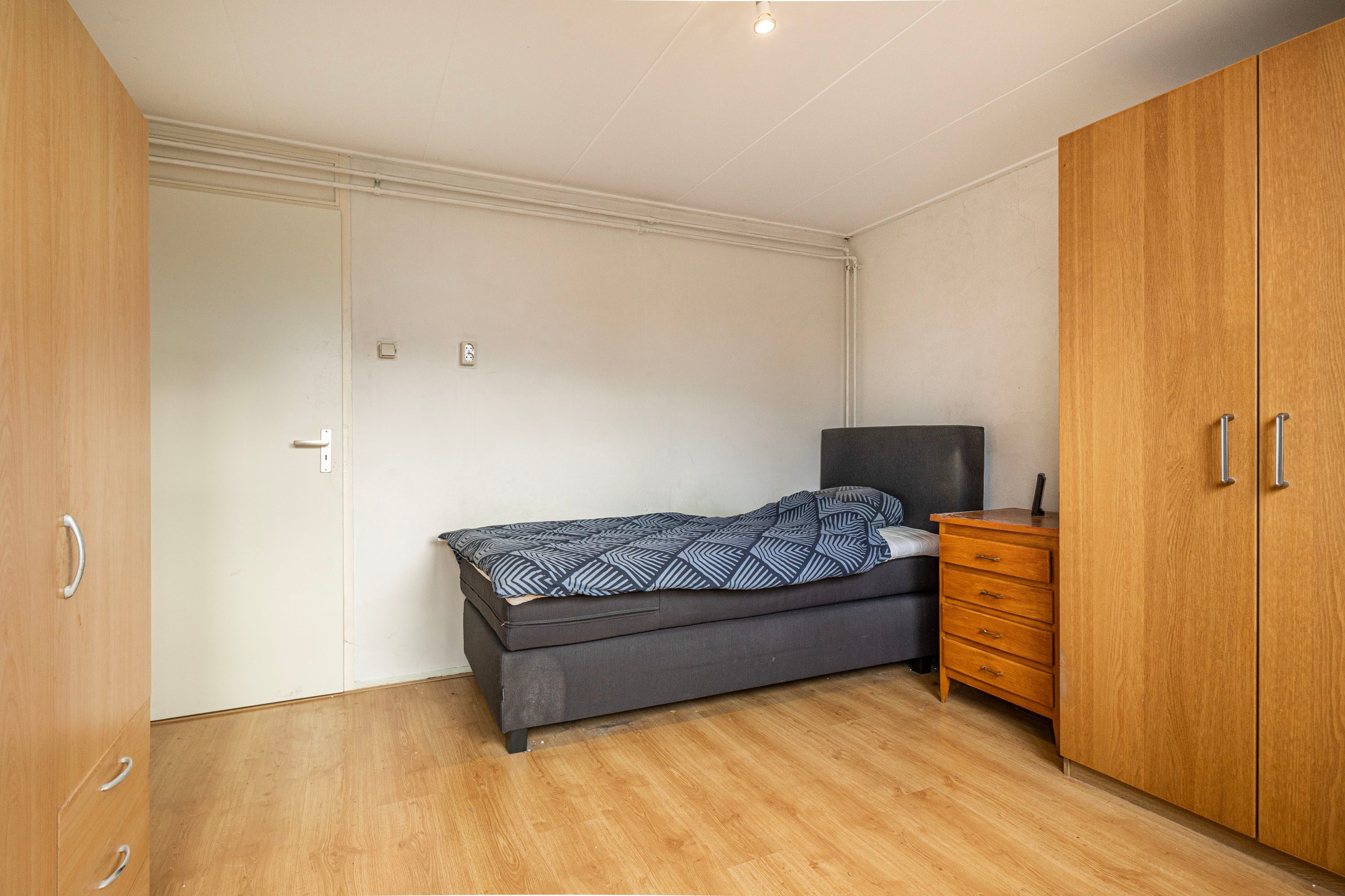 Op de bovenverdieping vind je vier kamers en een badkamer. Drie ruime kamers (circa 13 m², 11 m² en 10 m²) bieden veel mogelijkheden, terwijl de kleinere slaap-/werkkamer van circa 5 m² ideaal is voor een werkkamer of hobbyruimte. De badkamer, met een oppervlakte van ongeveer 4 m², is voorzien van een douche, wastafel en een wasmachineaansluiting. Op de overloop bevindt zich tevens een vaste kast met de C.V.-opstelling.