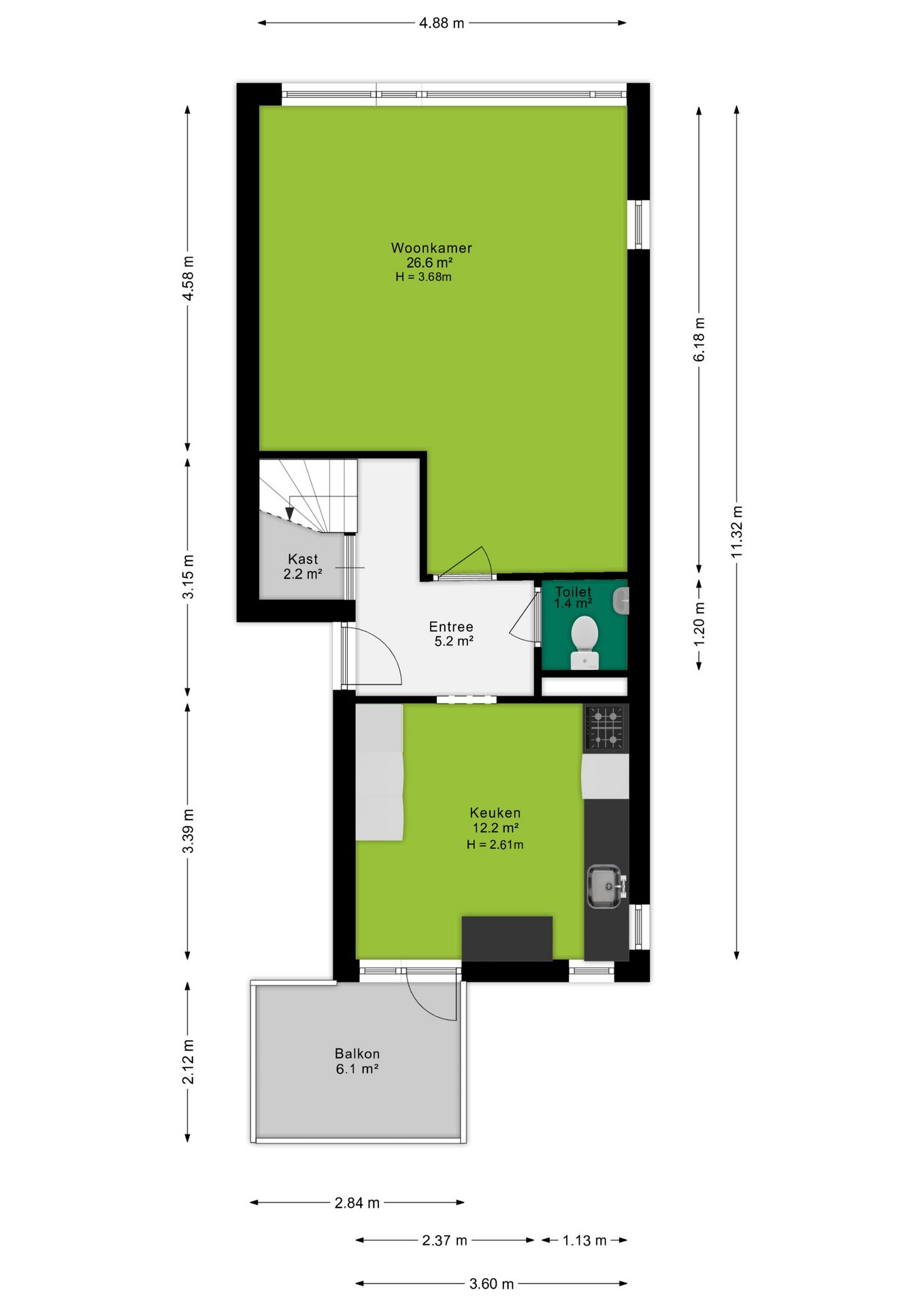 Via de entree is er toegang tot de woonkamer, keuken, trapkast, toilet en trapopgang naar de verdieping. De woonkamer heeft een oppervlakte van circa 27m², is voorzien van voldoende ruimte voor het plaatsen van een gezellige zithoek en eettafel. Aan de achterzijde bevindt zich de keuken, die je via een praktische loopdeur ook toegang geeft tot het balkon. De keuken heeft een eenvoudige opstelling en biedt met zijn 12 m² voldoende ruimte om jouw droomkeuken te realiseren. Het balkon, gelegen op het noordwesten en met ongeveer 6 m², is perfect om even buiten te genieten.