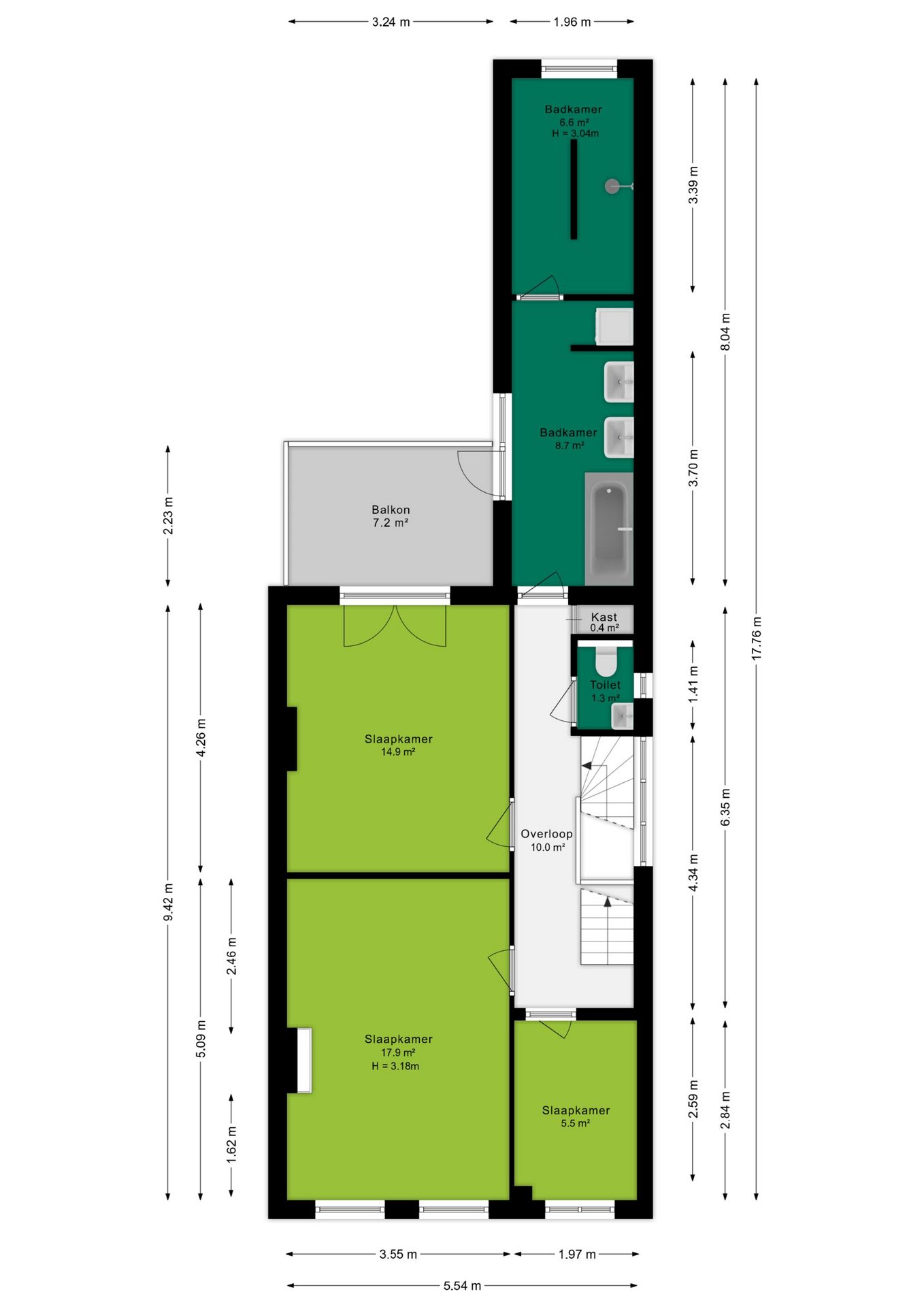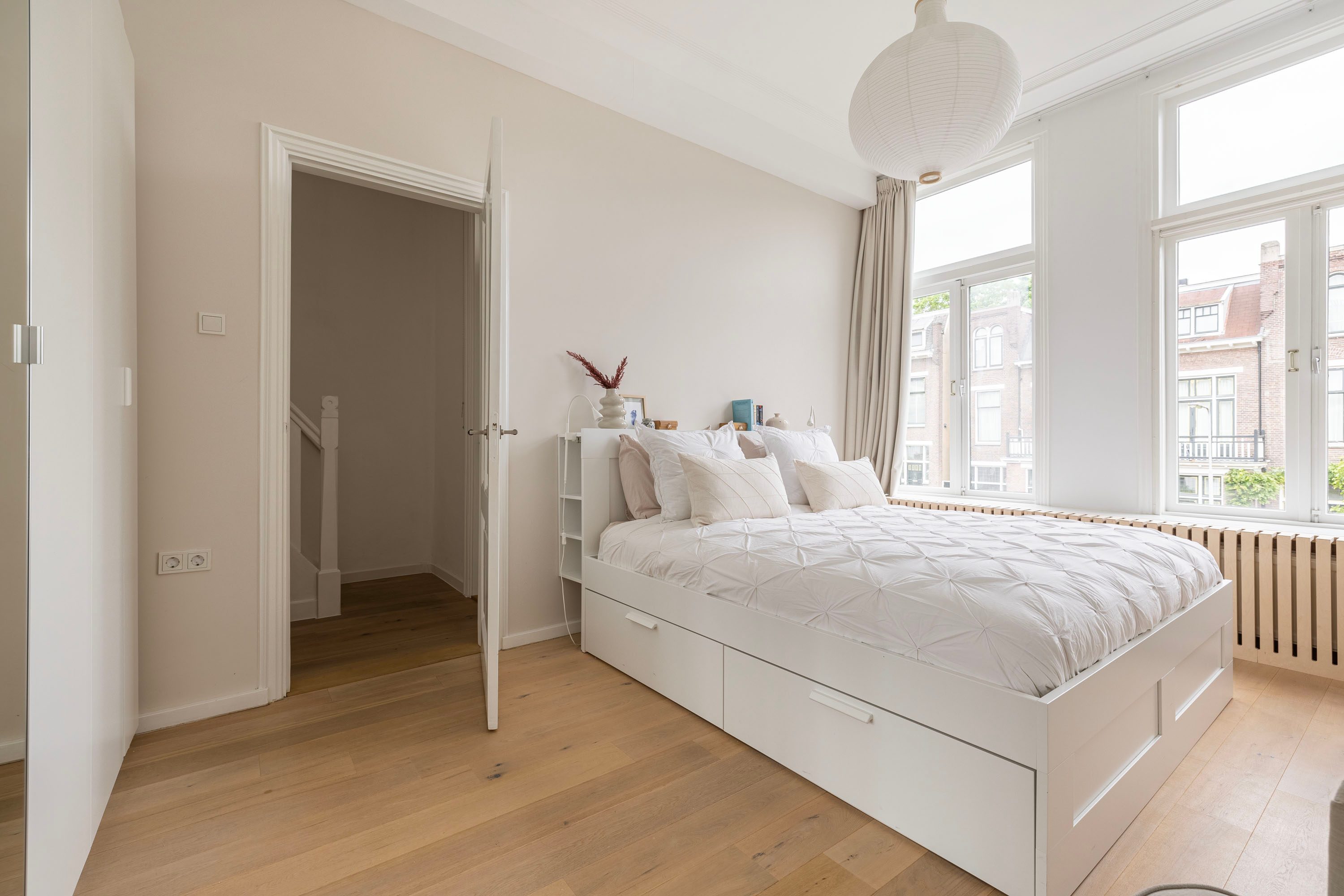 Hier bevinden zich drie slaapkamers en een royale badkamer. De grootste slaapkamer (ca. 18 m²) ligt aan de voorzijde van de woning en beschikt over hoge plafonds en authentieke ornamenten. Aan de achterzijde bevindt zich een tweede ruime slaapkamer (ca. 15 m²) met toegang tot een balkon. De derde kamer (ca. 6 m²) is perfect geschikt als kinderkamer, werkkamer of inloopkast. De zeer ruime badkamer is uitgevoerd met een ligbad, een tweezijdige inloopdouche met granieten vloer, een dubbele wastafel, vloerverwarming en aansluitingen voor wasmachine en droger. Op deze verdieping bevindt zich tevens een separaat toilet met fonteintje.