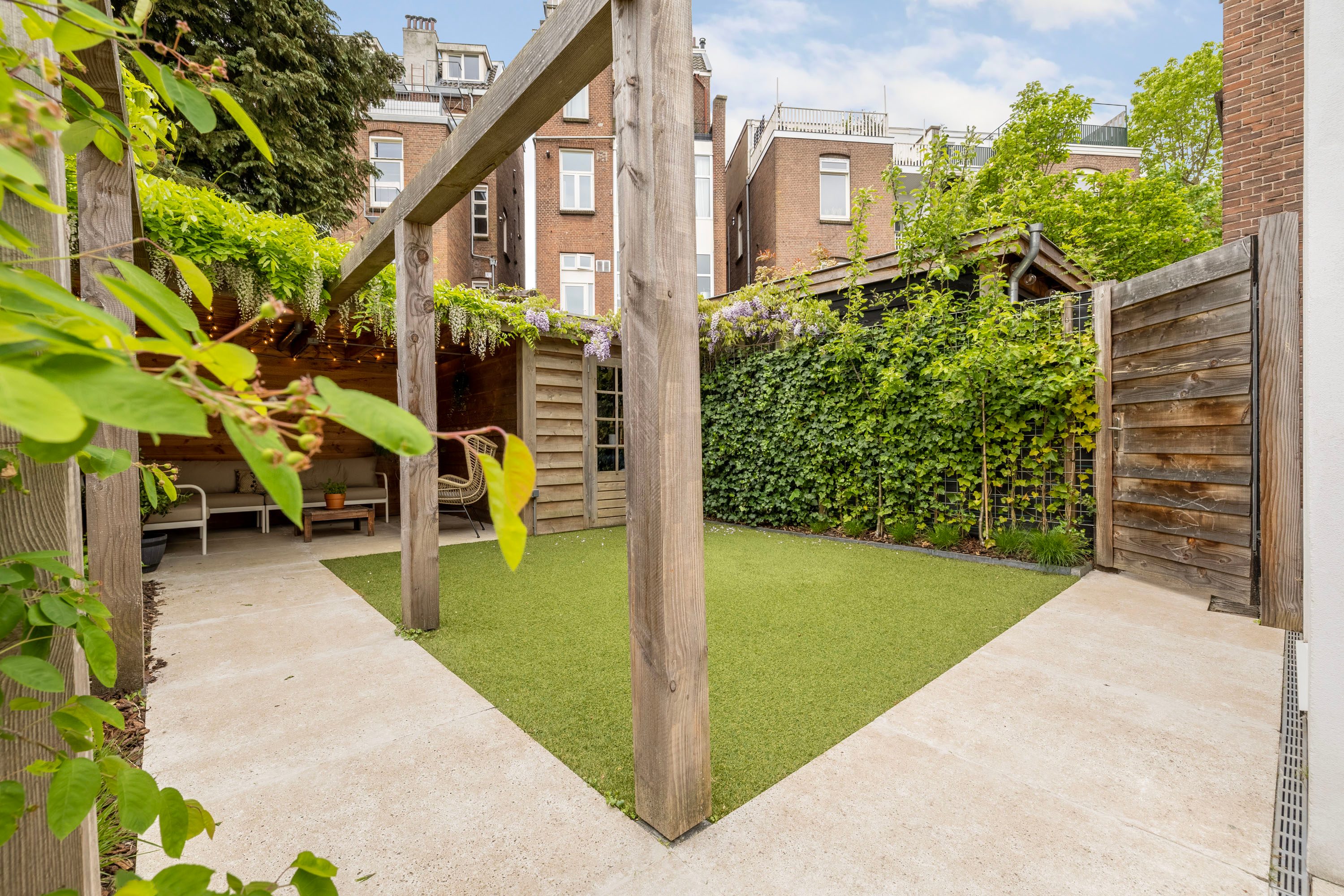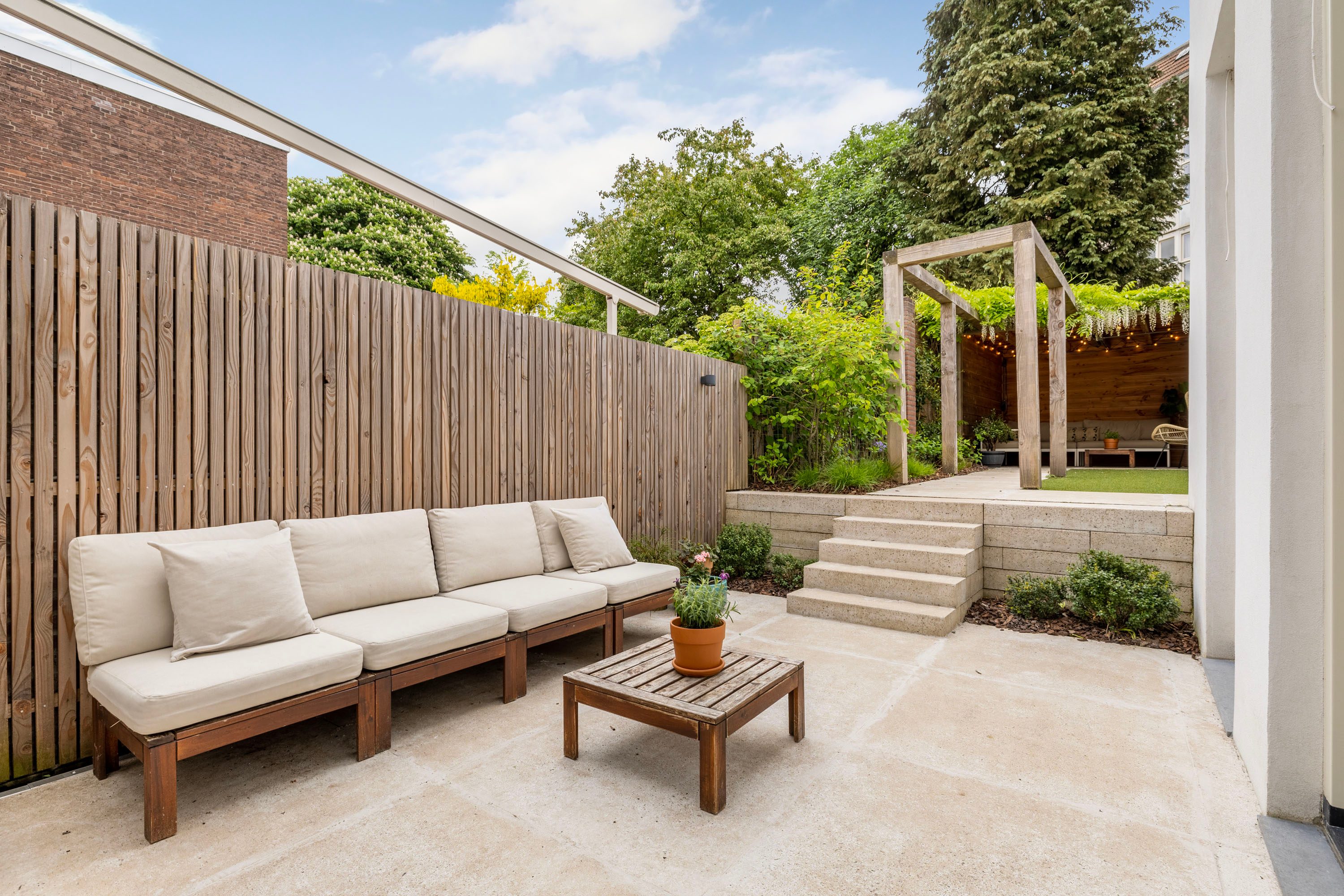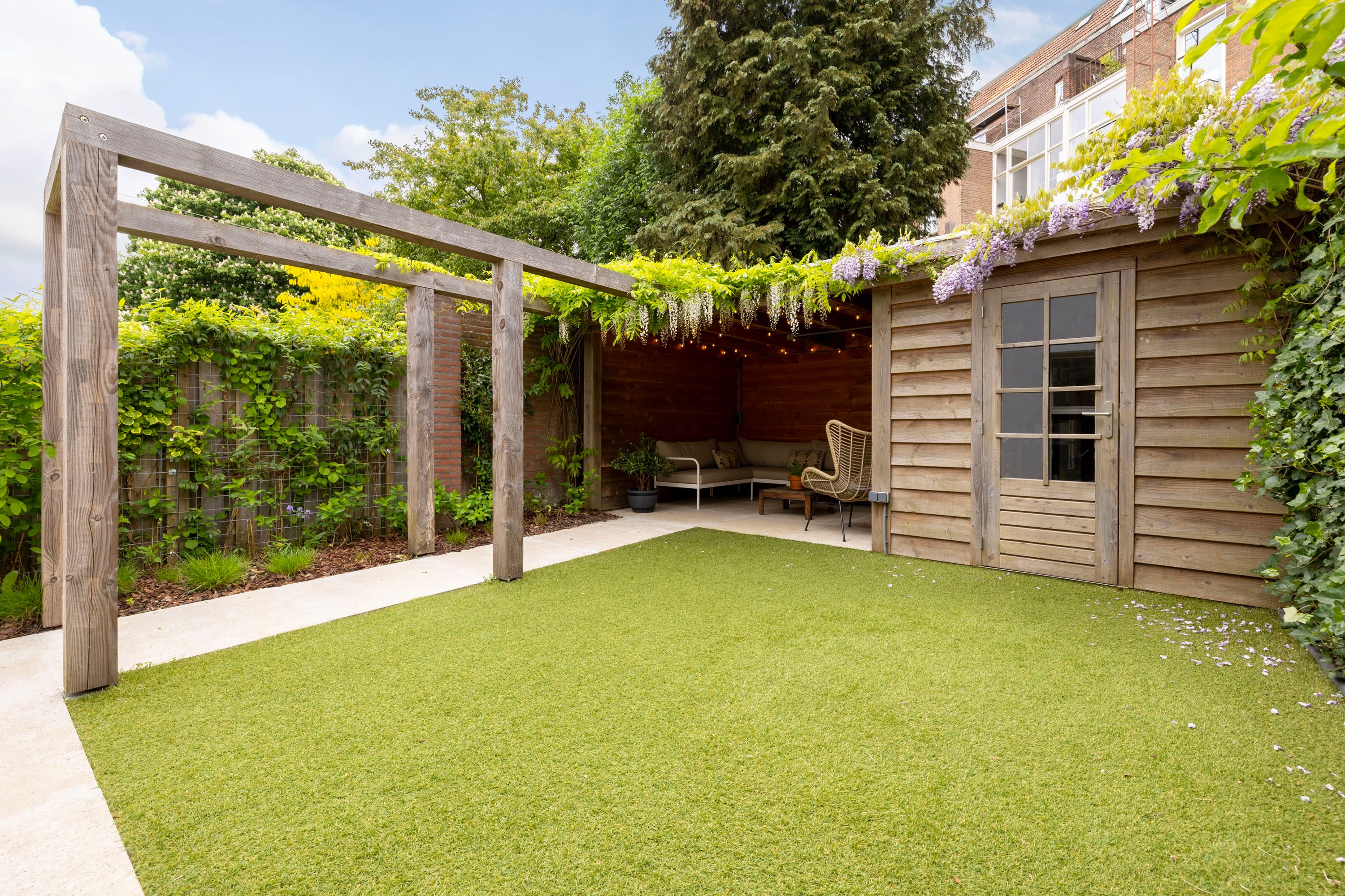 De fraai aangelegde tuin is in 2023 volledig vernieuwd en ligt perfect op het zuiden. Je vindt er een ruim terras, groene borders en achterin een sfeervolle veranda met een zitplek en een praktische berging. De tuin is ook bereikbaar via een handige achterom, met voldoende ruimte voor het stallen van fietsen en afvalcontainers. Aan de voorzijde beschikt de woning over een knusse, groene voortuin die zorgt voor een prettige buffer met de straat en extra sfeer.