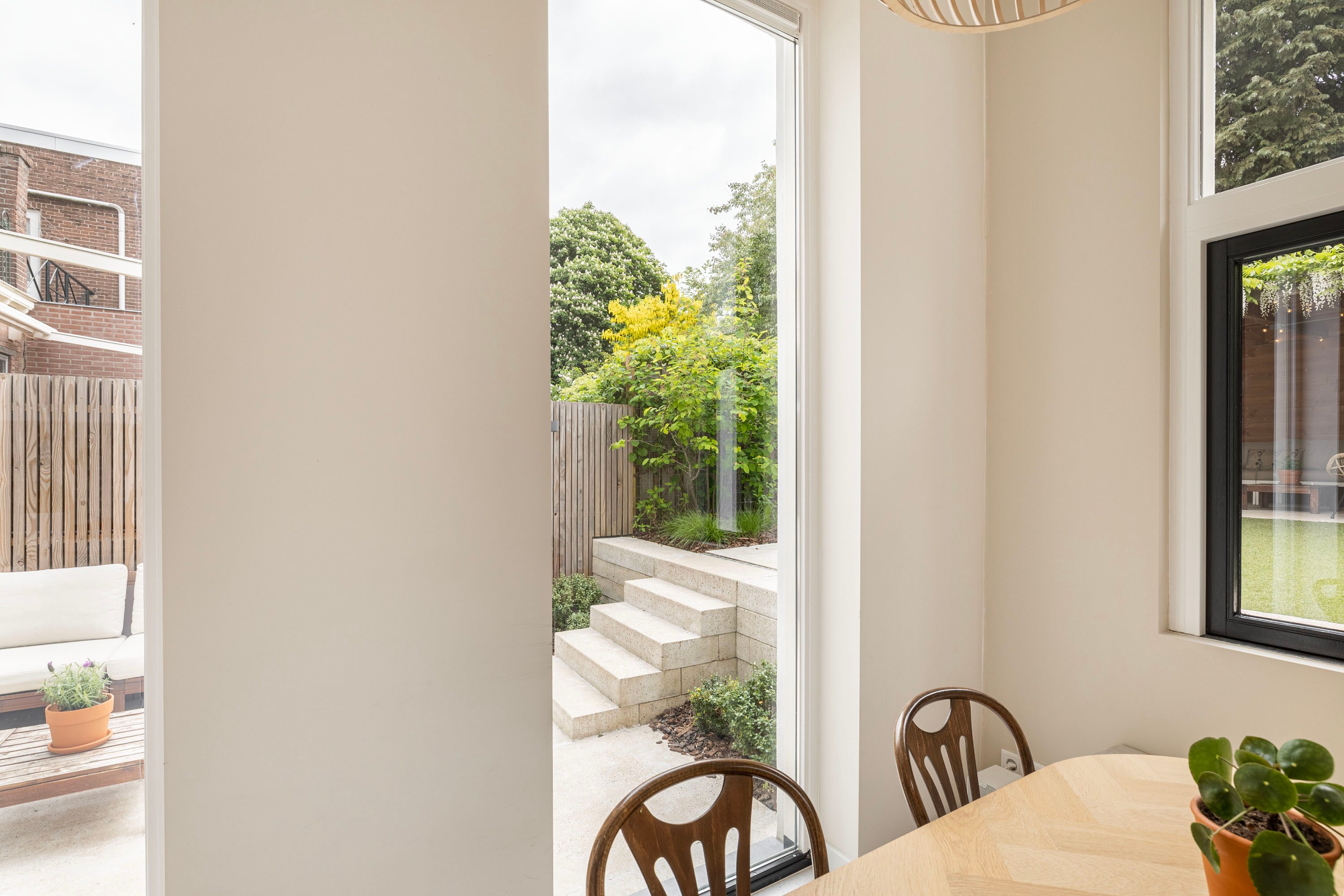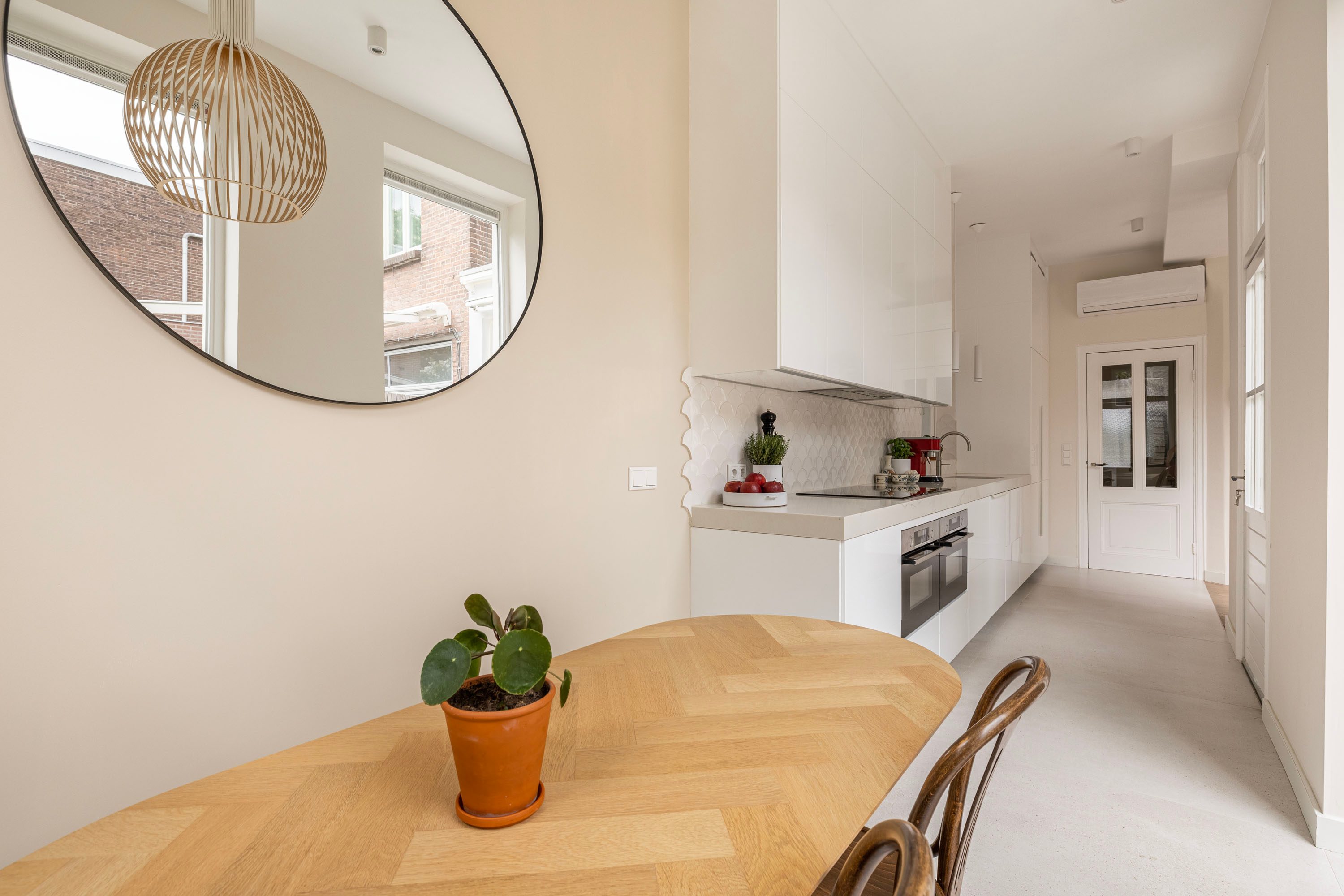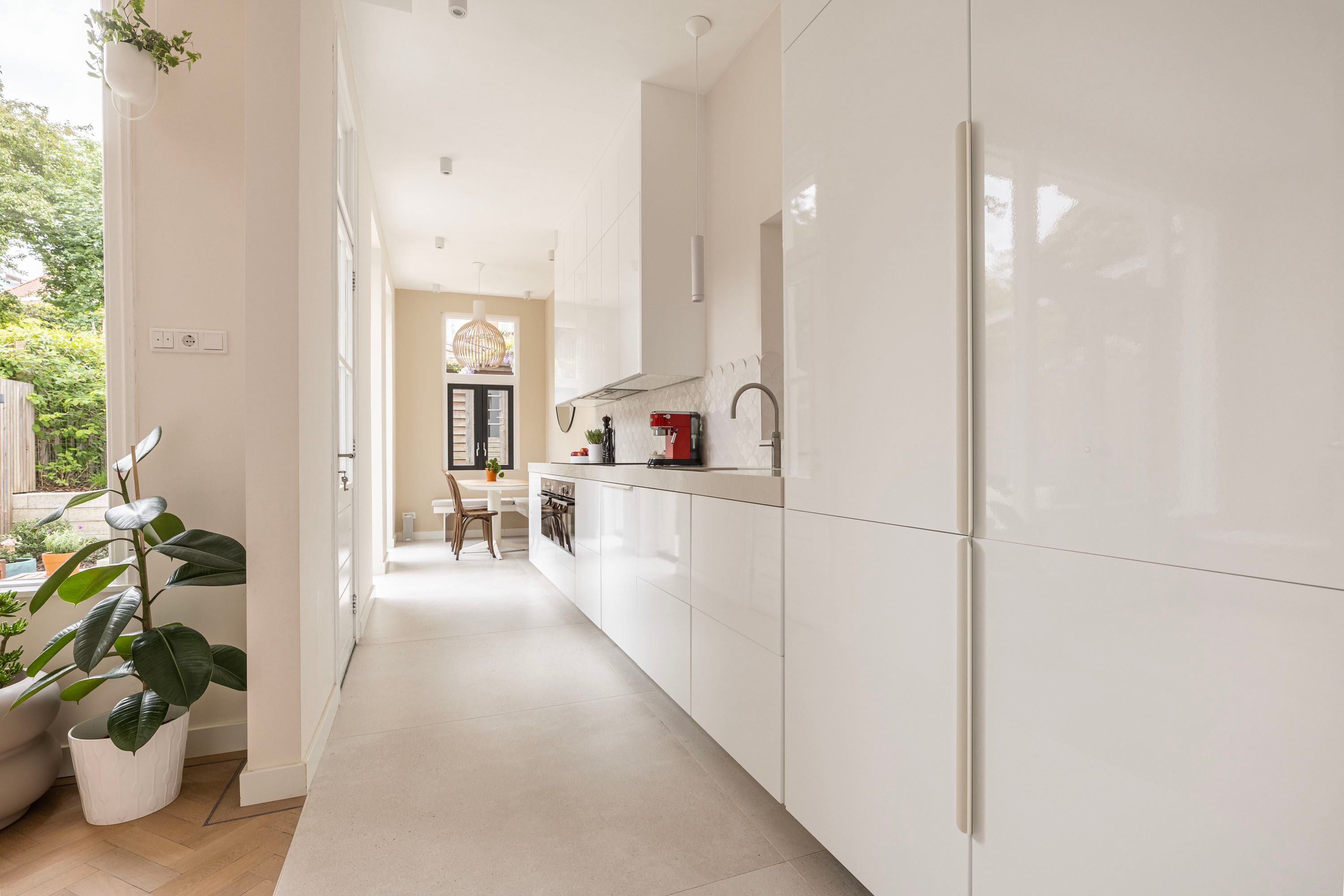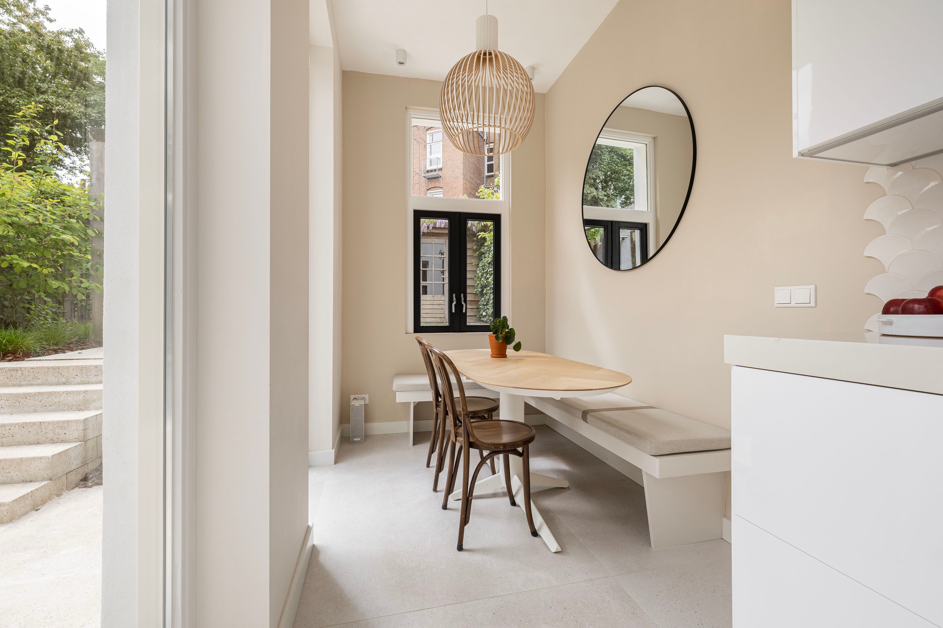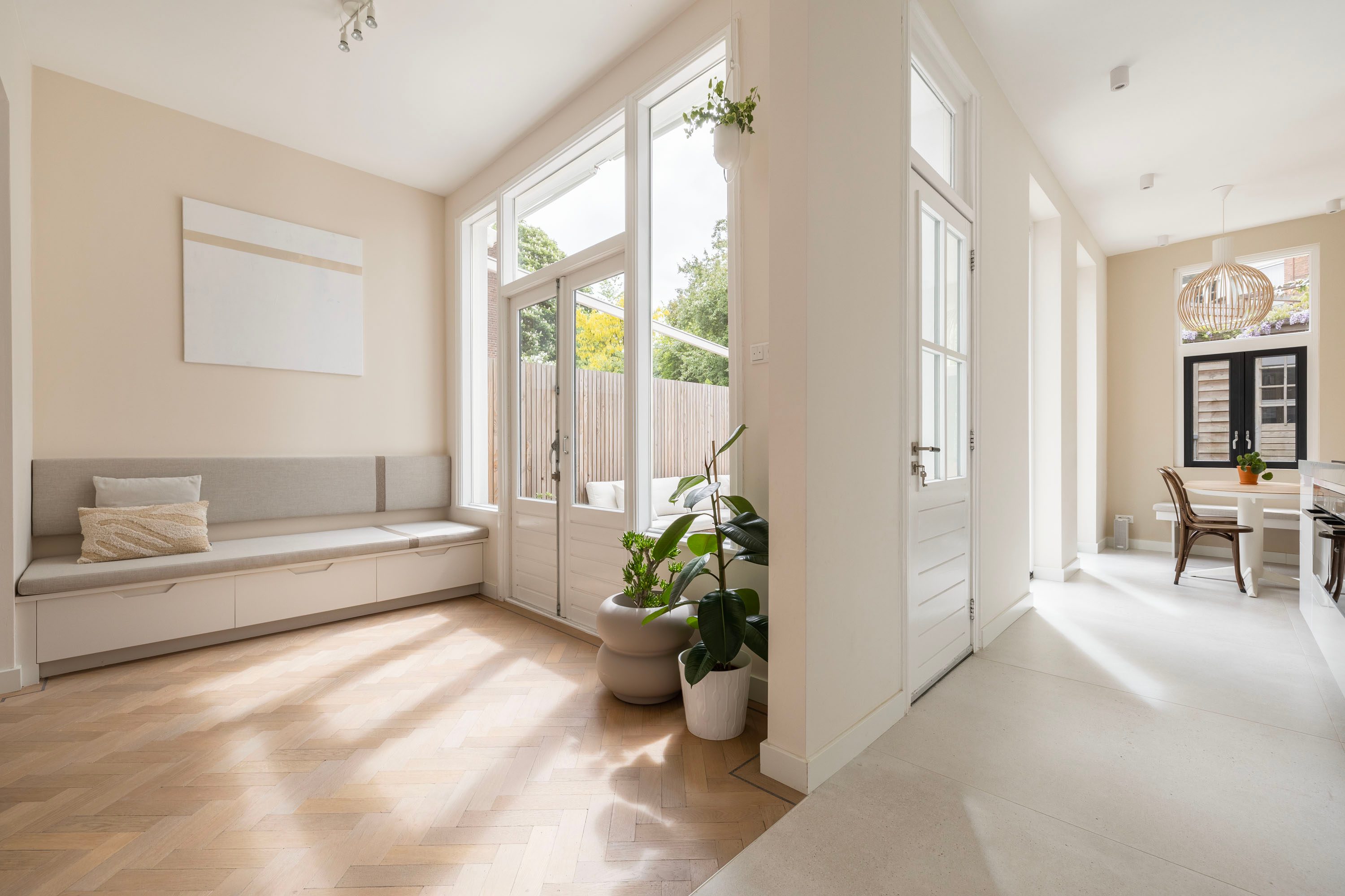 Entree via een vestibule met originele details en dubbele paneeldeuren naar de ruime hal met garderobe, trapopgang, modern toilet en toegang tot de kelder. De lichte en ruime woonkamer heeft een eiken visgraatvloer met vloerverwarming, hoge ornamentenplafonds en en-suite deuren naar de serre. Deze serre, met openslaande deuren naar de tuin, is ideaal als leeshoek of speelruimte. De open keuken (2021) is strak en modern en voorzien van hoogwaardige inbouwapparatuur, waaronder een Quooker, inductiekookplaat, combi-ovens, vaatwasser en dubbele koel-vriescombinatie – naadloos geïntegreerd in het ontwerp.