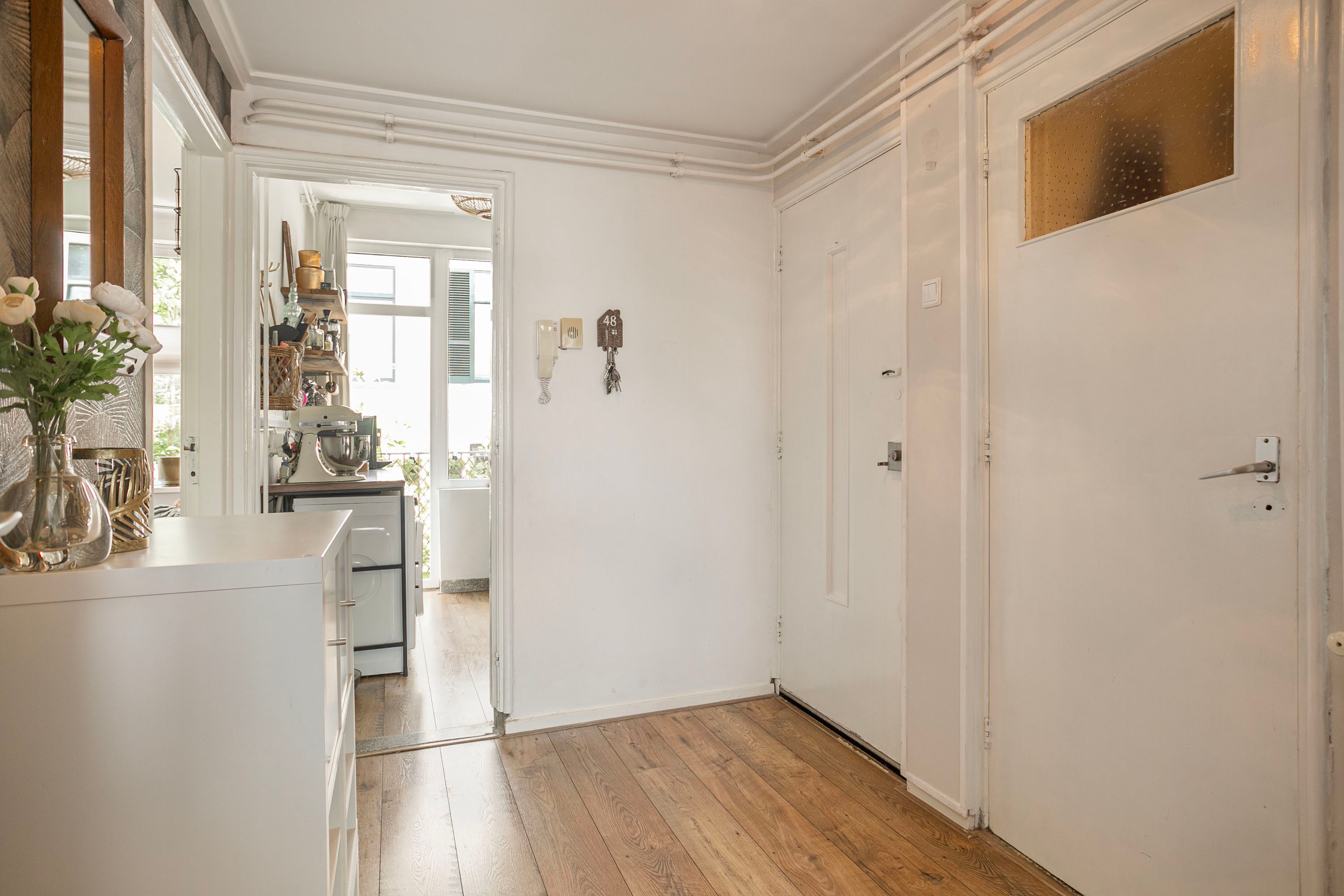 Gelegen op de eerste verdieping biedt deze woning een prettige en praktische indeling. De entreehal beschikt over een meterkast, intercominstallatie en ruimte voor een garderobe. De lichte en ruim opgezette woonkamer geeft toegang tot een balkon aan de achterzijde, ideaal om te genieten van de middag- en avondzon. De keuken is functioneel ingericht. De deurtjes, grepen, aanrechtbladen en spoelbak zijn in 2024 vernieuwd. Het kastje onder het linker aanrechtblad is ook in 2024 vernieuwd. Hier bevindt zich ook de aansluiting voor de wasmachine en toegang tot het tweede balkon aan de voorzijde, gelegen op het oosten. De woning beschikt over twee ruime slaapkamers, gelegen aan de rustige achterzijde van het complex. De badkamer is efficiënt ingedeeld en voorzien van een douche, wastafel en toilet.