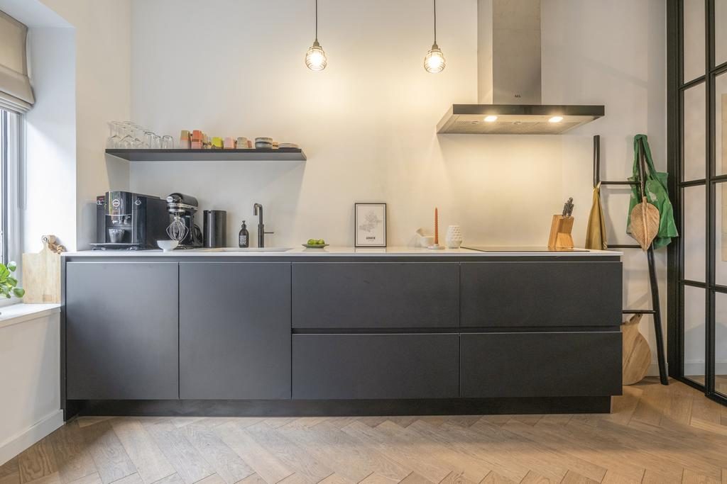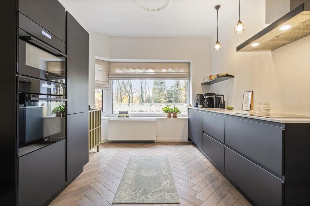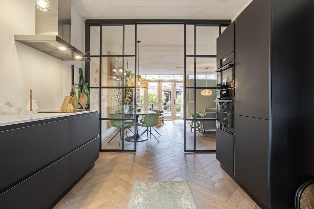 Via de entree met hal, meterkast en toilet bereik je de sfeervolle woonkamer. Deze heeft een afmeting van 29,5m², is voorzien van een visgraatvloer en heeft heerlijk veel lichtinval. Door de fijne afmeting is er ruimte genoeg voor een eettafel. De keuken kan afgesloten worden door middel van een gave stalen scheidingswand, die een chique uitstraling aan het geheel geeft. De moderne keuken is voorzien van de volgende inbouwapparatuur: een inductiekookplaat, afzuigkap, oven, combi-oven/magnetron, koel-vriescombinatie, vaatwasser en een Quooker.