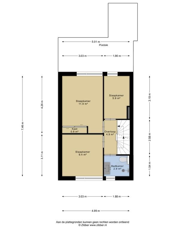 De overloop geeft toegang tot drie slaapkamers en de badkamer. De slaapkamers hebben een afmeting van 11,9m², 9,4m² en 5,9m², en zijn voorzien van een visgraatvloer en voldoende lichtinval. De grootste slaapkamer is voorzien van een ruime inbouwkast. De lichte badkamer is voorzien van inbouwspots, een inloopdouche, wastafelmeubel met waskom, handdoekradiator en toilet.