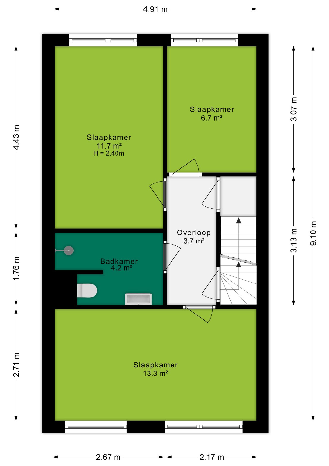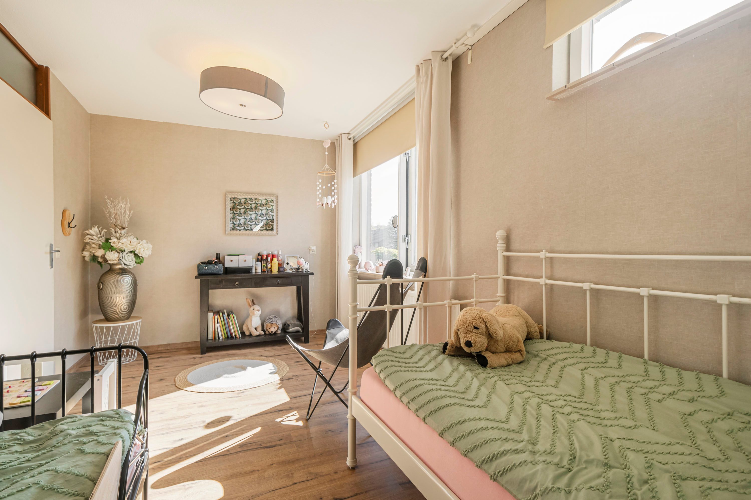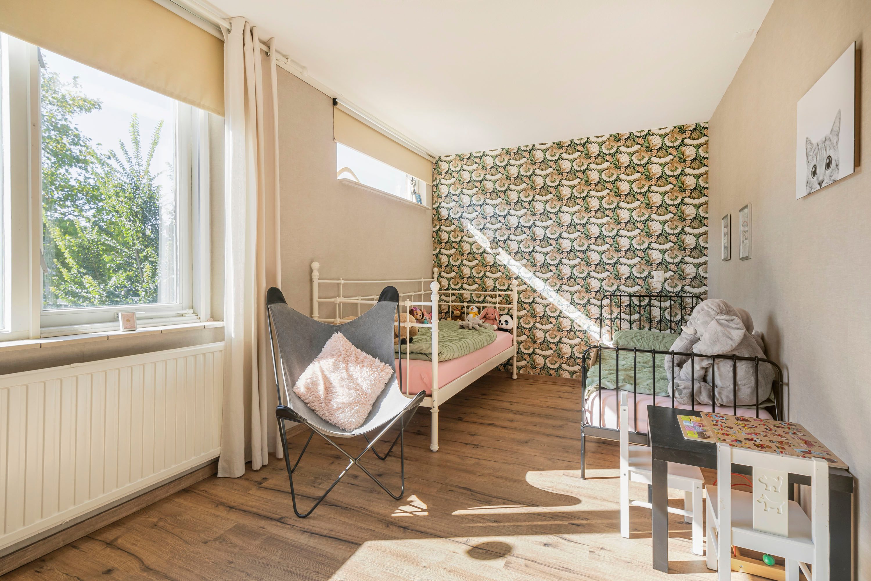 De overloop geeft toegang tot drie slaapkamers en de badkamer. De slaapkamers hebben goede afmetingen van circa 13m², 12m² en 7m² en zijn eveneens voorzien van een laminaatvloer. De grootste slaapkamer is gelegen aan de voorzijde van de woning en over de gehele breedte van de woning. De moderne badkamer (2022) is voorzien van een inloopdouche, wastafel en toilet.