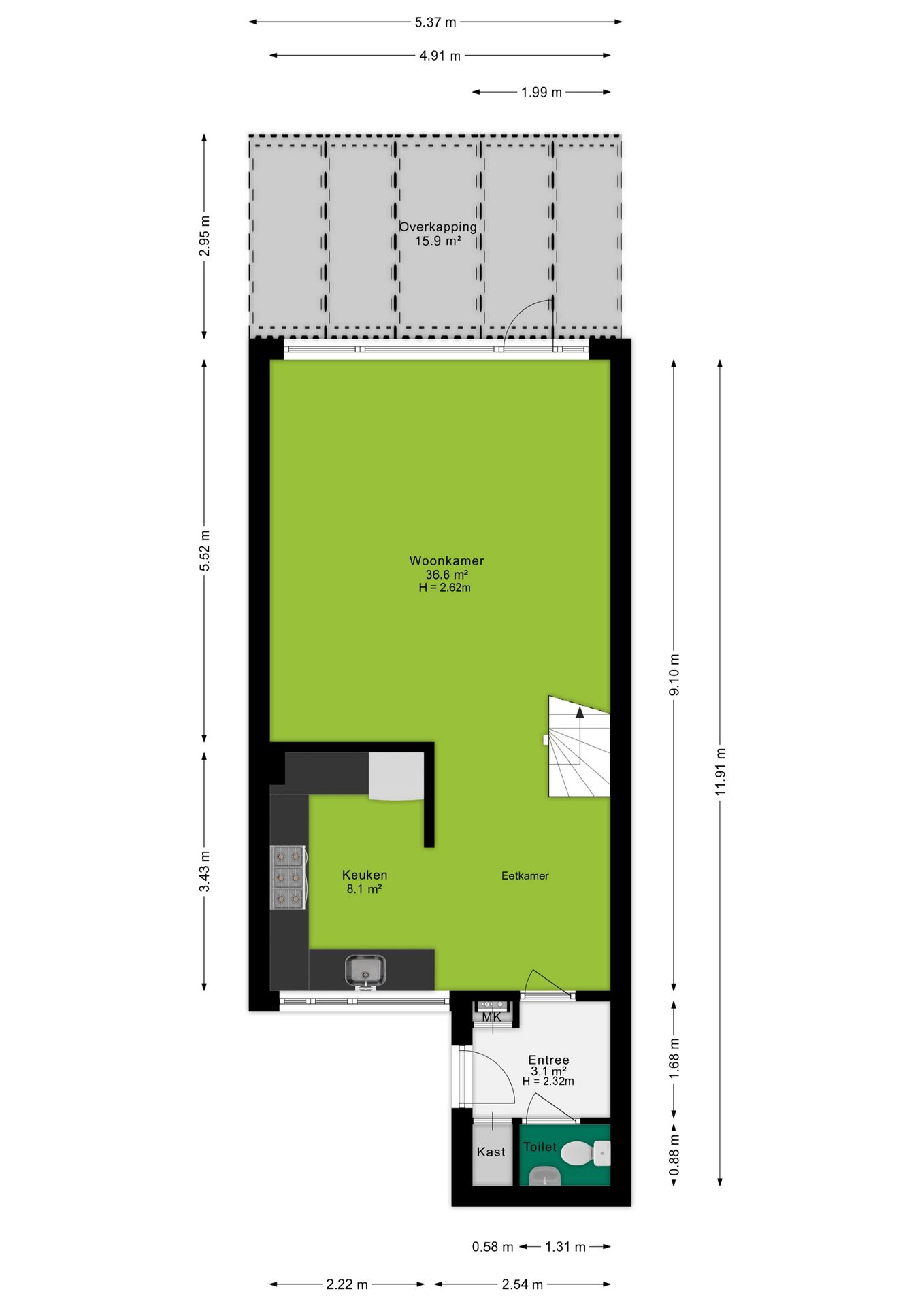 Via een ruime voortuin met eigen parkeerplaats en berging bereik je de woning. De hal met meterkast, berging en toilet geeft je toegang tot de keuken en woonkamer. De tuingerichte woonkamer heeft een oppervlakte van circa 37m², is voorzien van een laminaatvloer en heerlijk veel lichtinval door het grote raampartij. Via de tuindeur stap je de overkapping in, een ware verlenging van de woonkamer. De keuken in U vormige opstelling is voorzien van diverse gemakken, te weten: een 5 pits kookplaat, koel-vriescombinatie, oven en een vaatwasser.
