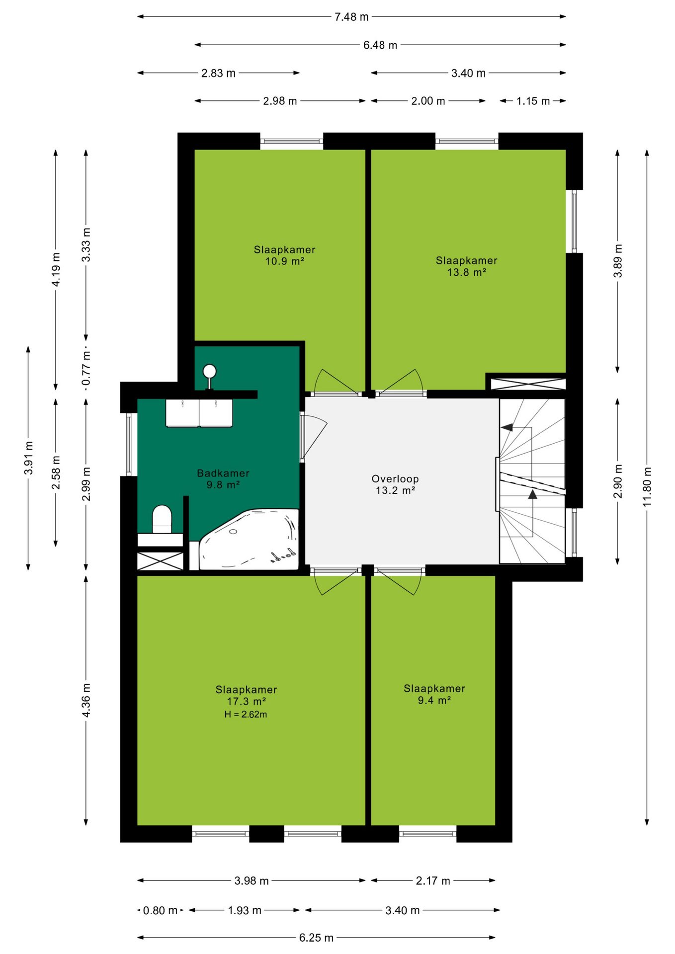 De ruime overloop geeft je toegang tot 4 slaapkamers en de 1e badkamer. De slaapkamers zijn goed bemeten met een oppervlakte van 17,3m², 13,8m², 10,9m² en 9,4m². De slaapkamers zijn voorzien van een PVC vloer en voldoende lichtinval. De zeer royale en complete badkamer is opgesteld in een moderne kleurstellig en voorzien van een luxe ligbad, inloopdouche, dubbele wastafel met wastafelmeubel en toilet. Tevens is er een raam aanwezig om te kunnen ventileren.