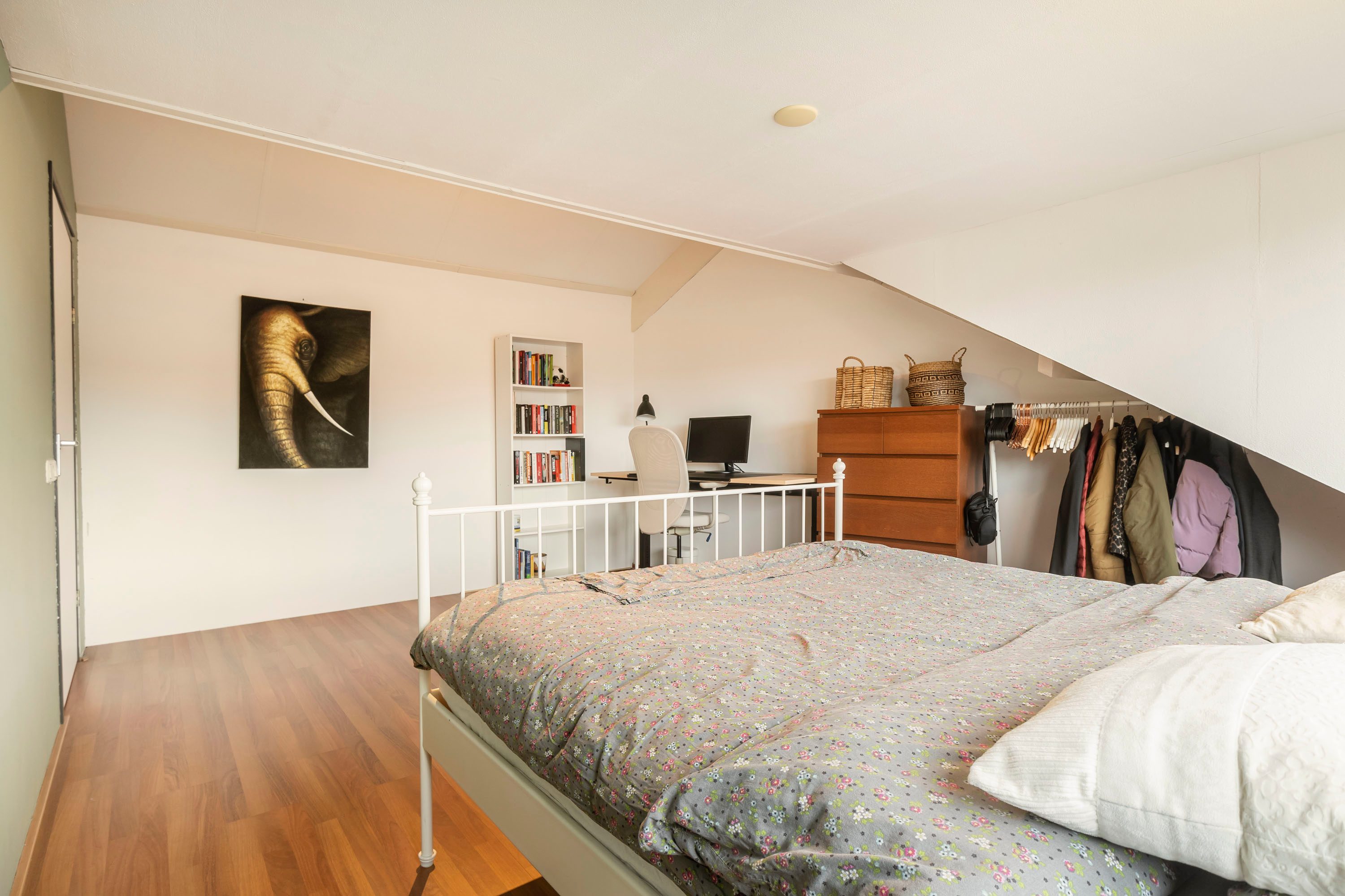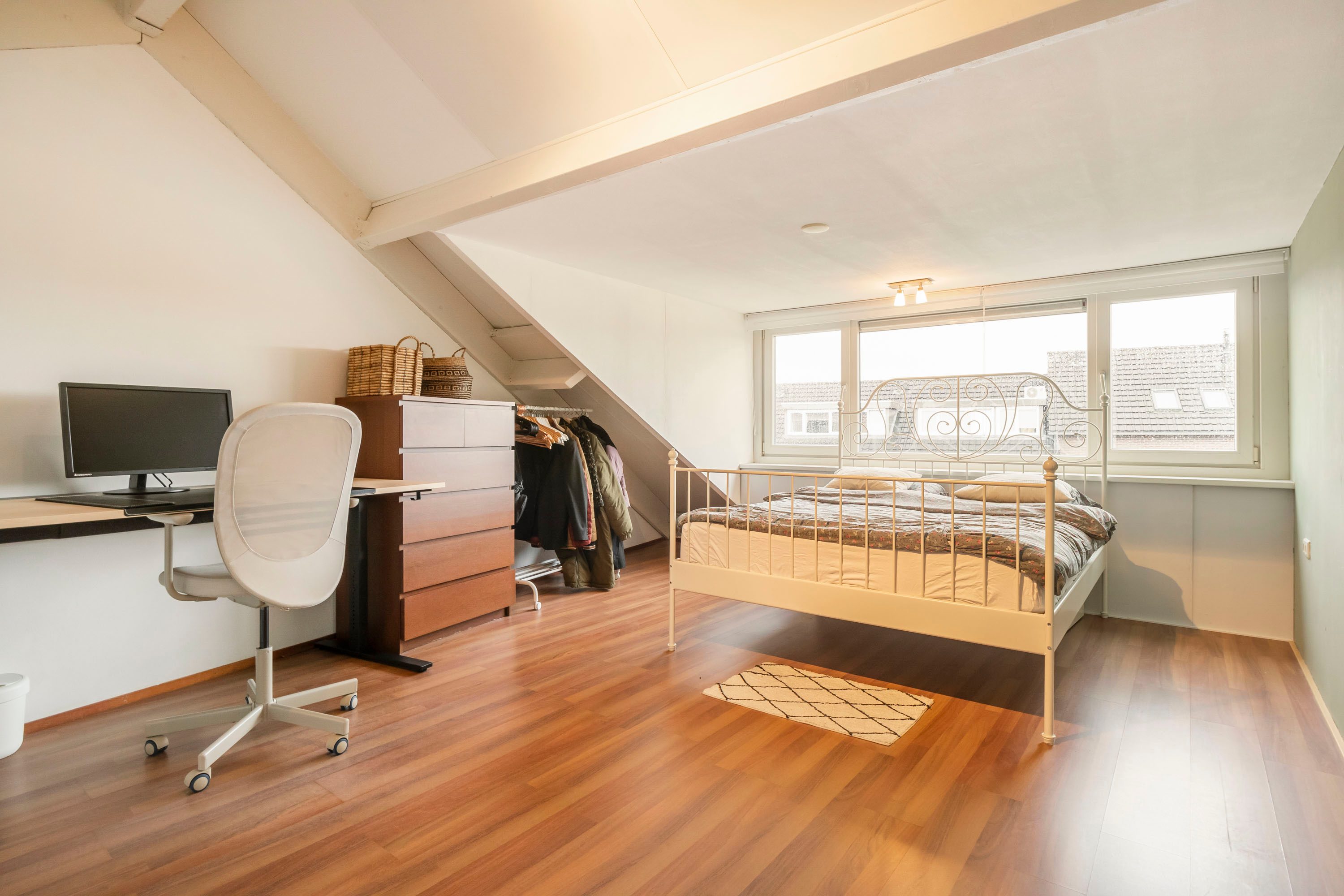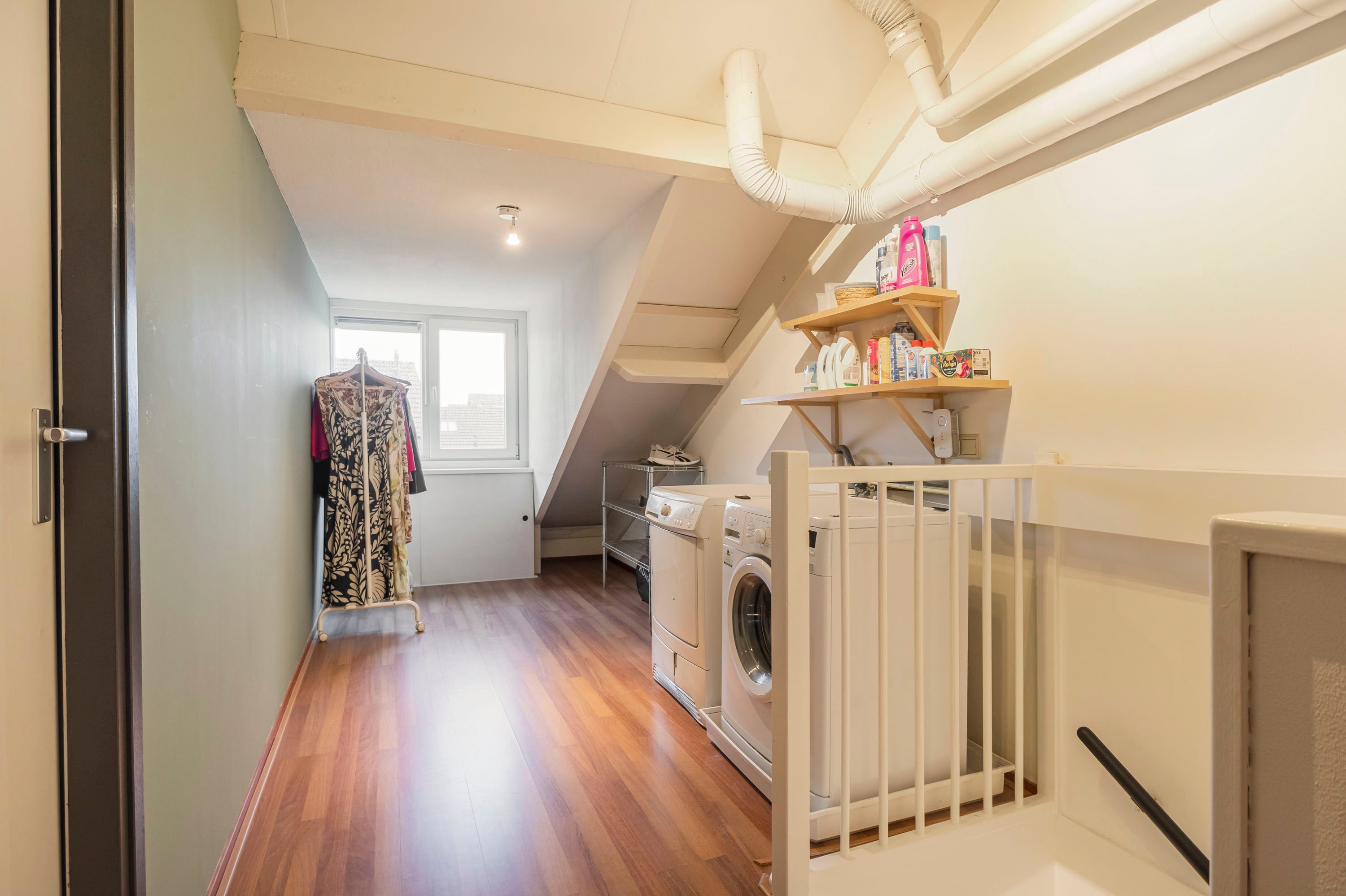 De tweede verdieping is praktisch ingedeeld en beschikt over een ruime overloop met een handige wasruimte. Op deze verdieping is een vierde slaapkamer gerealiseerd, voorzien van een dakkapel die zorgt voor extra licht en ruimte. Onder de schuine kanten is extra bergruimte aanwezig, ideaal voor het opbergen van seizoensspullen.