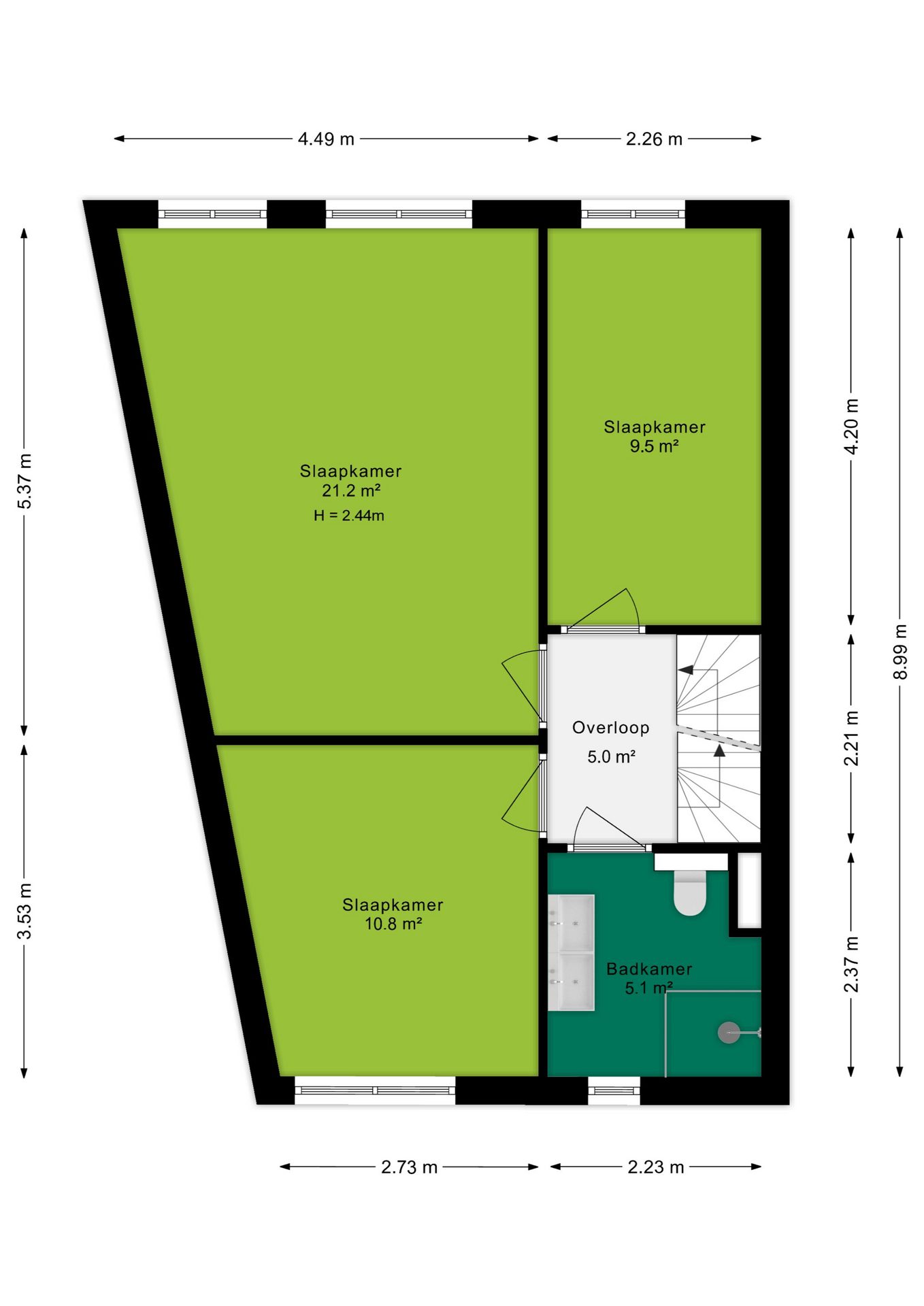 Op de eerste verdieping bevinden zich drie ruime slaapkamers. De grootste slaapkamer ligt aan de achterzijde (ca. 21 m²) en biedt volop ruimte voor een groot bed en een kastopstelling. Aan de achterzijde bevindt zich tevens een tweede slaapkamer (ca. 9,5 m²) en aan de voorzijde een derde slaapkamer (ca. 11 m²). De badkamer (2023) is modern afgewerkt en uitgerust met een inloopdouche, dubbele wastafel en een tweede toilet.