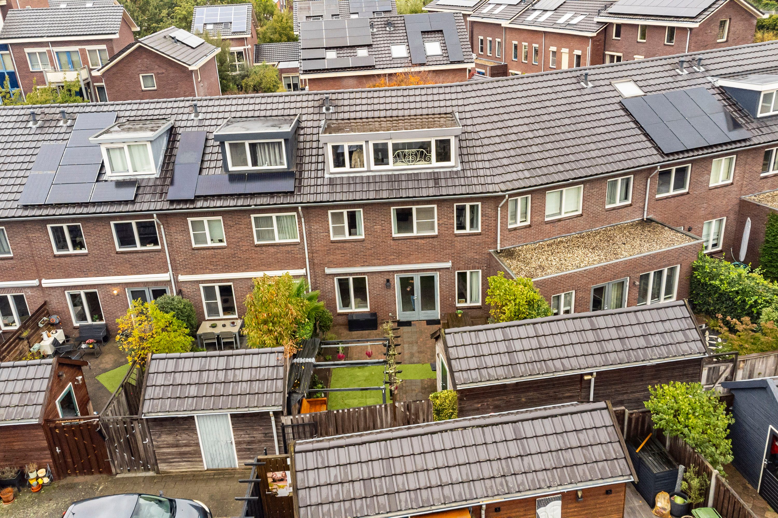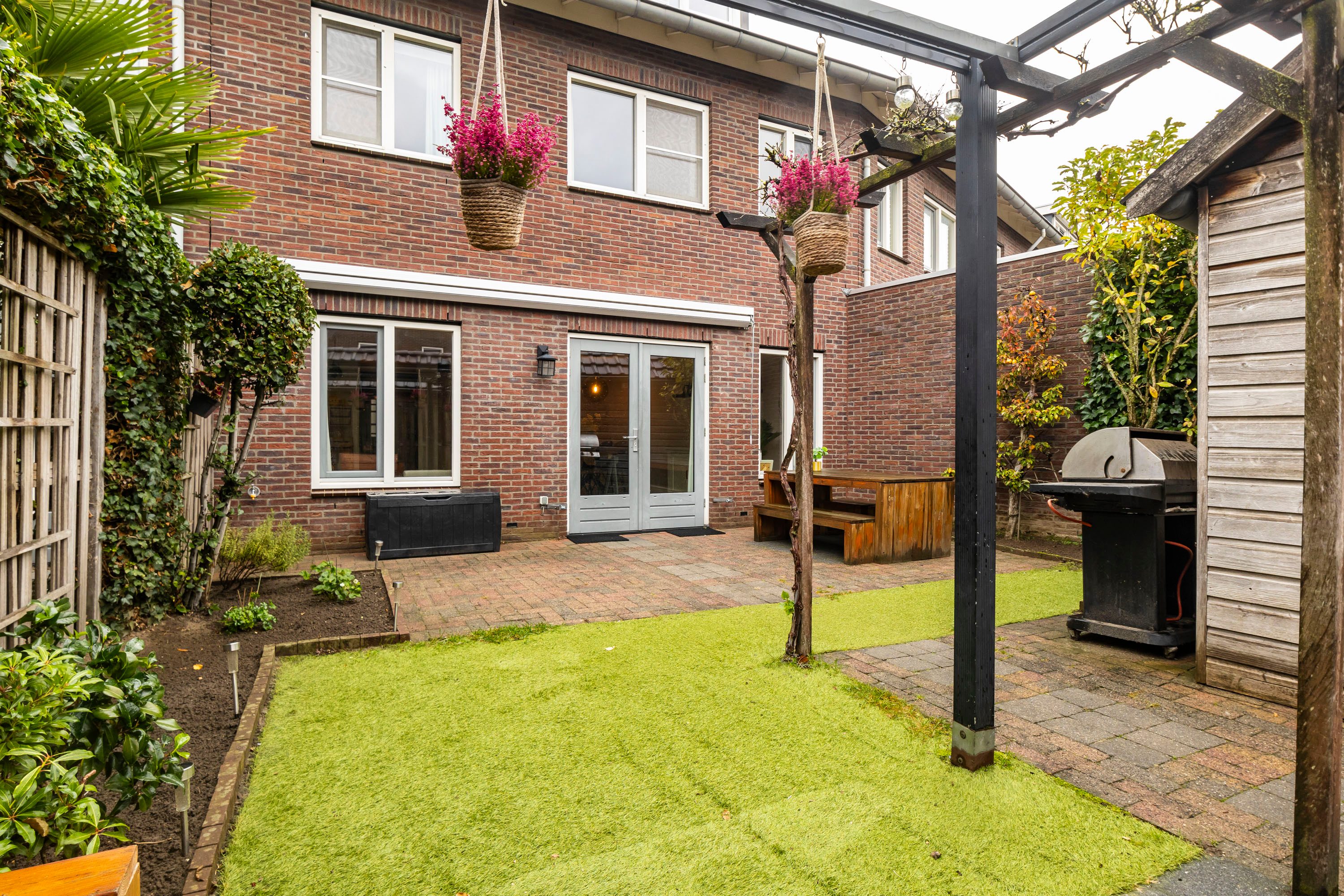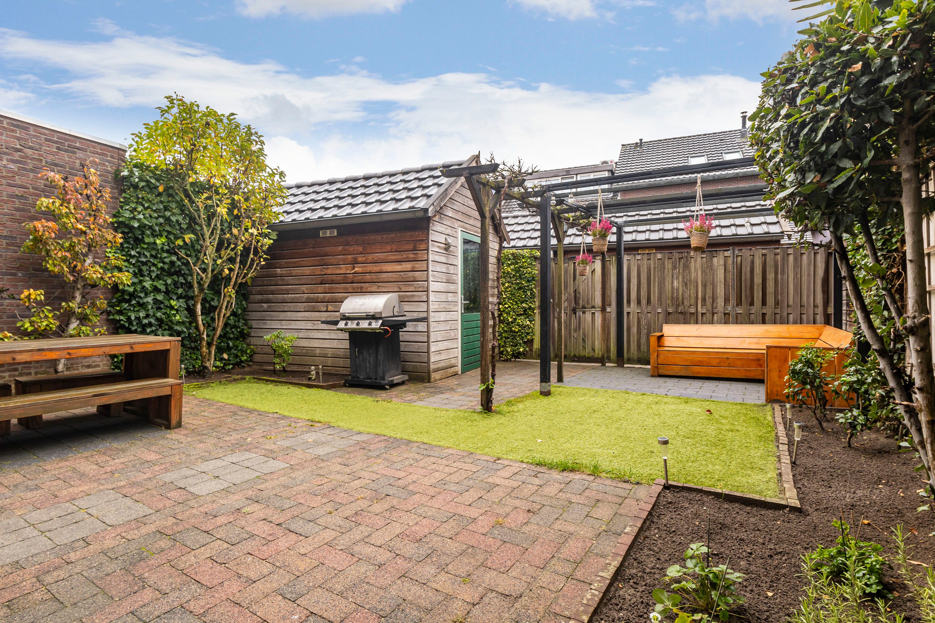 De achtertuin op het zuiden is een heerlijke plek om te ontspannen. De tuin is onderhoudsvriendelijk aangelegd met een gezellige loungehoek en groene borders. Hier geniet je volop van de zon, of het nu gaat om een lange zomeravond of een barbecue met familie en vrienden. Achterin de tuin staat een houten berging (ca. 10 m²), perfect voor fietsen, tuinspullen en kinderspeelgoed. Via de achterom is de tuin ook van buitenaf bereikbaar.