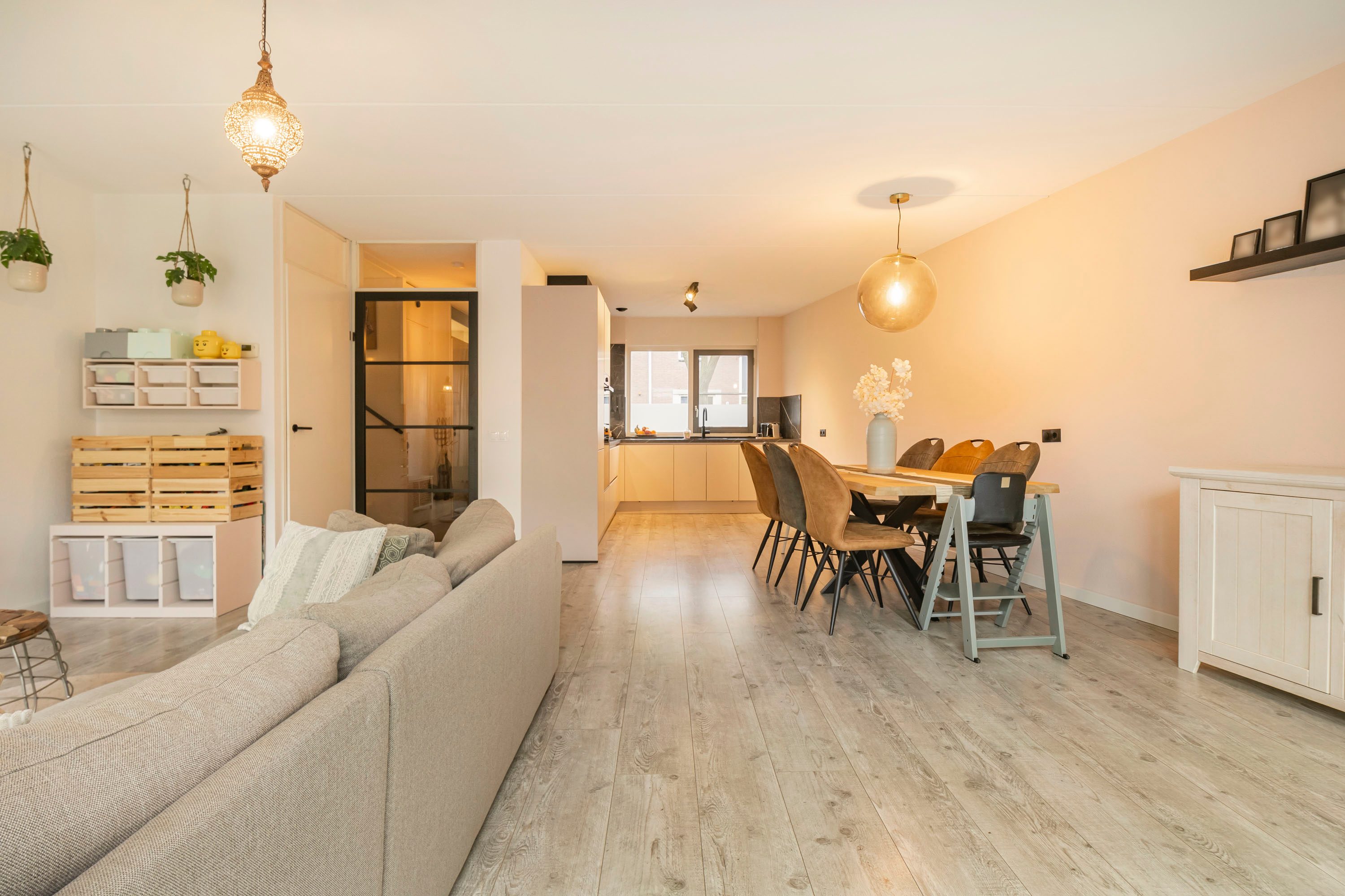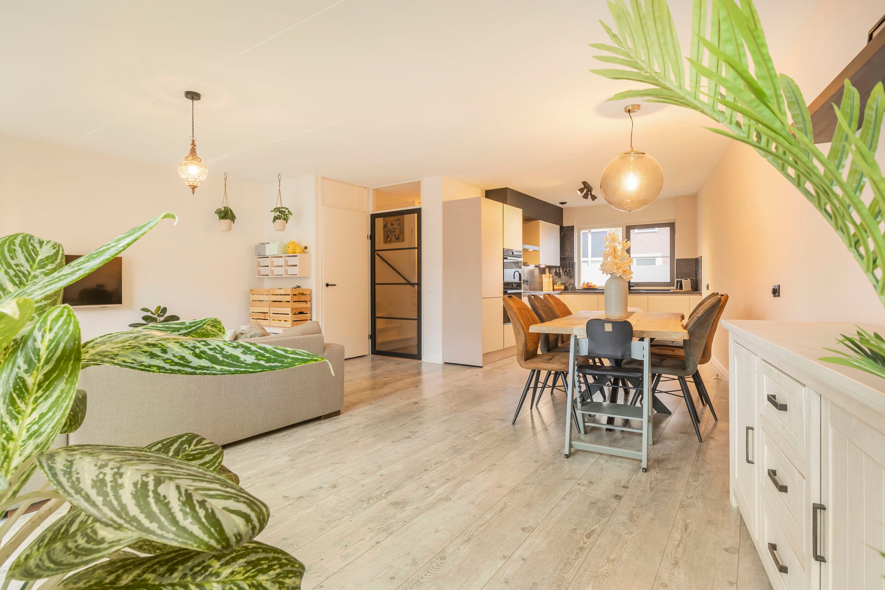 Bij binnenkomst wordt je direct verwelkomd door de moderne afwerking, waaronder recent vernieuwde binnendeuren. Vanuit de hal bereik je het moderne toilet, de meterkast en de trap naar de eerste verdieping. De lichte en ruime woonkamer, voorzien van vloerverwarming, heeft een prettige indeling met voldoende ruimte voor een gezellige zithoek en een ruime eettafel. Dankzij de openslaande deuren ontstaat er een naadloze verbinding met de zonnige achtertuin, zodat je op zomerse dagen optimaal van het buitenleven kunt genieten. Aan de voorzijde beschikt de woning over een open keuken voorzien van een hoekkeuken met ingebouwde apparatuur waaronder een inductie kookplaat, afzuigkap, oven, combi-oven, koelkast, vriezer, vaatwasser en een Quooker. Bovendien geniet de gehele begane grond van de aangename warmte van de vloerverwarming, wat bijdraagt aan een heerlijk gevoel van comfort.