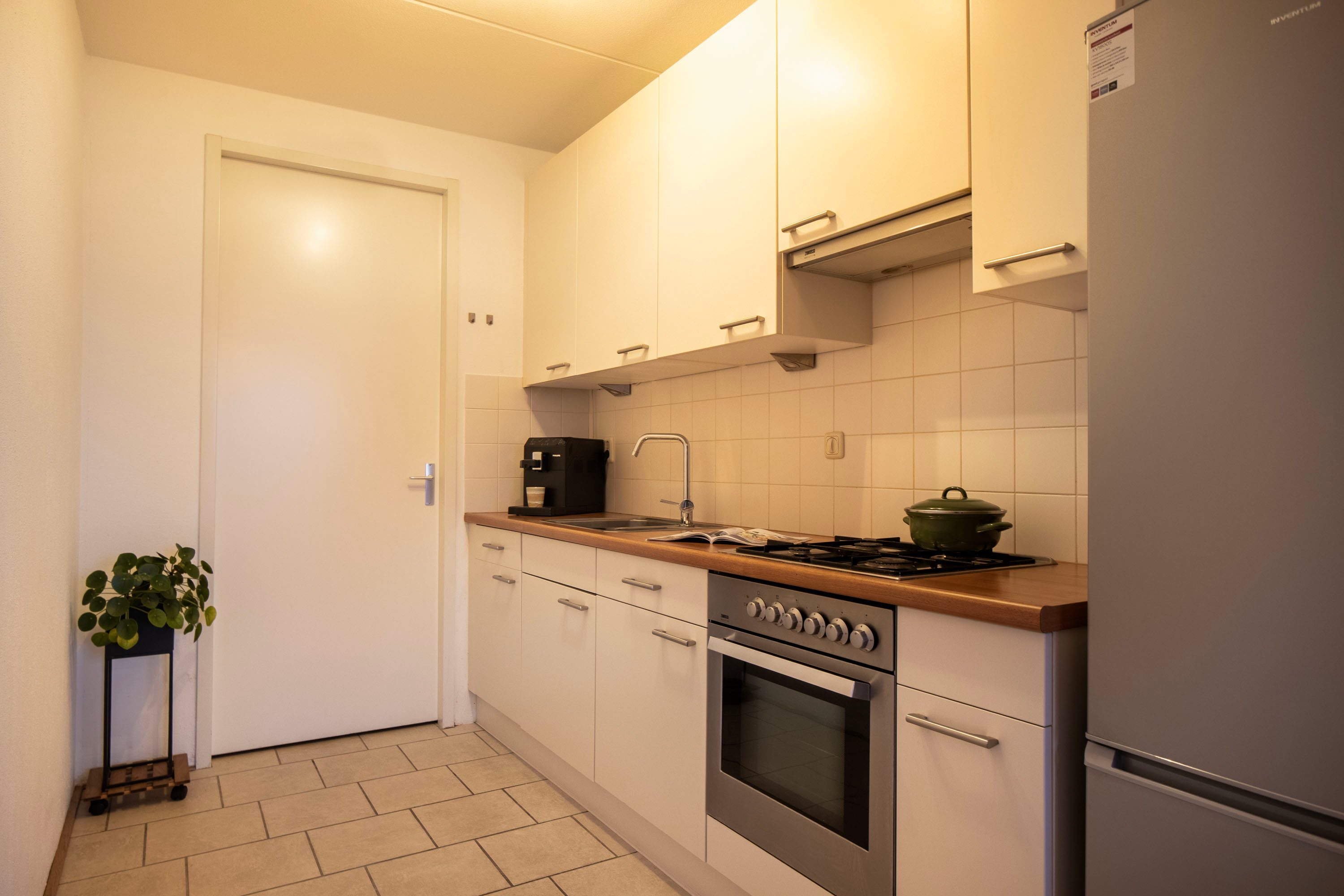 Aansluitend ligt de keuken, die is voorzien van veel kastruimte en uitgerust met een gasfornuis, afzuigkap, oven en vaatwasser. Vanuit de keuken heb je toegang tot de praktische berging met de cv-ketel en wasmachineaansluiting.