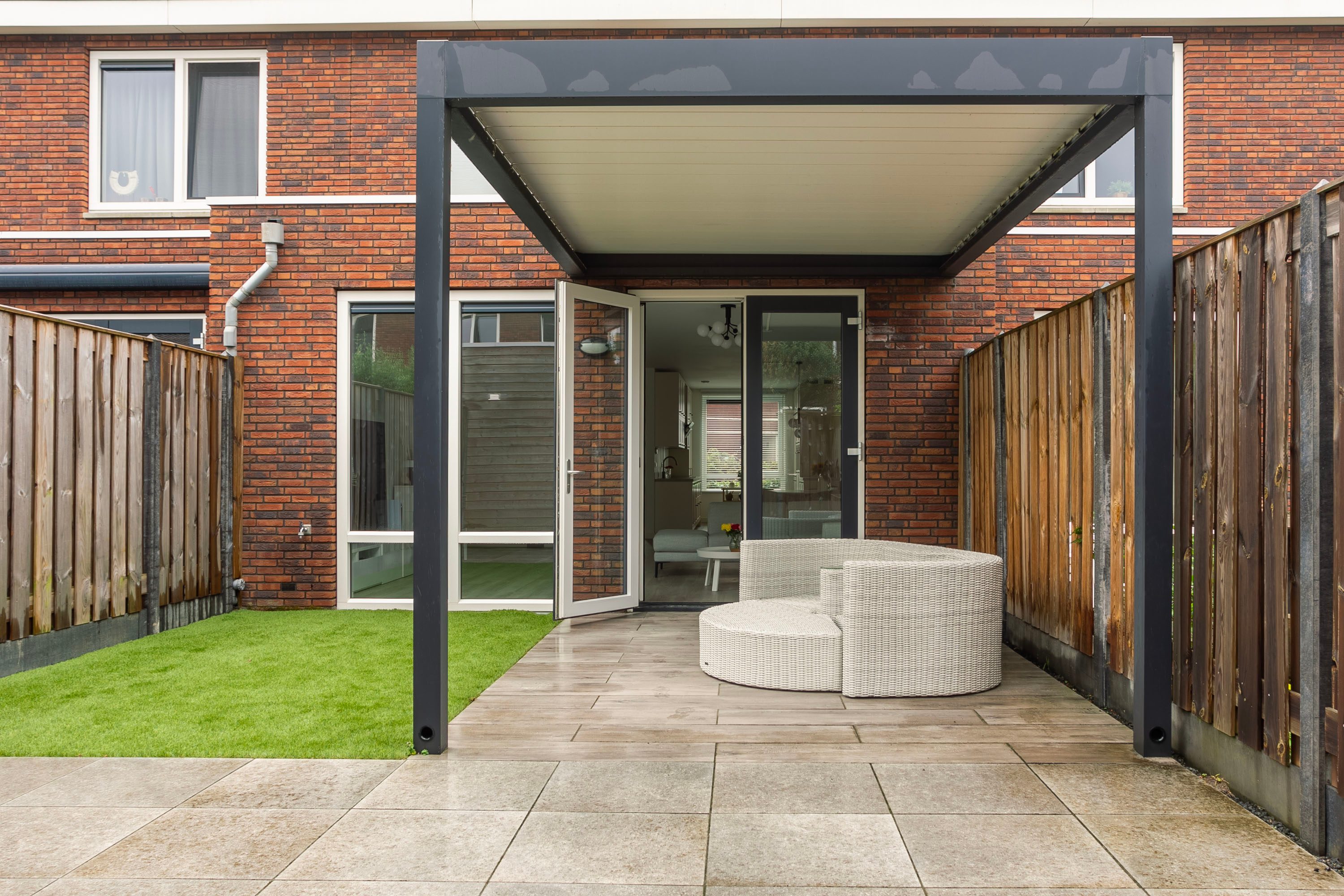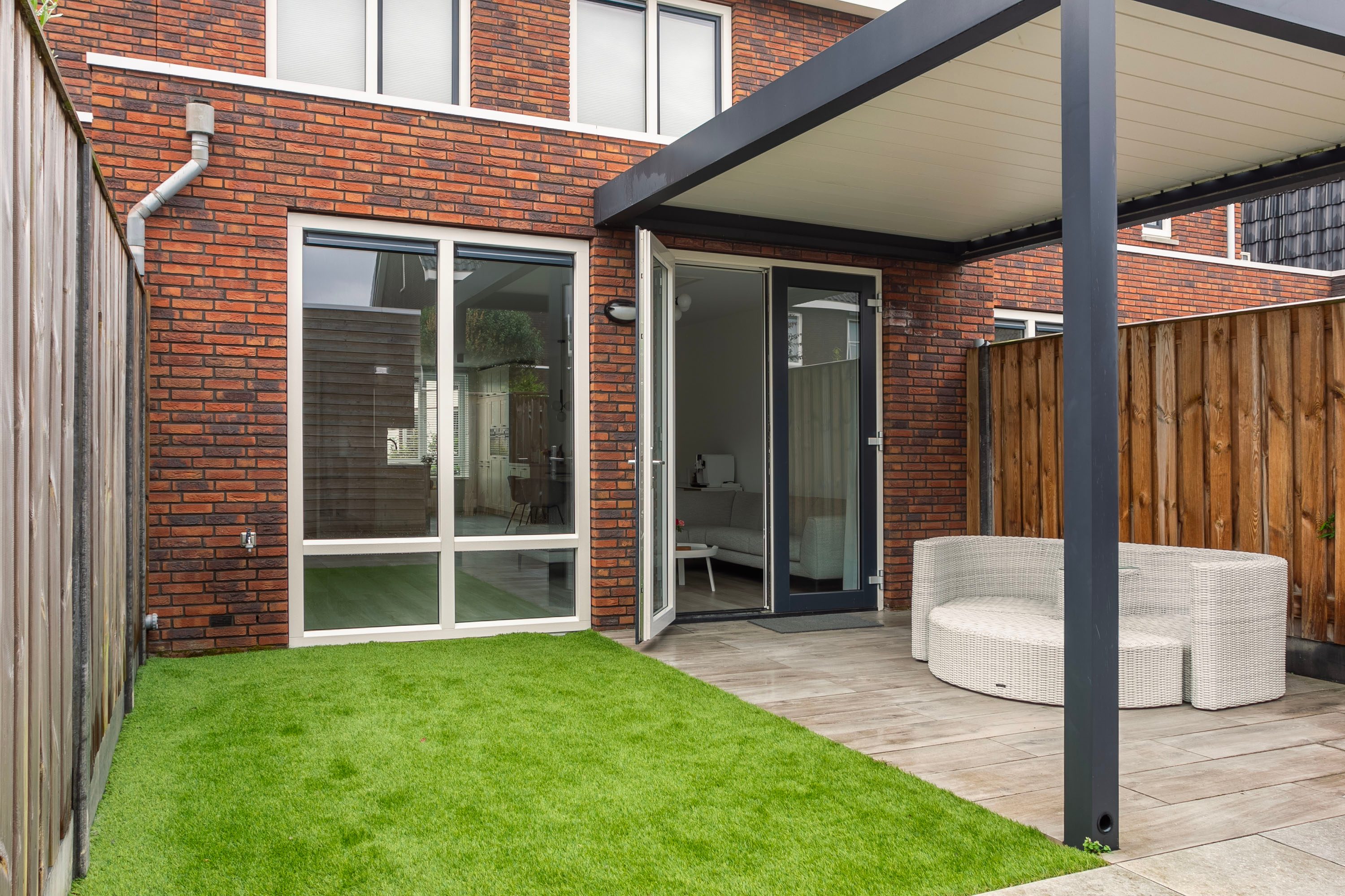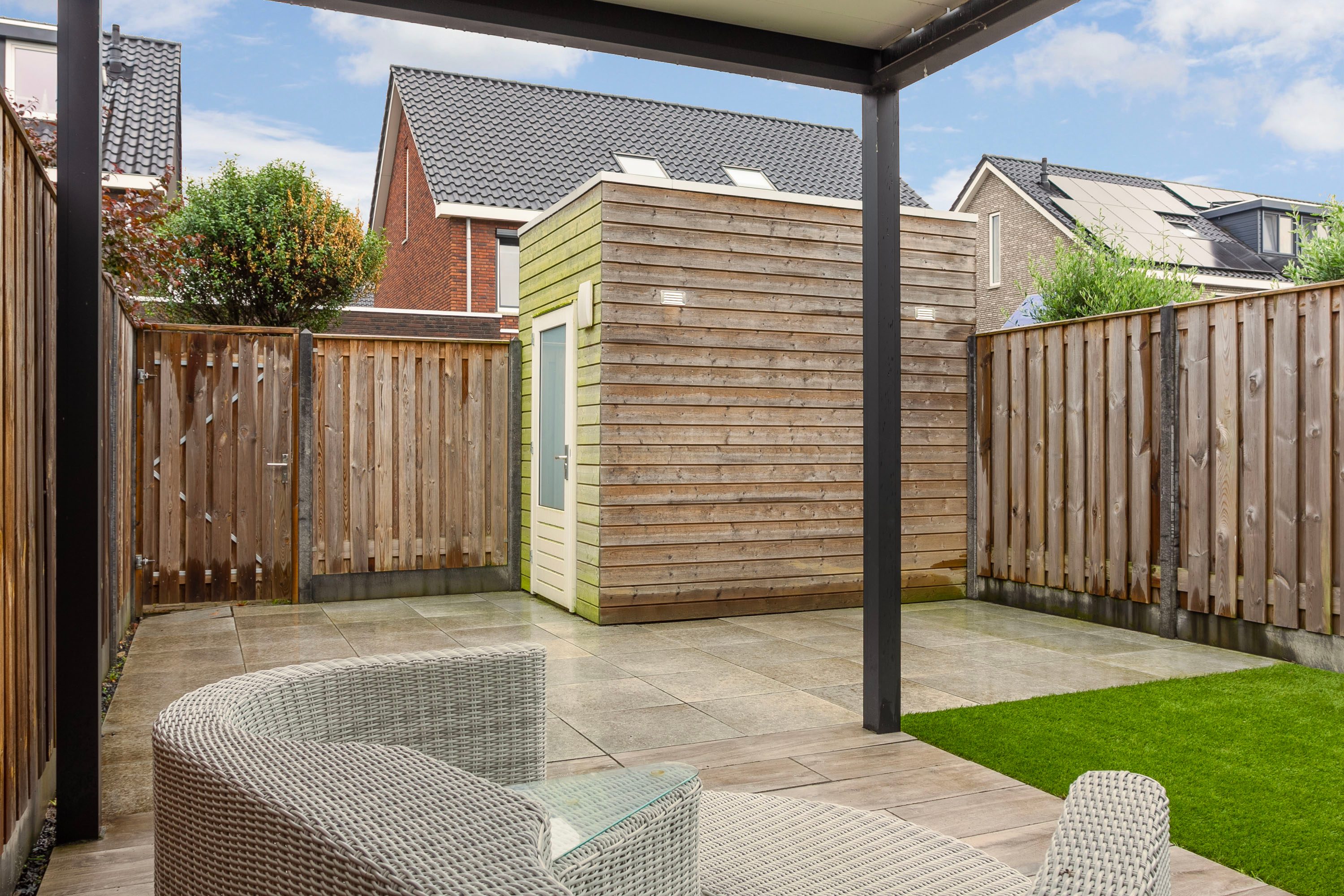 De tuin is gelegen op het oosten en beschikt over een fraaie overkapping en een praktische berging, perfect voor fietsen of tuinspullen. Dankzij de ligging en het formaat is dit een fijne plek om in de ochtendzon te genieten van je koffie of in de middag tot rust te komen.
