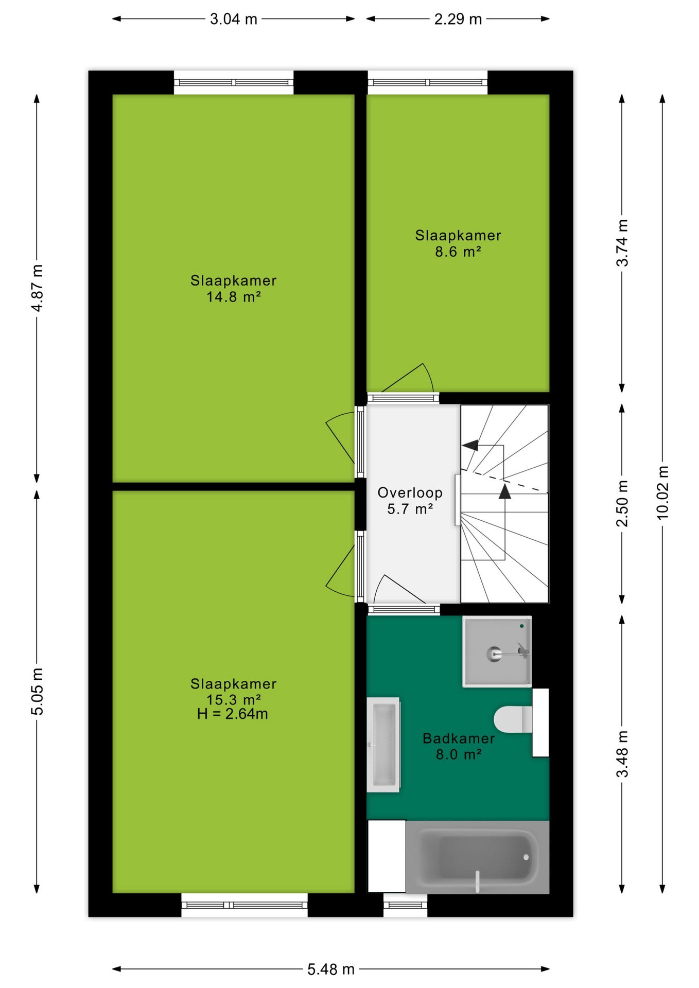 Op deze verdieping bevinden zich drie volwaardige slaapkamers (ca. 15,3 m², 14,8 m² en 8,6 m²), ideaal voor een gezin of voor het combineren van wonen en thuiswerken. De badkamer is verzorgd afgewerkt in een lichte kleurstelling en beschikt over een ligbad, aparte douche, wastafelmeubel en tweede toilet.