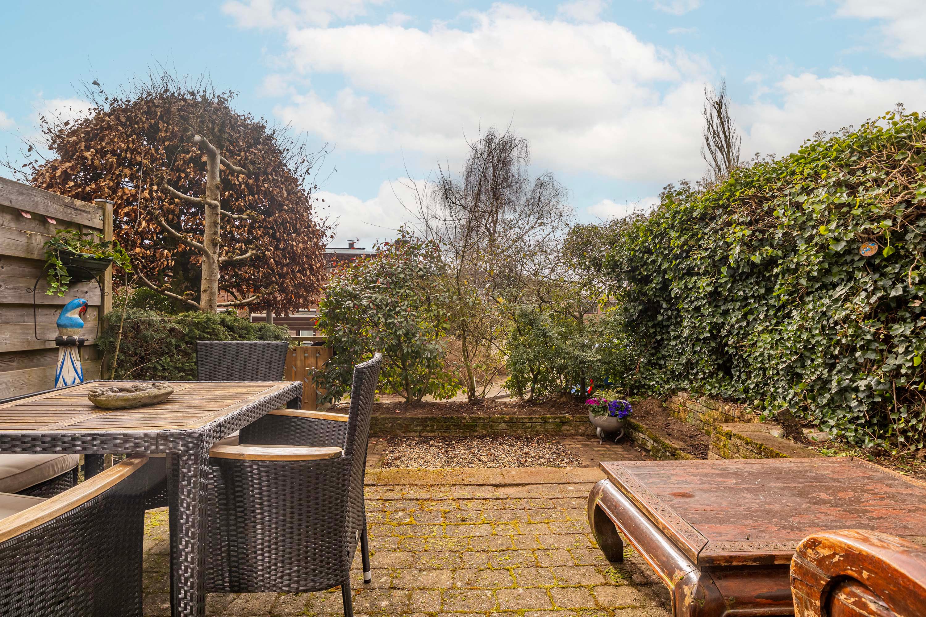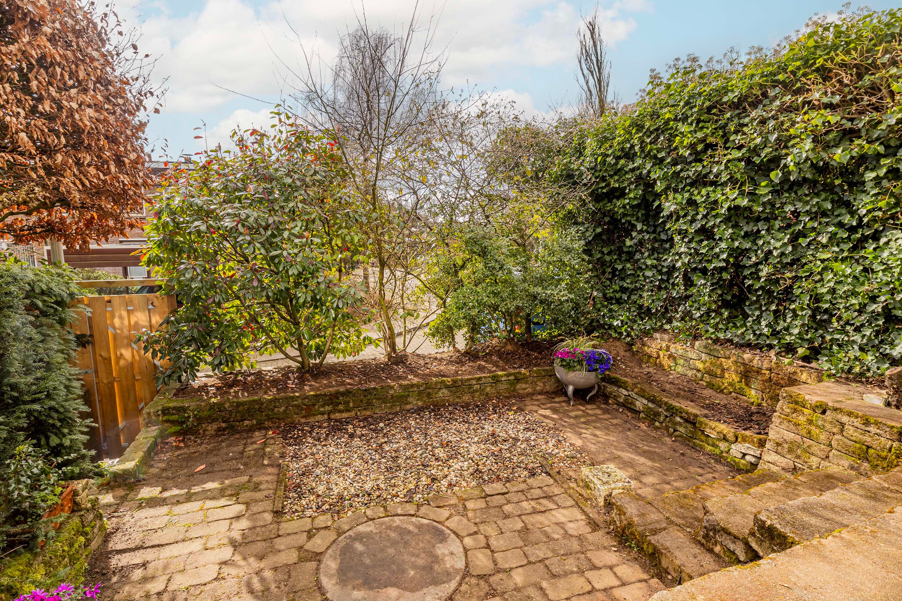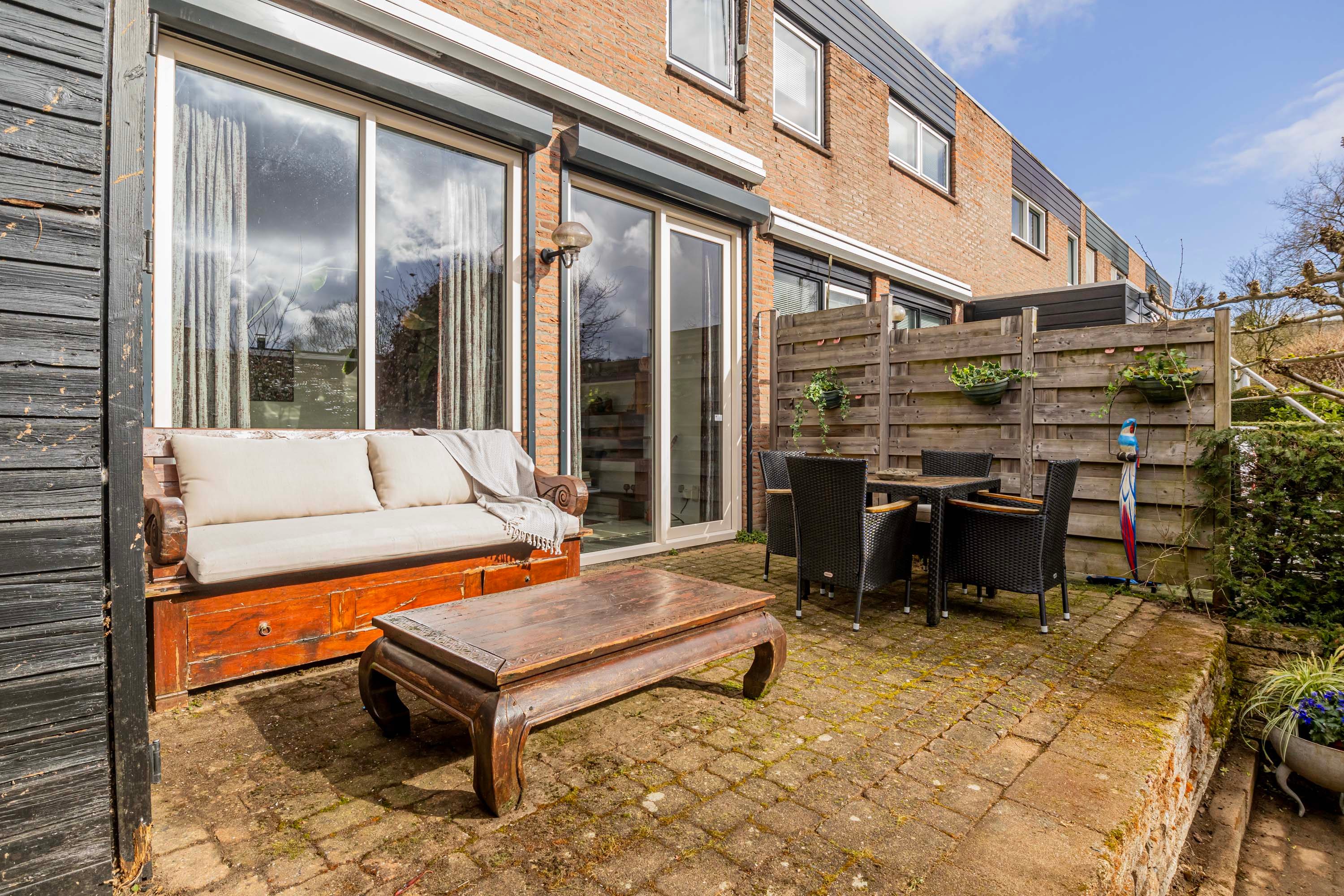 De fijne achtertuin (met hoogteverschil) ligt op het zuidoosten en hier kun je heerlijk genieten van de zon en het buitenleven. Ook is er een achterom vanaf de Heideweg. Aan de voorzijde zijn twee bergingen. In de eerste bevinden zich o.a. de meterkast, Cv-ketel, omvormers en thuisbatterij. De andere berging (geplaatst in 2023) is ideaal als fietsenstalling.