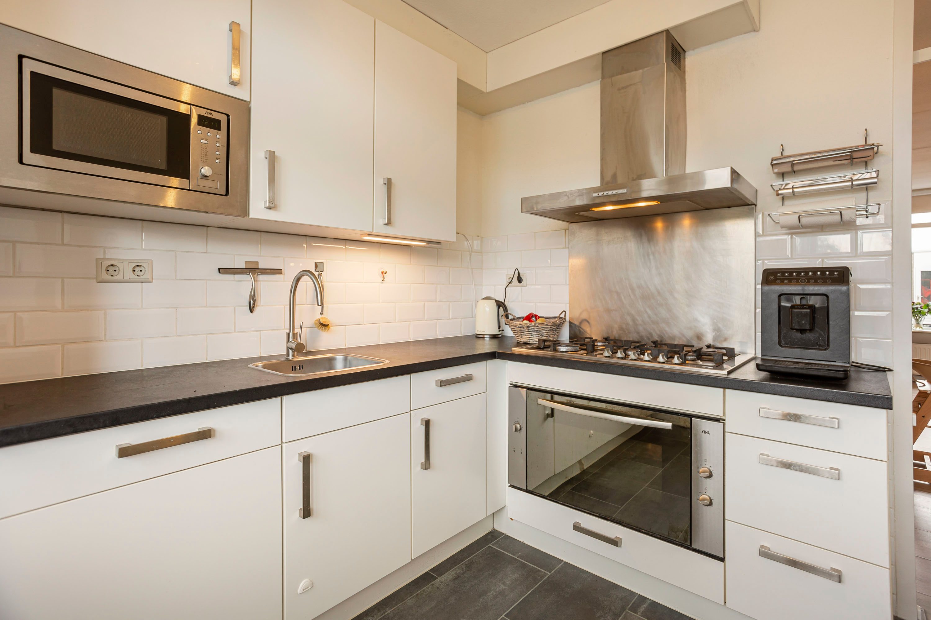 Entree met vernieuwd toilet en meterkast. Vanuit de hal toegang tot de woonkamer en keuken. De royale woonkamer van circa 30 m² heeft grote raampartijen die zorgen voor veel daglicht en een prettige sfeer. De moderne keuken in hoekopstelling is voorzien van diverse inbouwapparatuur, waaronder een koel-/vriescombinatie, gasfornuis, oven, magnetron, afzuigkap en vaatwasser.