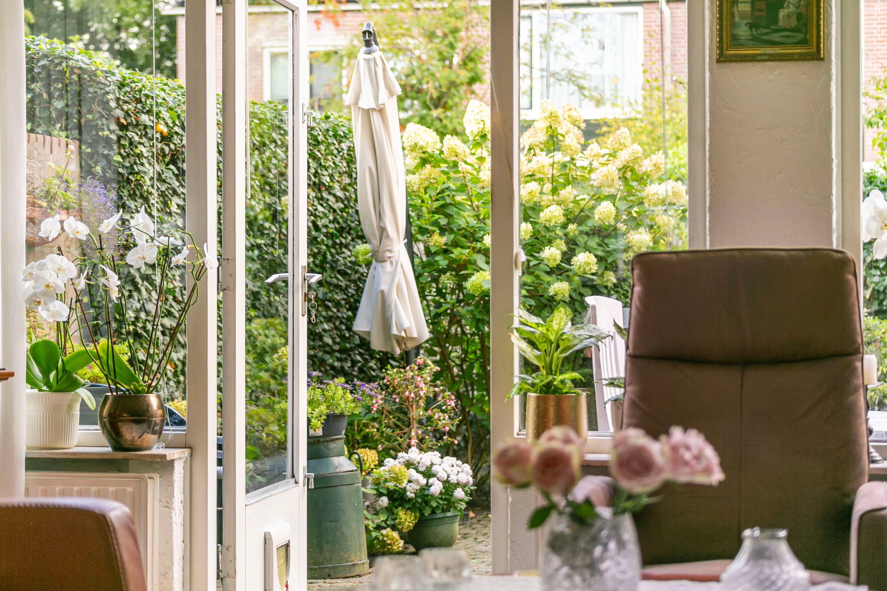 De groene achtertuin is circa 10 meter diep, waardoor je optimaal kunt genieten van zon en buitenleven. Dankzij de royale maatvoering is er ruimte voor een extra terrasje of een speelplek voor de kinderen. Daarnaast is er een praktische achterom. In de voortuin bevindt zich een berging, ideaal voor het stallen van fietsen en het opbergen van tuinspullen.
