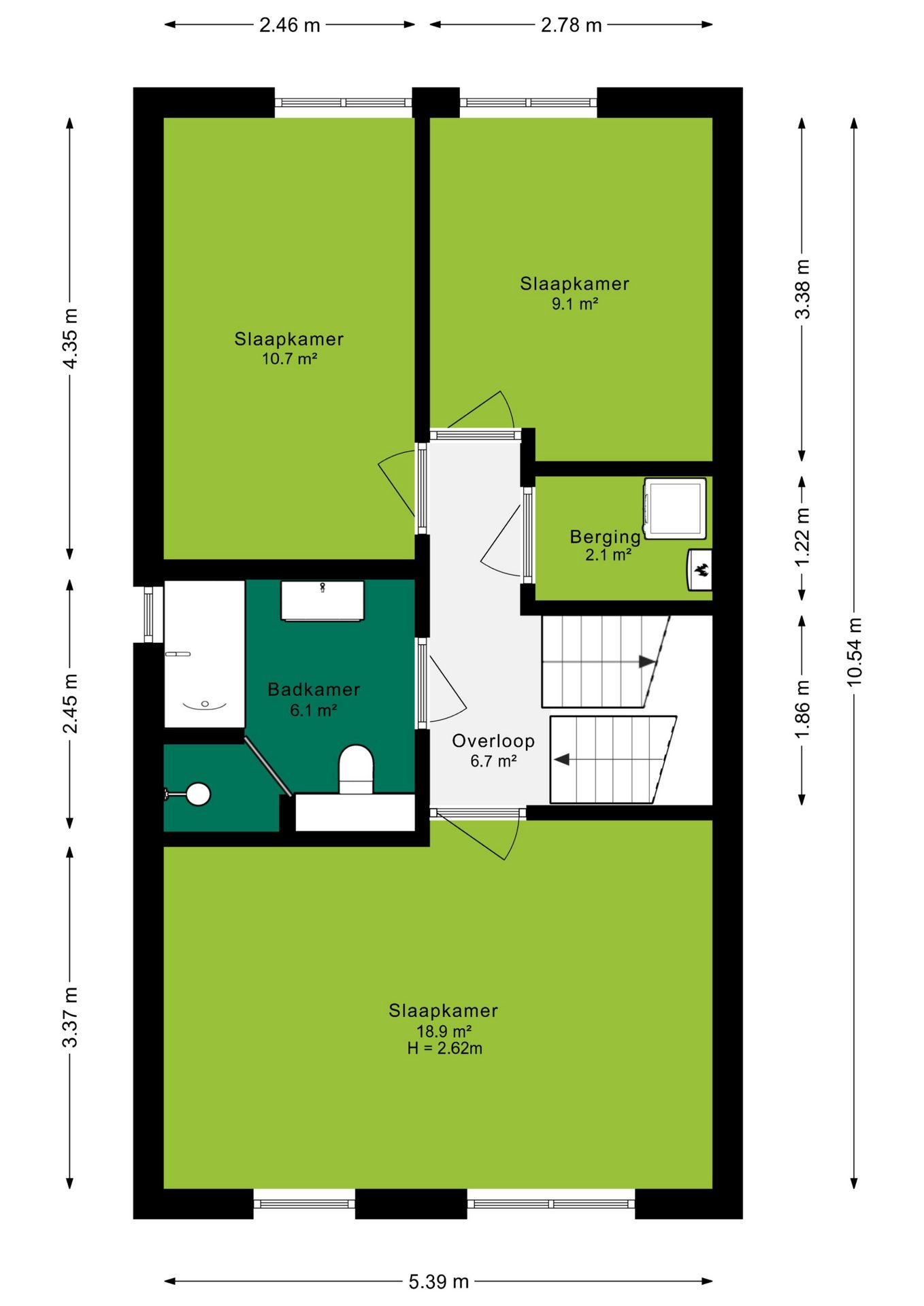 De ruime overloop geeft je toegang tot 3 slaapkamers, de badkamer en een vaste kast met witgoed aansluiting. De slaapkamers zijn goed bemeten met een oppervlakte van 20m², 11m² en 9m². De slaapkamers zijn voorzien van een laminaatvloer en voldoende lichtinval. De complete badkamer is opgesteld in een moderne kleurstelling en voorzien van een ligbad, douche, wastafelmeubel en tweede toilet. Tevens is er een raam aanwezig voor een fijn daglicht en om, naast de aanwezige mechanische ventilatie, de badkamer ook op een natuurlijke manier te kunnen ventileren.