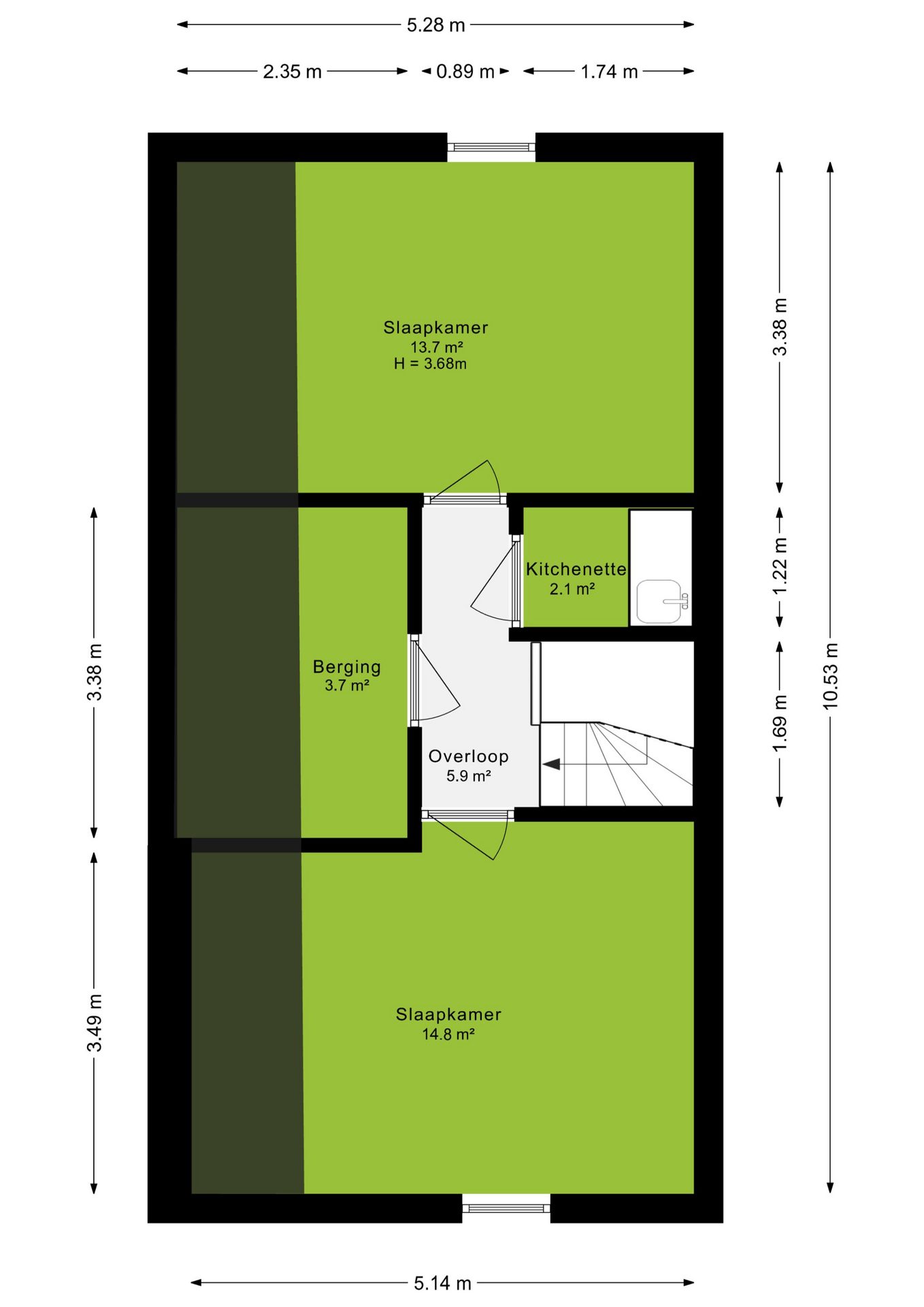 Via een vaste trap bereik je volwaardige 2e verdieping en deze verdieping zal je echt verrassen! Hier bevinden zich namelijk nog eens 2 slaapkamers, een ruime berging en een kitchenette. De slaapkamers zijn circa 15m² en 14m² en door de hoge plafonds voelen de slaapkamers heerlijk ruim aan.