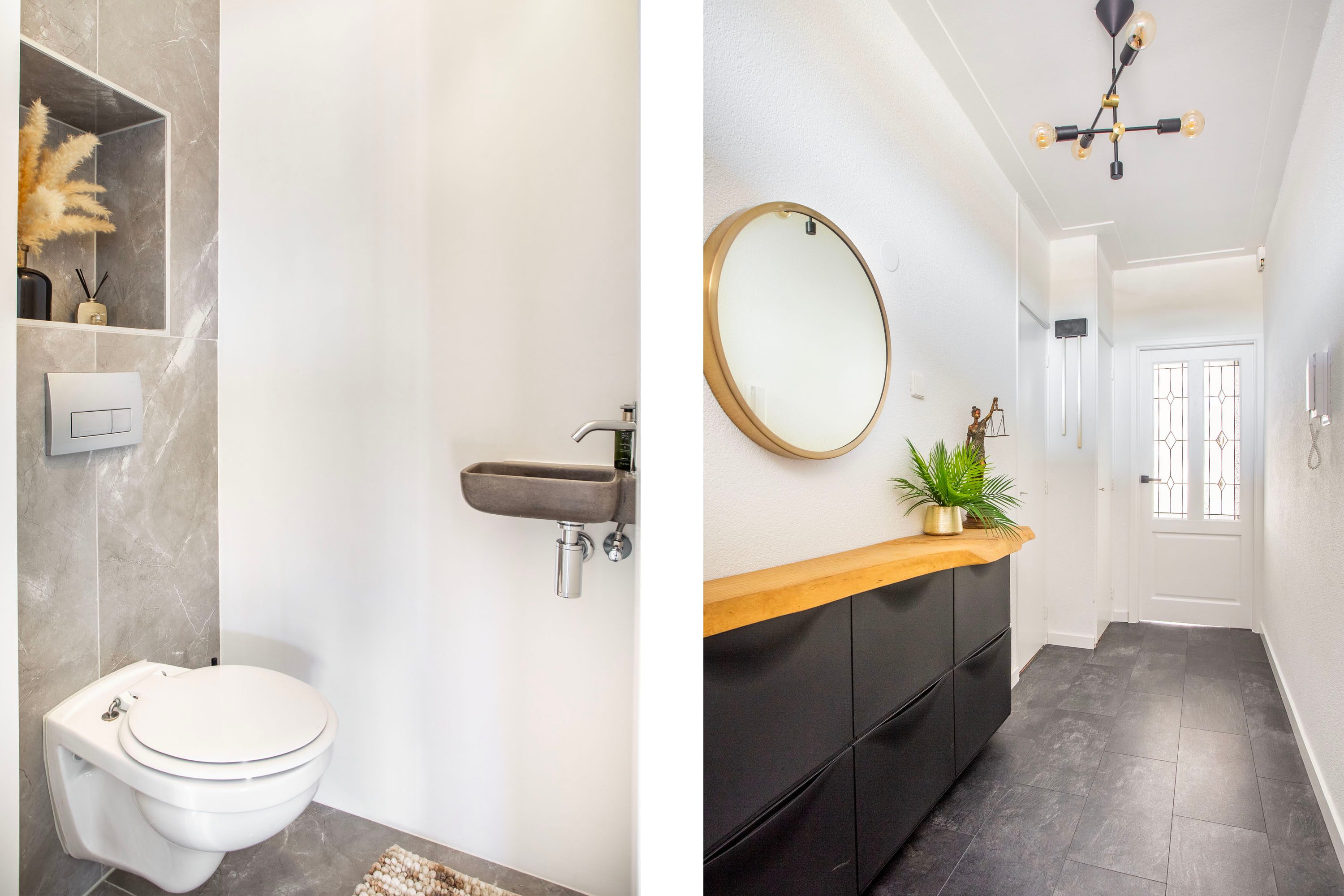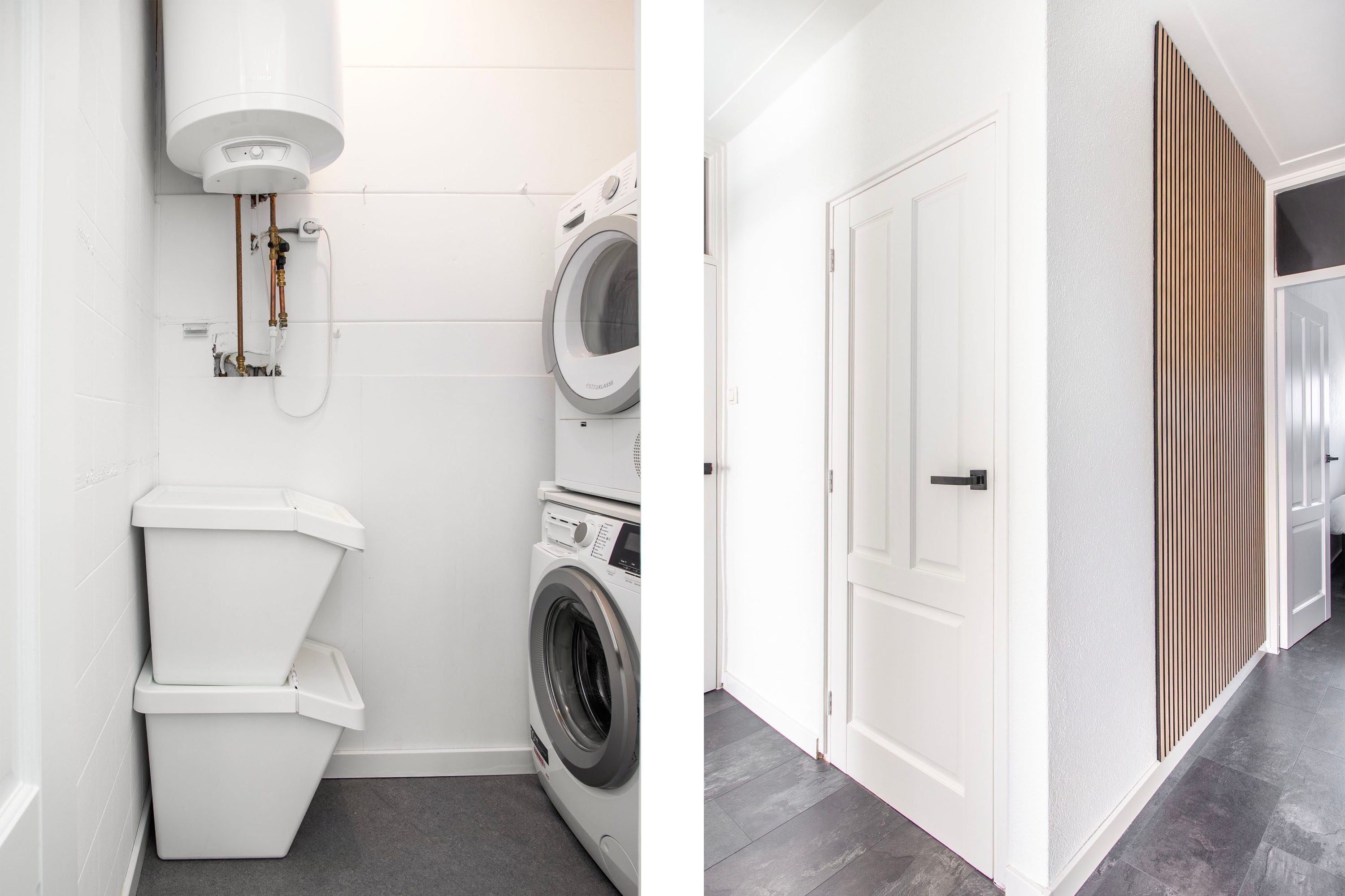 De badkamer van ongeveer 9 m² is royaal opgezet en modern afgewerkt. Dankzij het grote raam valt er prettig daglicht binnen. De ruimte is voorzien van een douche en een dubbel wastafelmeubel. Voor extra comfort bevindt het toilet zich in een aparte ruimte, prettig voor zowel bewoners als gasten. Daarnaast beschik je over een praktische berging/wasruimte, ideaal voor extra opslag en het plaatsen van de wasmachine.