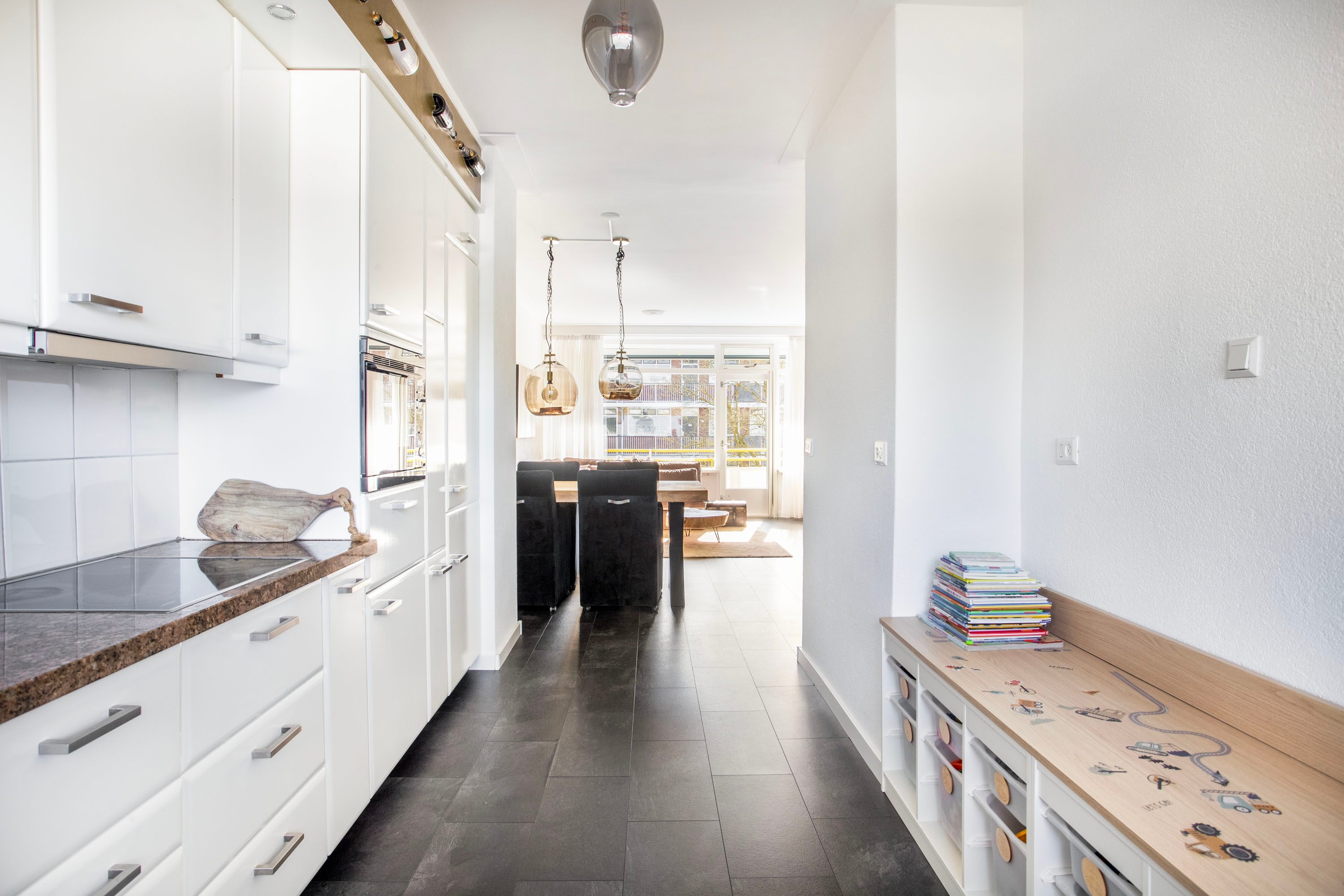 De lichte en royale woonkamer van circa 30 m² bevindt zich aan de achterzijde van het appartement. Grote raampartijen zorgen voor een fraaie lichtinval en een vrij uitzicht op het groen tussen de omliggende complexen. Er is volop ruimte voor een comfortabele zithoek (zoals de huidige bewoners hebben ingericht), een grote eettafel voor zes personen én een werk- of speelhoek. Vanuit de woonkamer loop je zo het zonnige balkon op het zuidoosten op, waar je heerlijk kunt genieten van de buitenruimte. De open keuken ligt aan de voorzijde van de woning en is praktisch ingedeeld in een rechte opstelling, met voldoende werkblad en bergruimte.