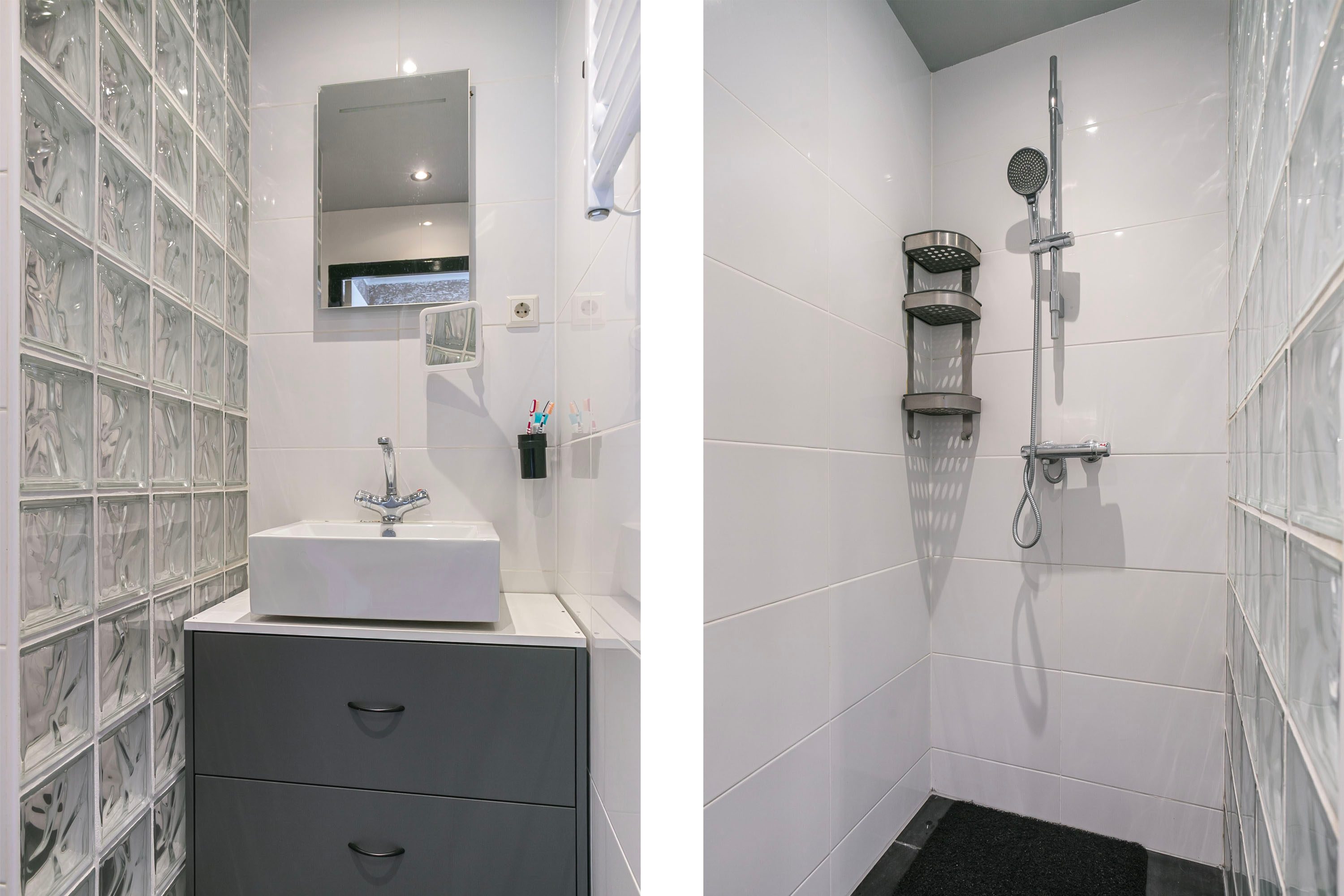 De slaapkamer beschikt over een inloopbadkamer met douche en wastafel.