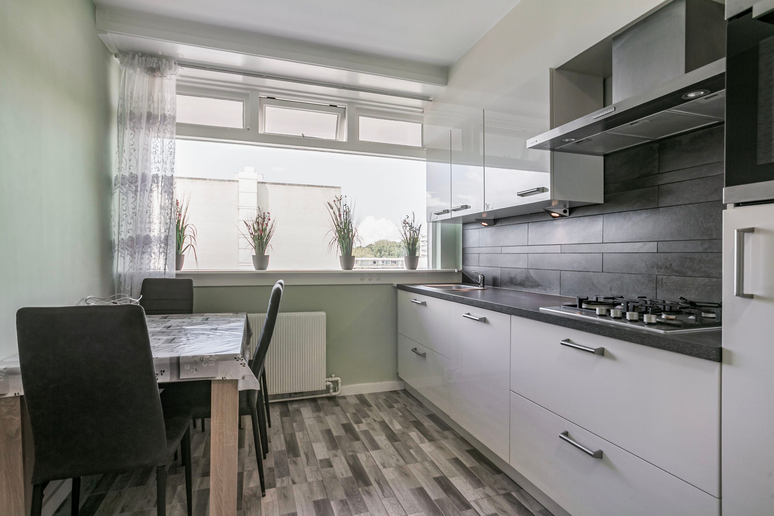 De woonkamer is voorzien van een nette houten vloer en geeft toegang tot het balkon op het zuidoosten, met een vrij uitzicht over een grasveld tussen de complexen. De keuken is praktisch ingedeeld en uitgerust met een 4-pits gaskookplaat, oven, afzuigkap, spoelbak, vaatwasser en aansluitingen voor wasmachine en droger.
