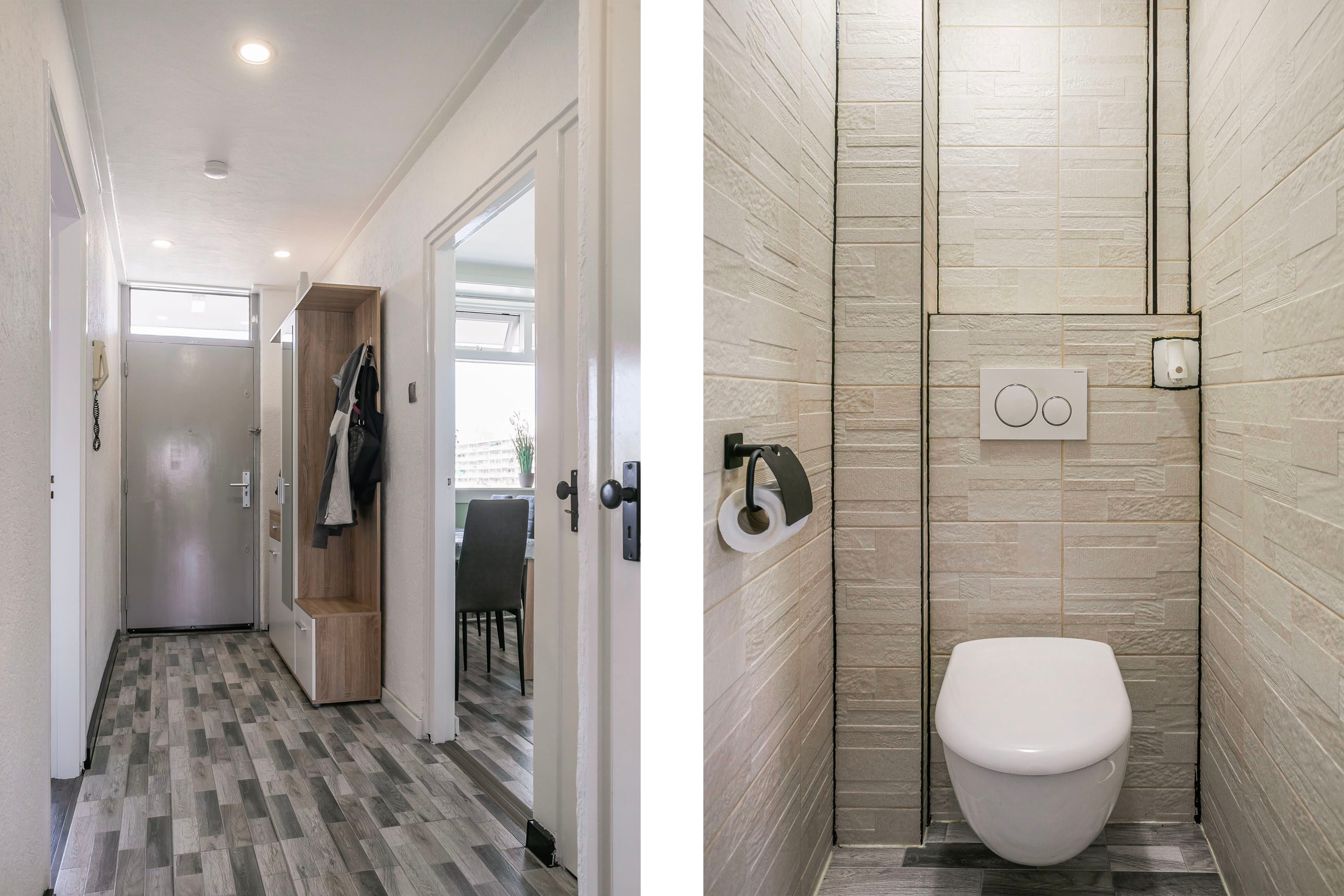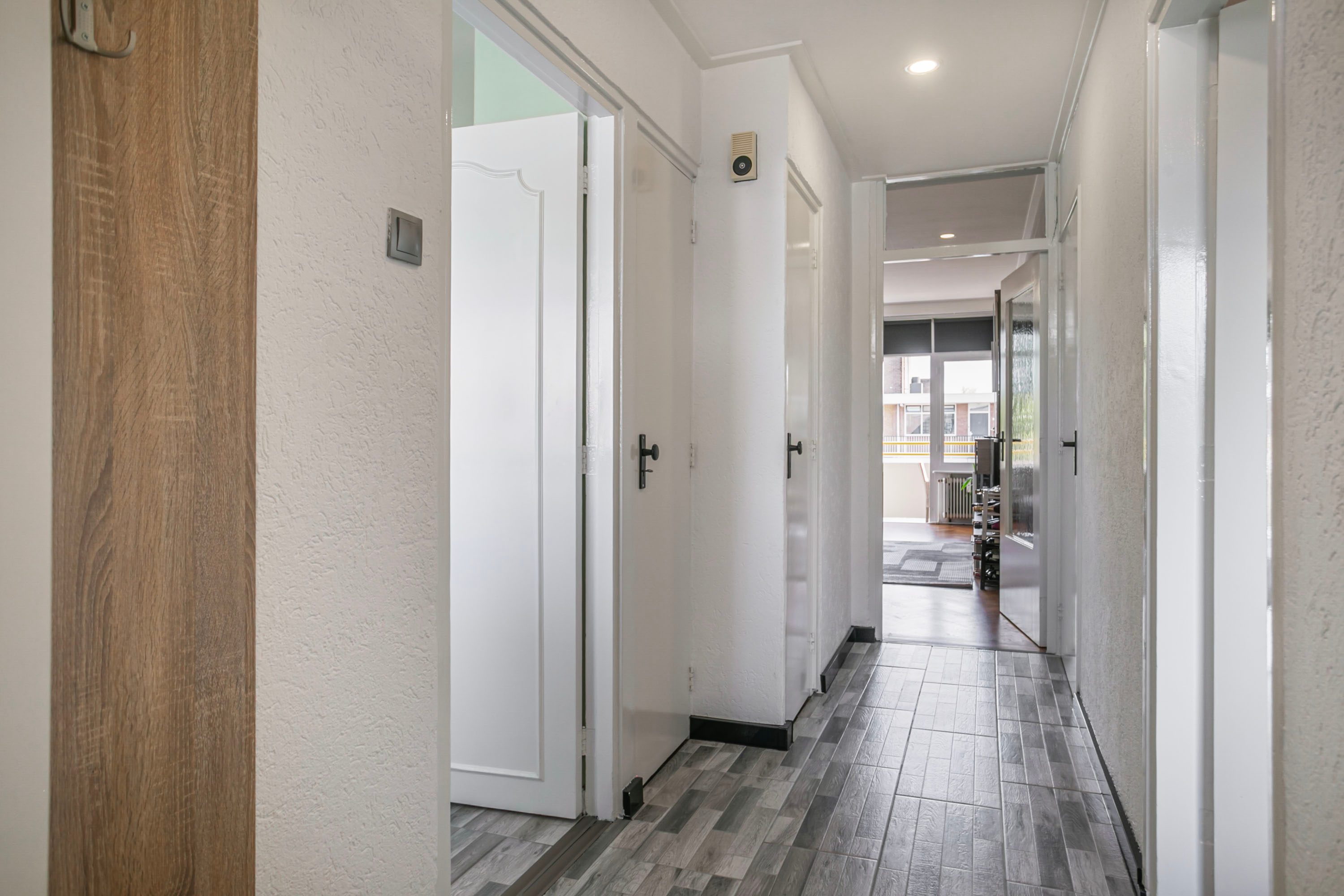 Via de centrale entree met lift en trappenhuis bereik je de woning op de vierde verdieping. Je komt binnen in een lichte hal die toegang biedt tot de keuken, toiletruimte, slaapkamer en woonkamer.