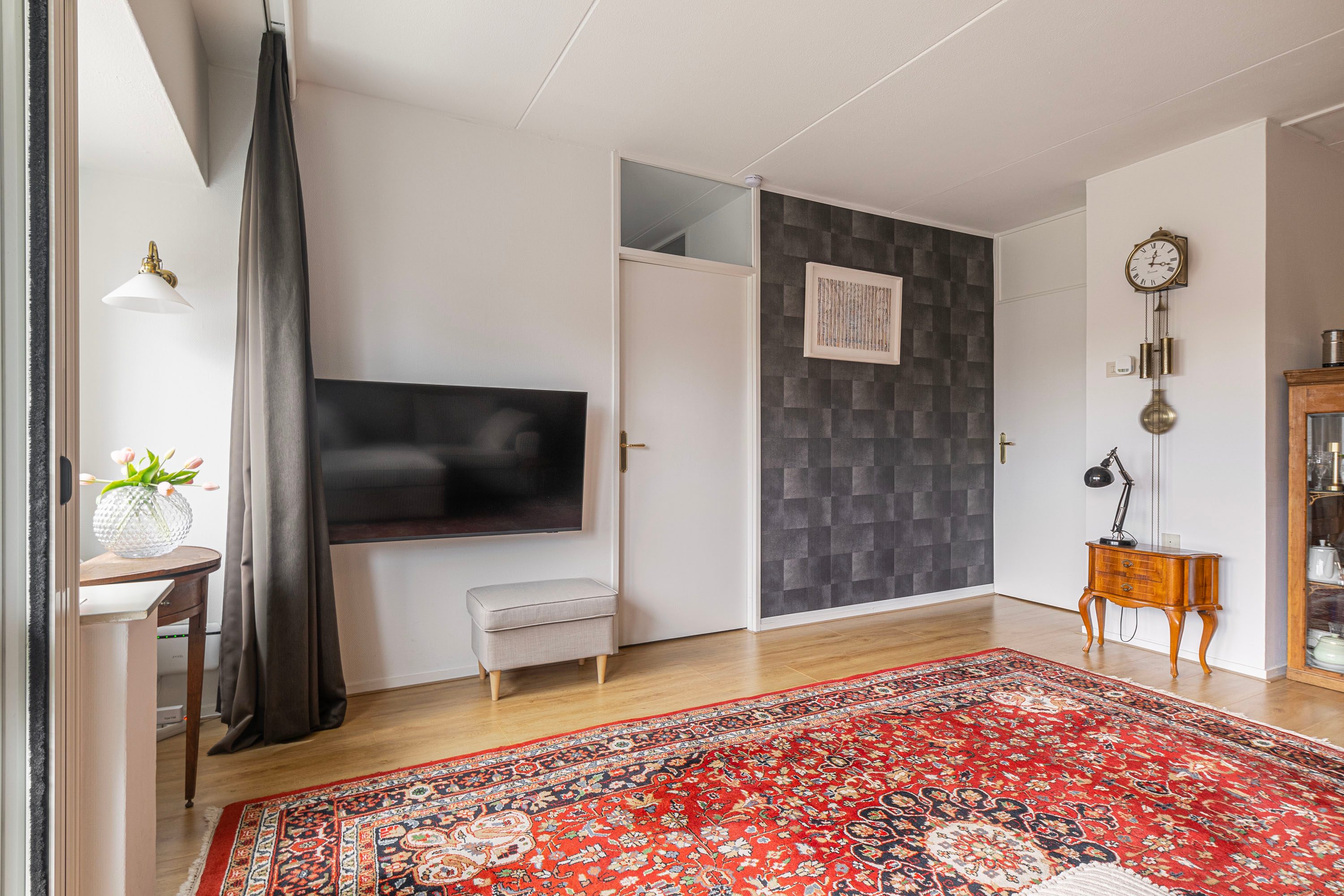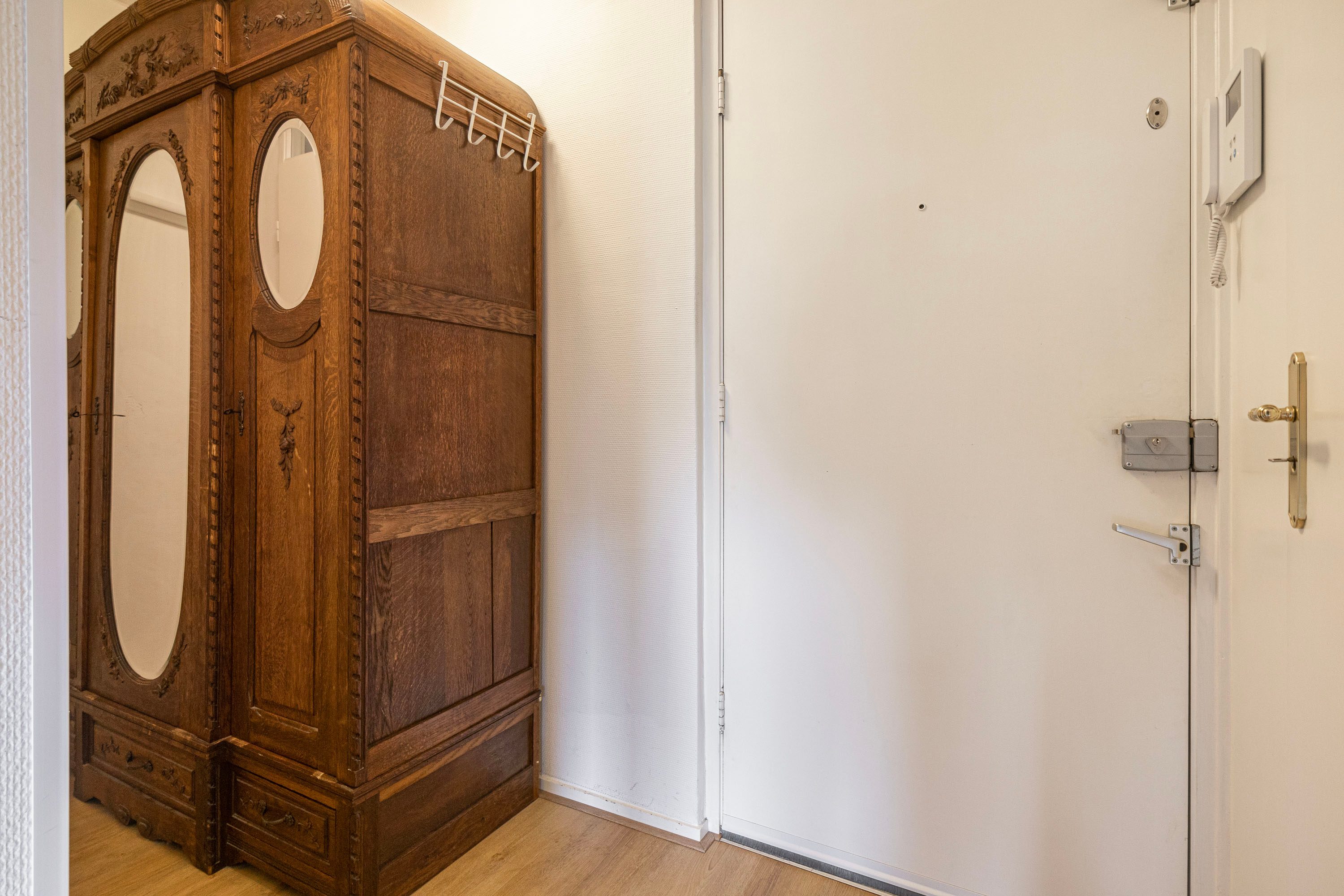 Binnenkomst via de entree, waarna de hal toegang biedt tot alle ruimtes van de woning. Hier vind je tevens een vaste kast en de meterkast.