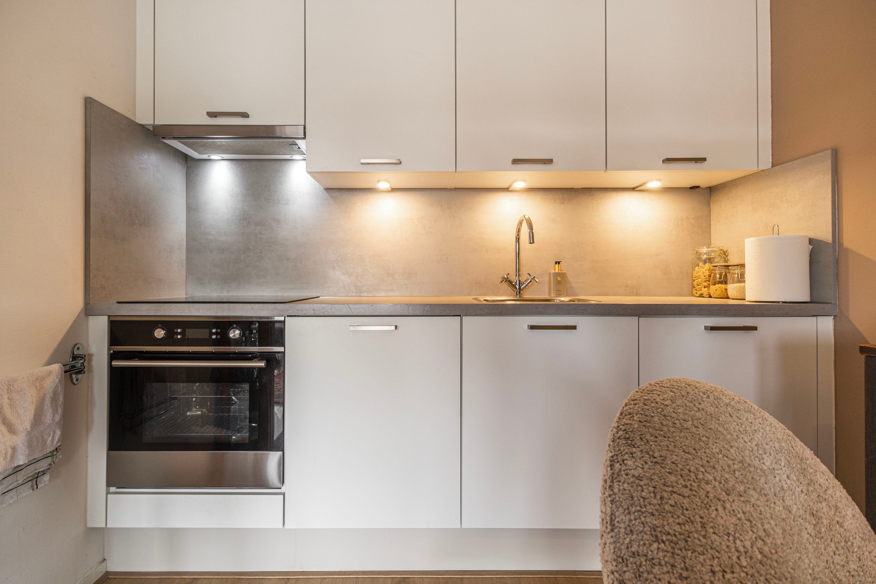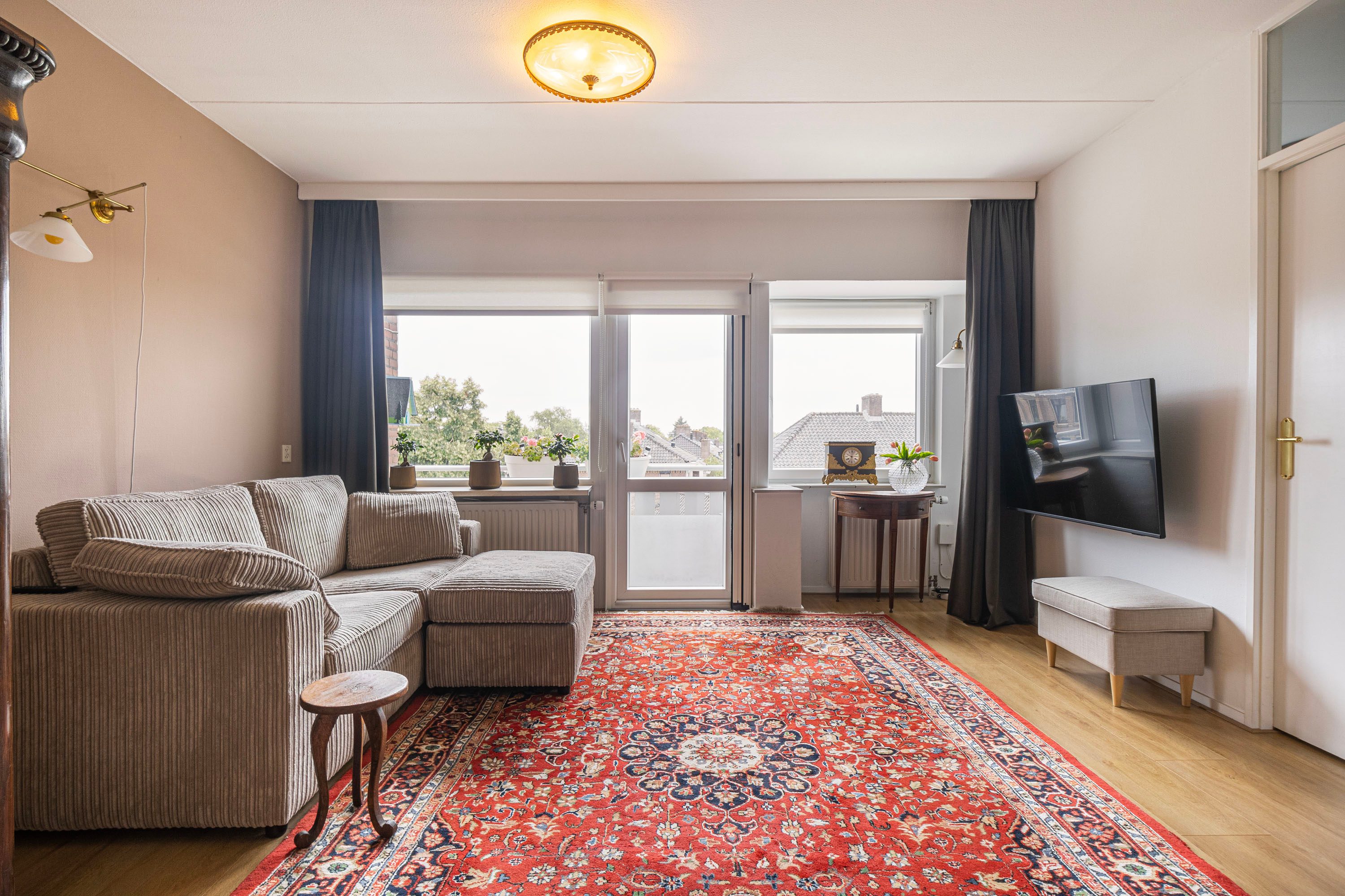 De ruime woonkamer is eenvoudig in te delen en biedt via de deur toegang tot een ruim balkon op het zuidoosten. Hier geniet je van zowel de ochtend- als middagzon. De open keuken is in 2021 vernieuwd en strak ingericht in een rechte opstelling. Daarnaast is deze van alle gemakken voorzien met inbouwapparatuur, waaronder een kookplaat, afzuigkap, oven en koelkast.
