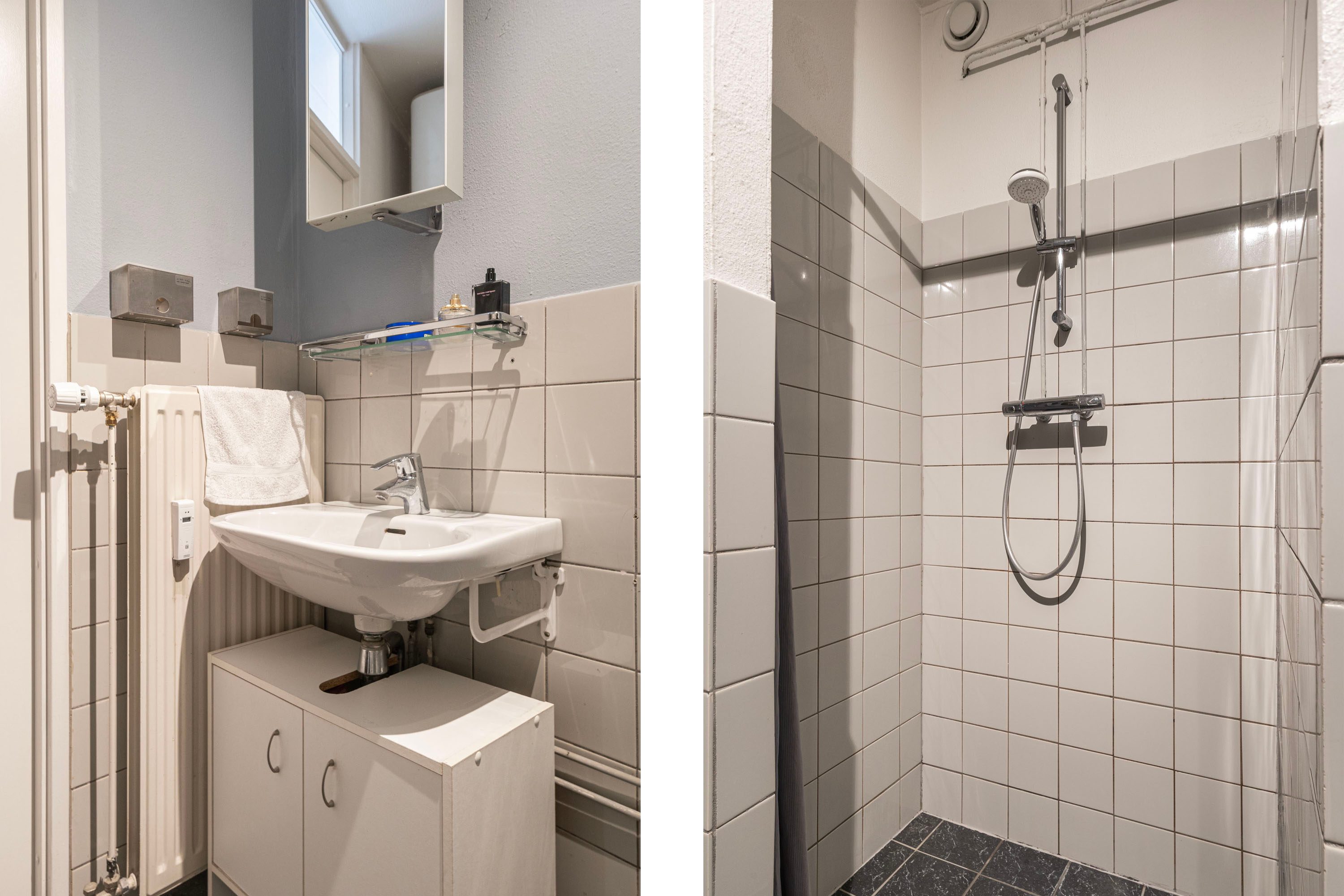 De badkamer is voorzien van licht tegelwerk en beschikt over een douchehoek, wastafel, toilet en een aansluiting voor de wasmachine.
