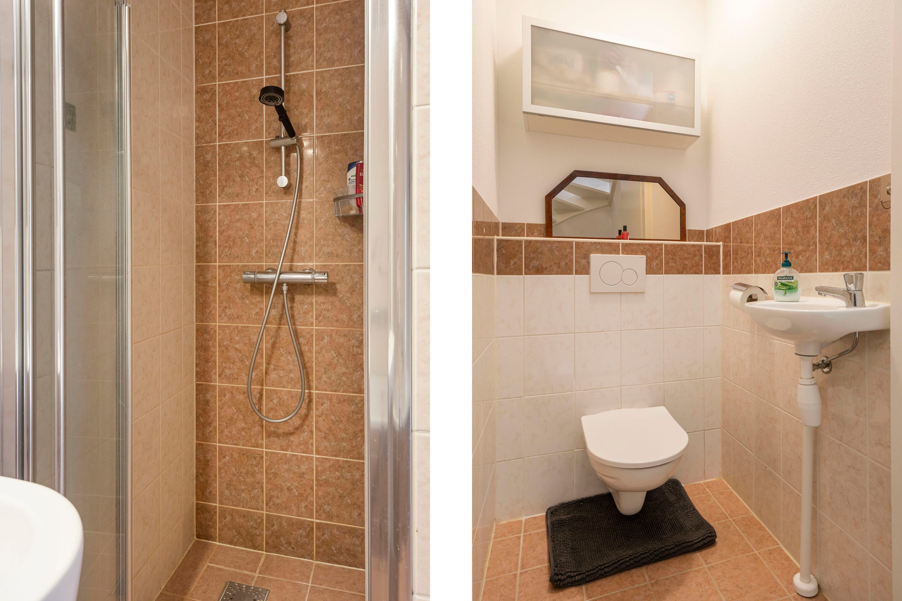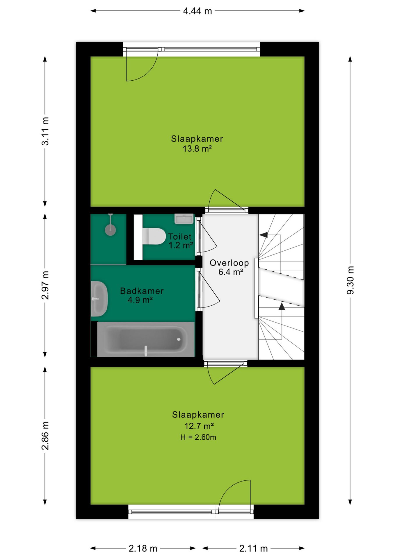 De tweede verdieping biedt een overloop met toegang tot twee slaapkamers van circa 14 m² en 13 m², een badkamer en een separaat toilet. De badkamer is uitgerust met een ligbad, douche, wastafel en handdoekradiator.