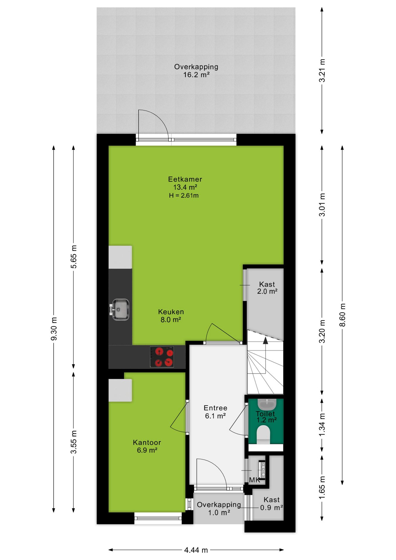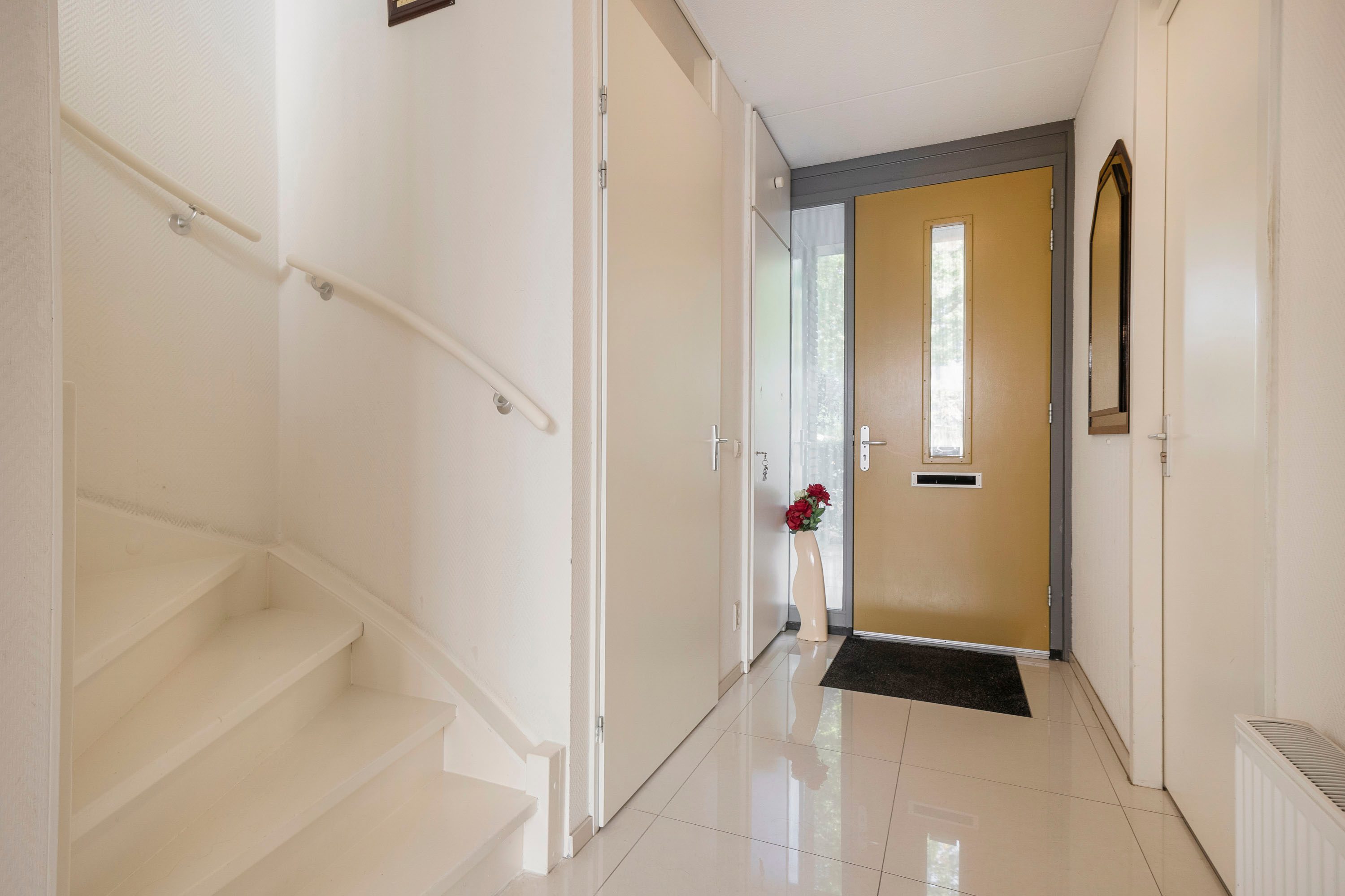 De entree geeft toegang tot de hal met toilet en trapopgang. De woonkeuken in hoekopstelling is voorzien van diverse inbouwapparatuur en biedt ruimte voor een eettafel. Via de deur stap je direct de tuin in. Daarnaast is er een berging aanwezig voor extra opslag.