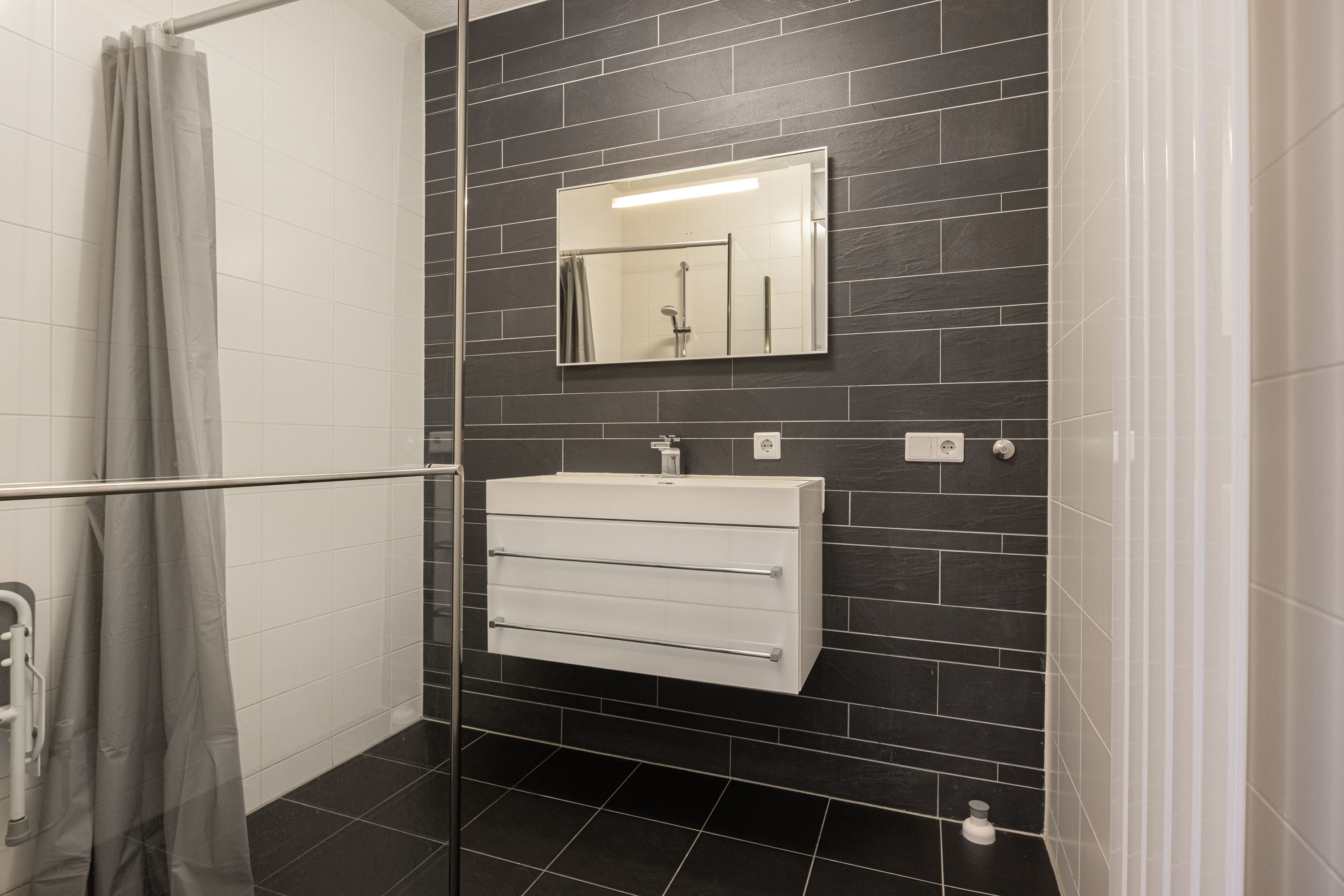 De badkamer is voorzien van een inloopdouche en een wastafel met meubel, terwijl het toilet zich apart bevindt. Alles binnen handbereik.