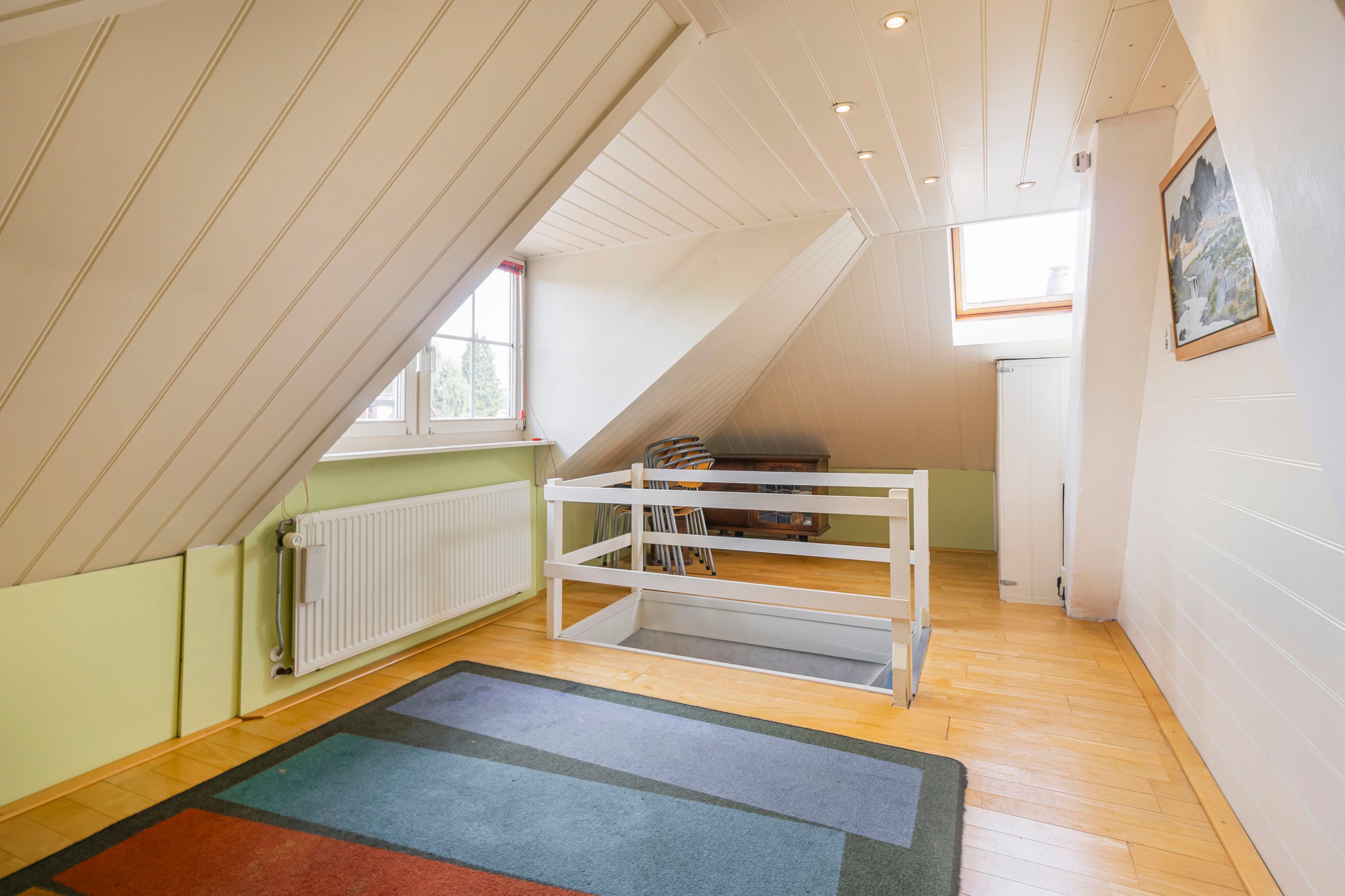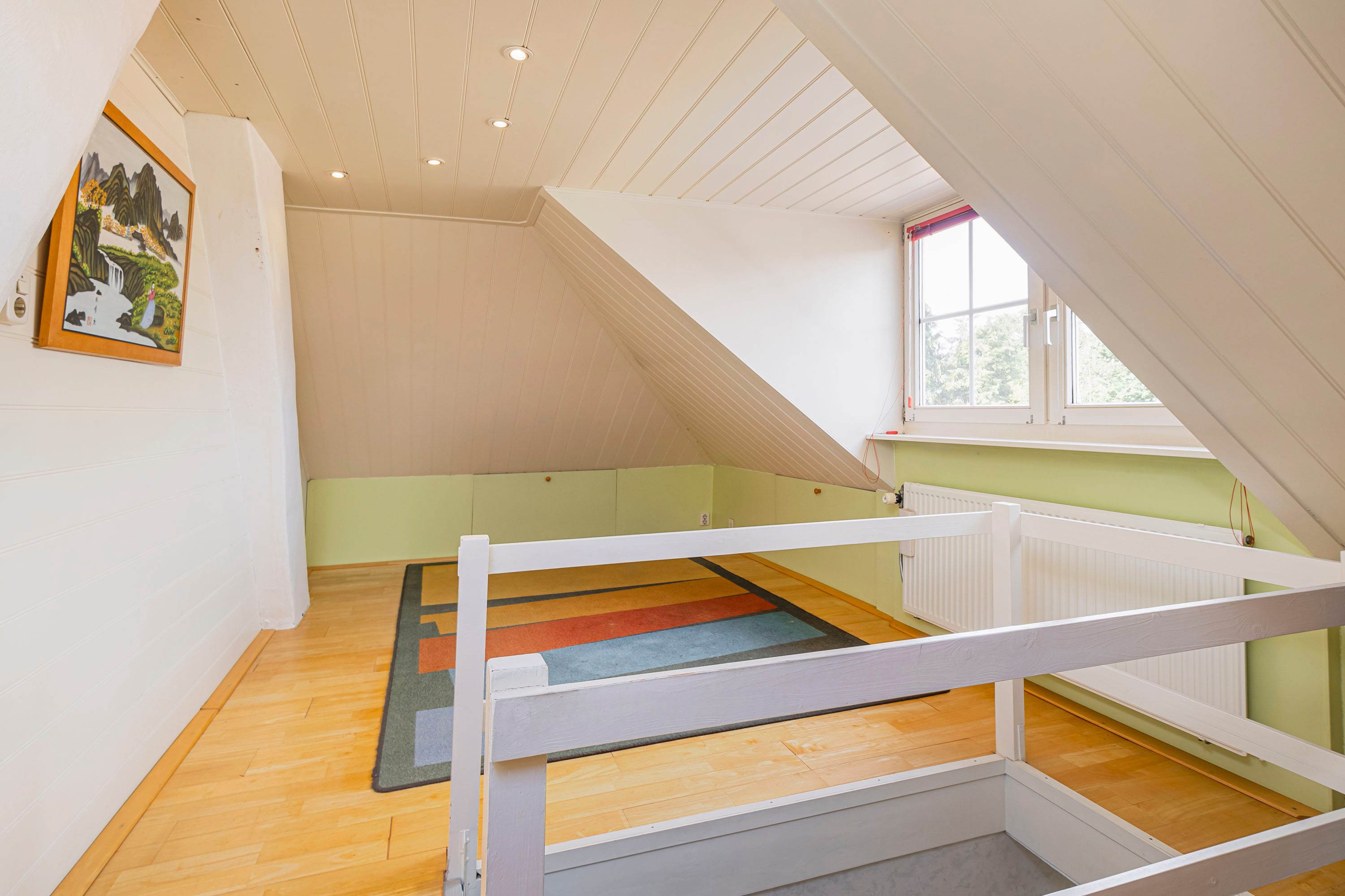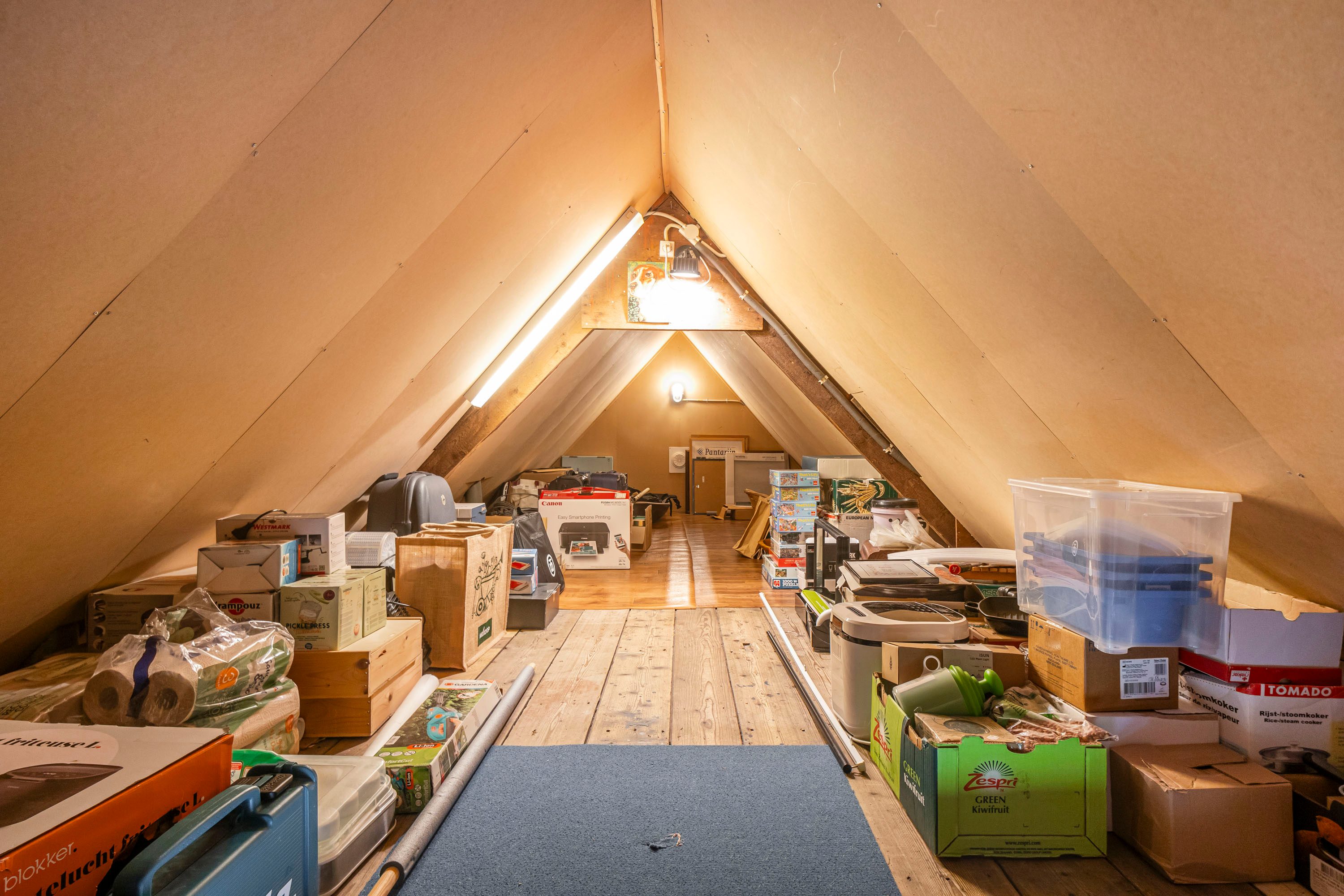 De zolderverdieping is toegankelijk via een vaste trap en is momenteel een open ruimte met een dakraam en dakkapel. De ruimte is ideaal te gebruiken als slaapkamer, werkplek of opbergzolder. Daarnaast biedt de ruimte achter de knieschotten extra praktische opbergruimte.