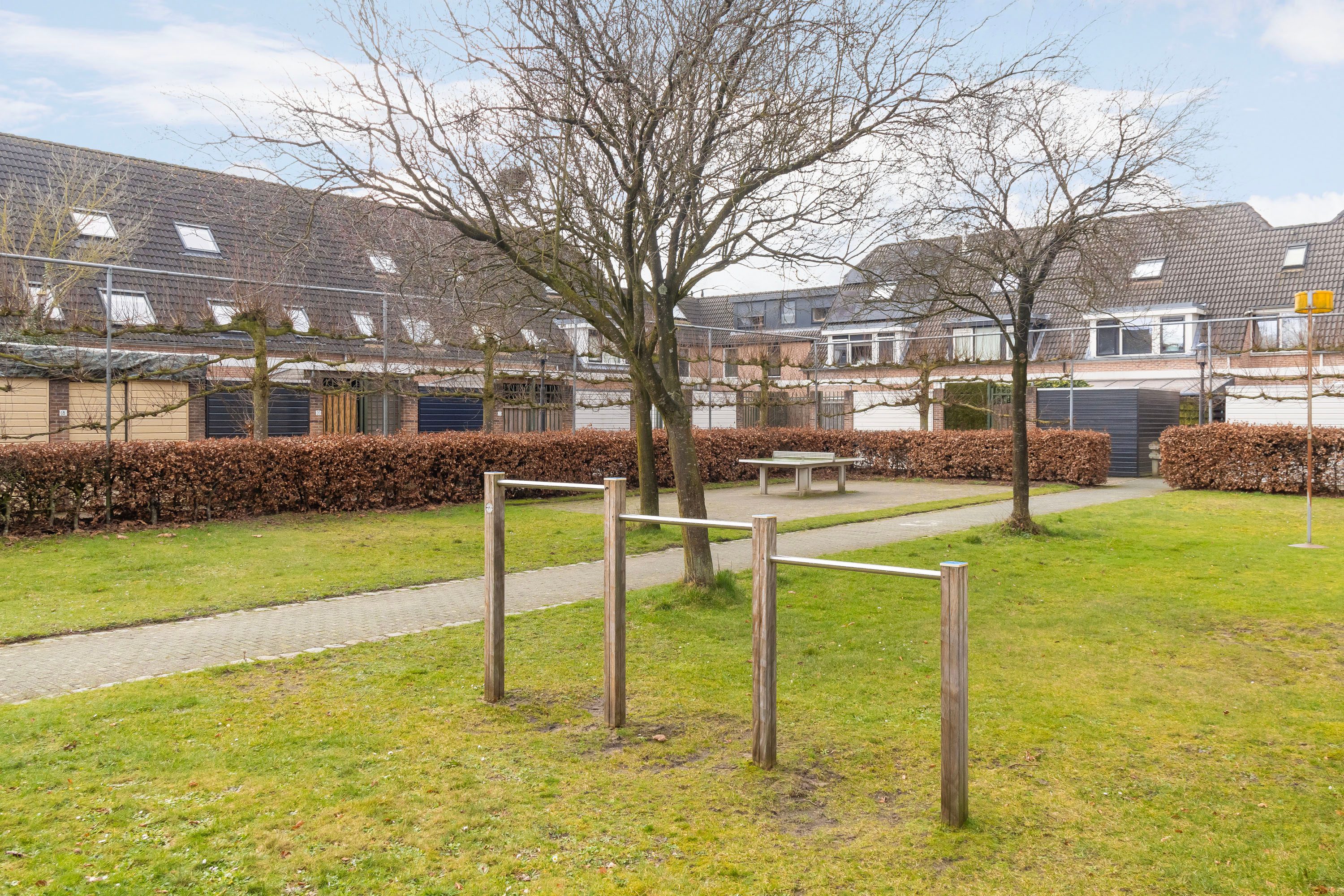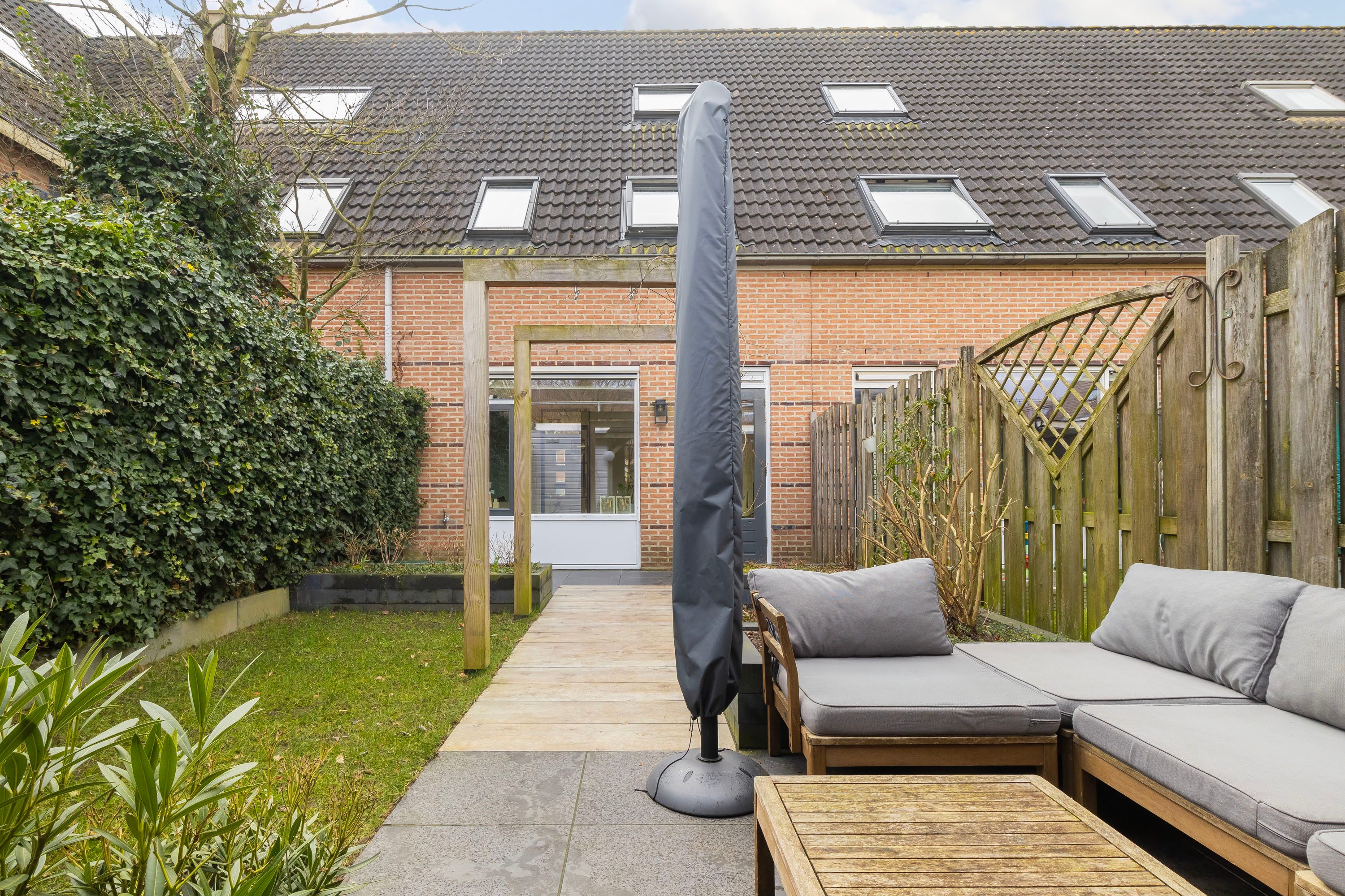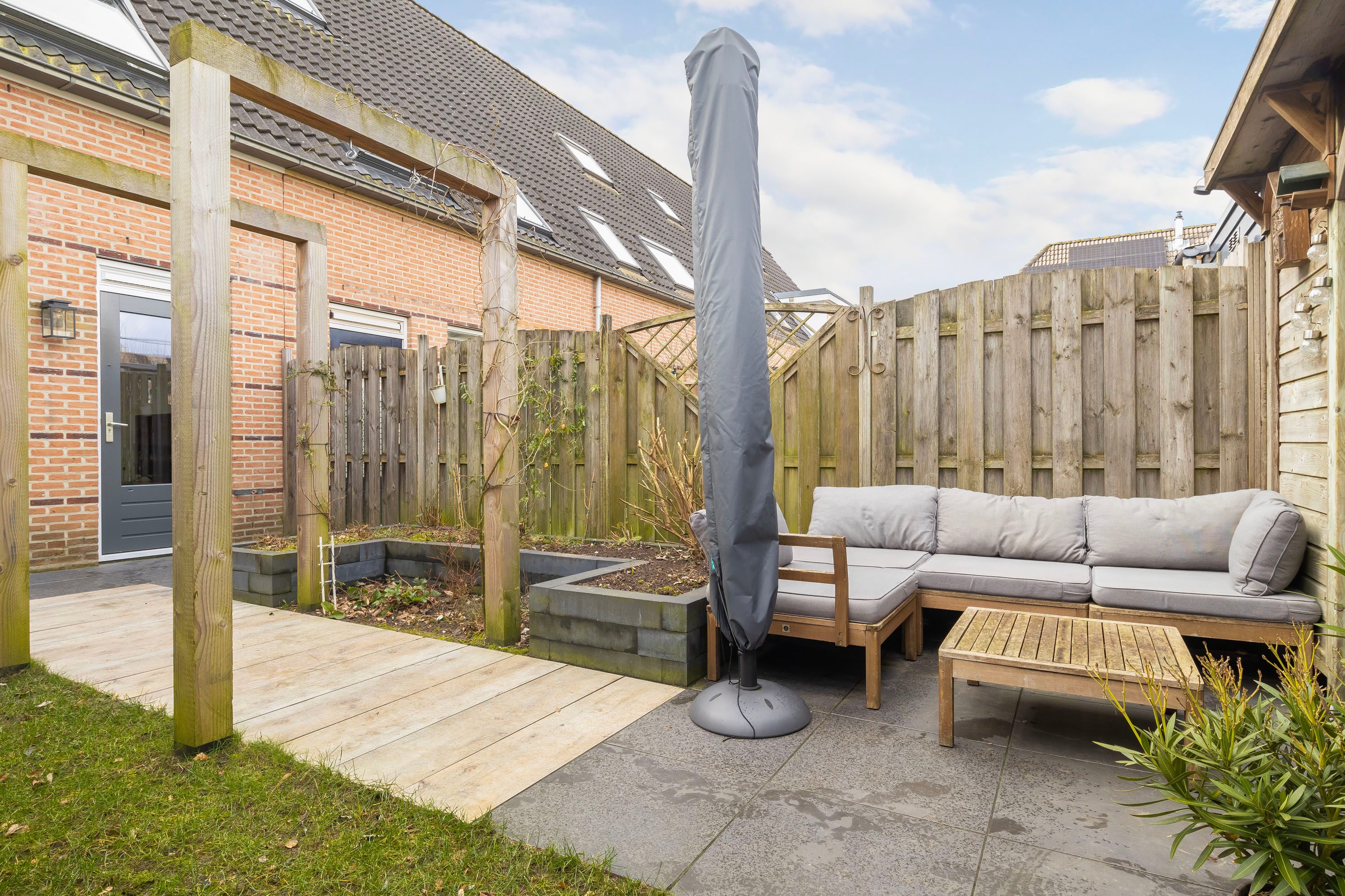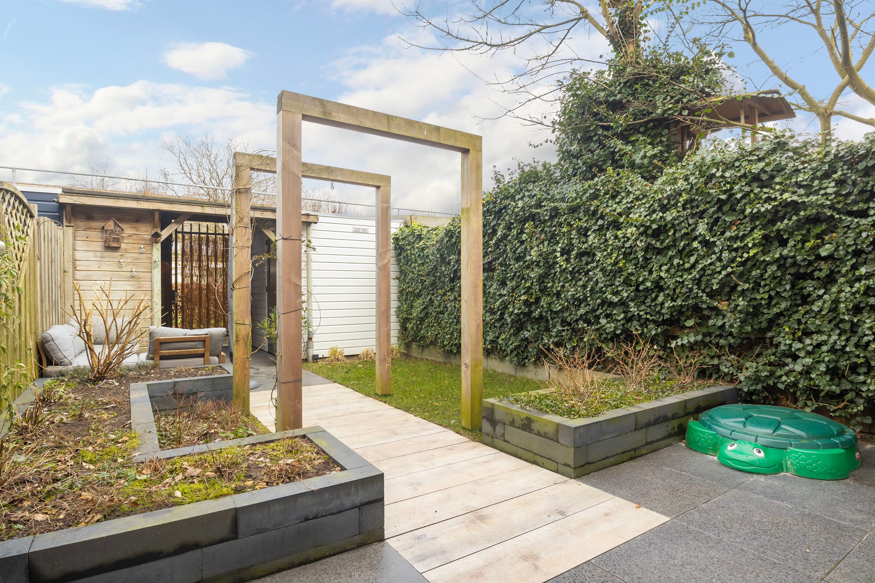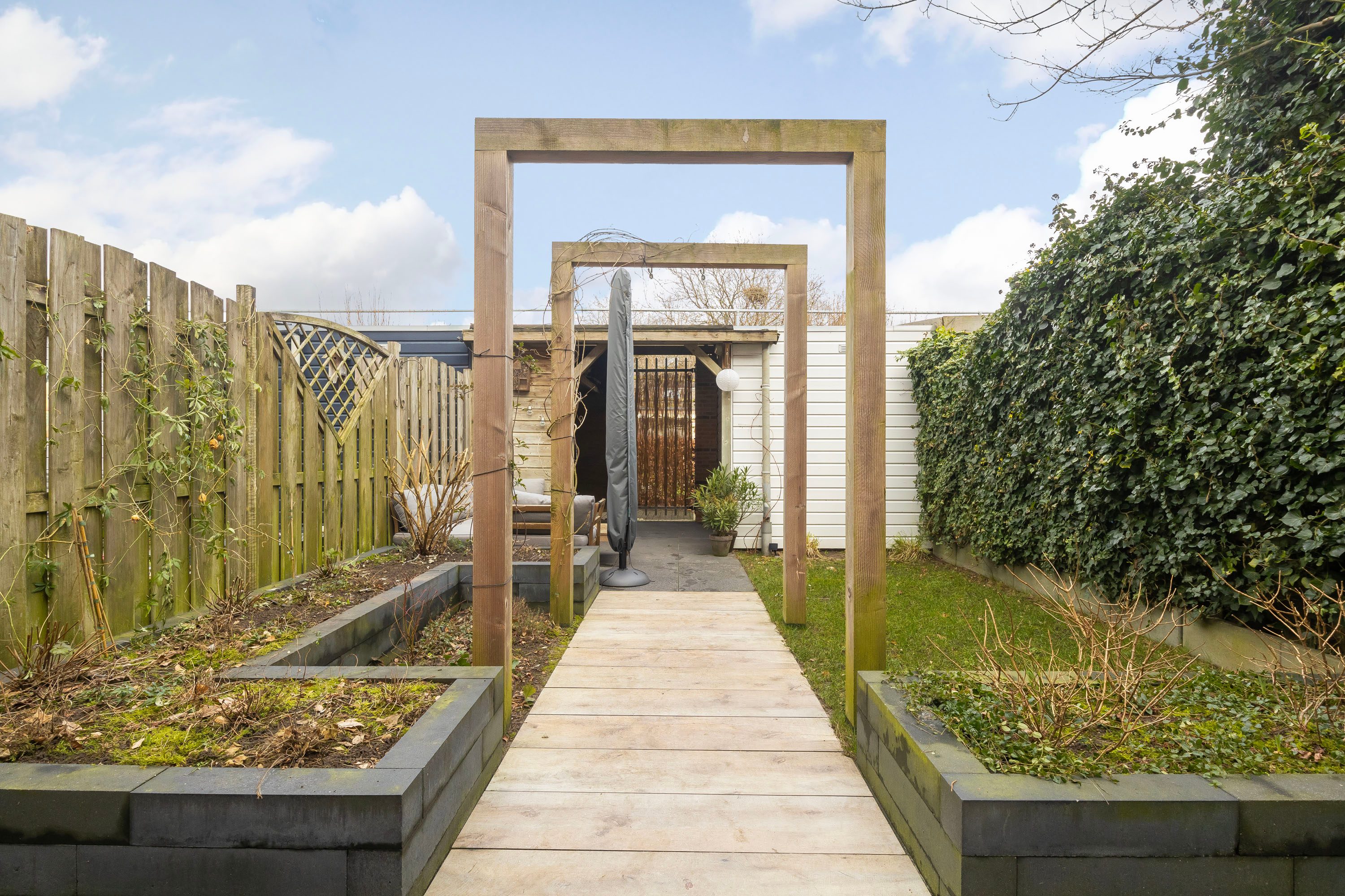 Via de deur in de woonkamer stap je de tuin in. De tuin is netjes aangelegd en verderop kun je heerlijk van de zon genieten. Achterin bevindt zich een houten berging. De tuin is ook bereikbaar via een achterom.