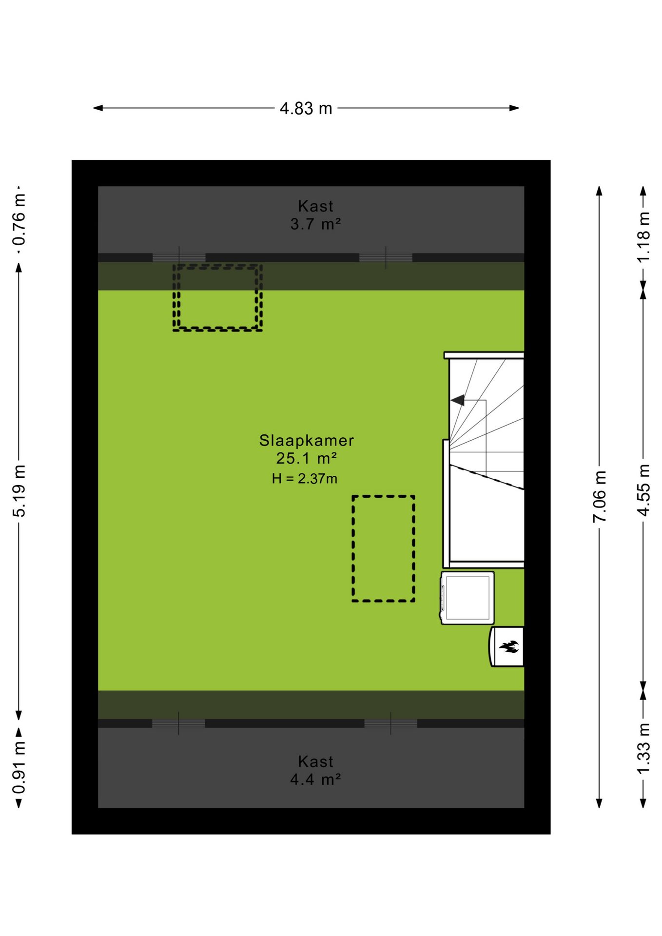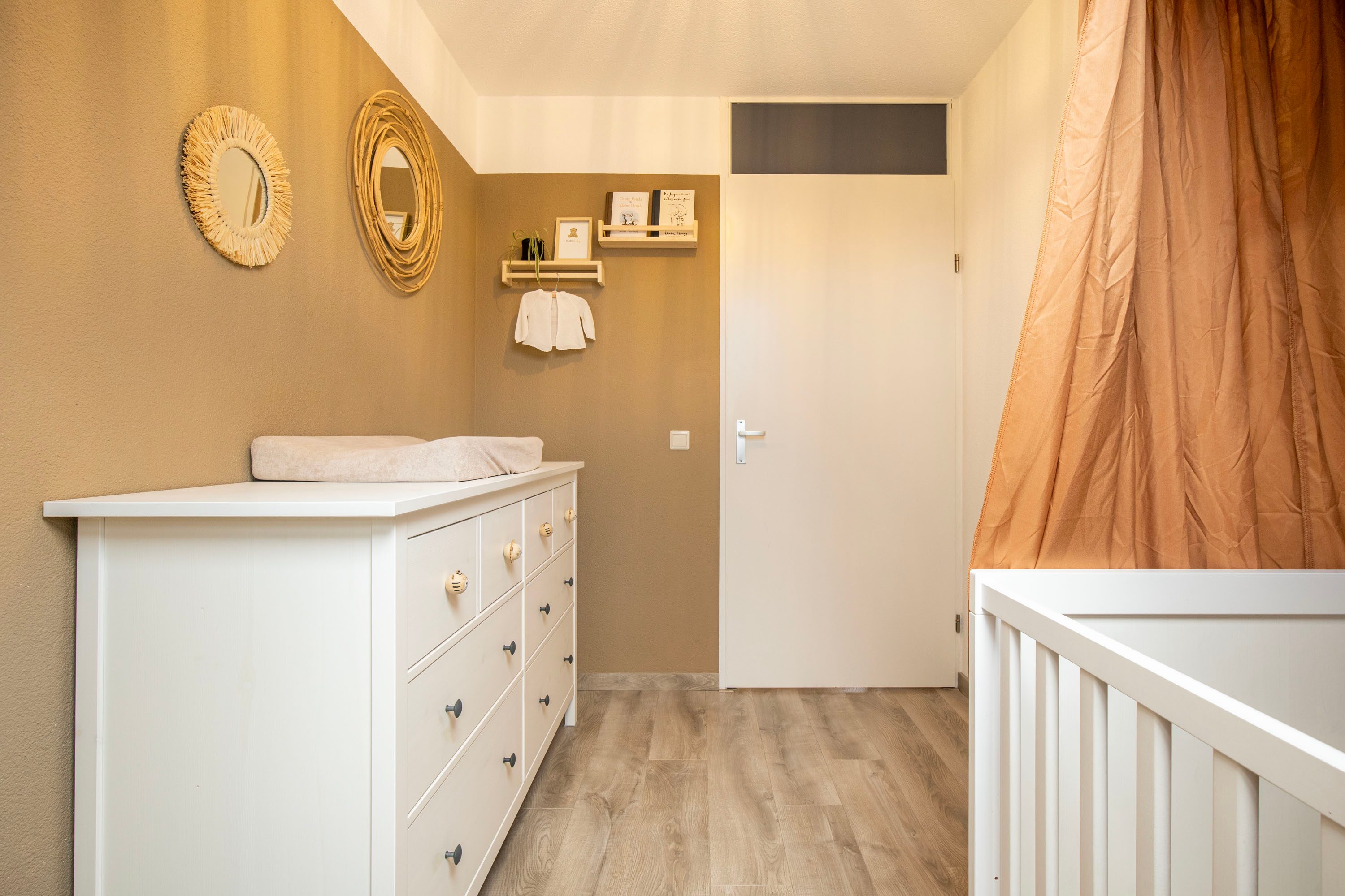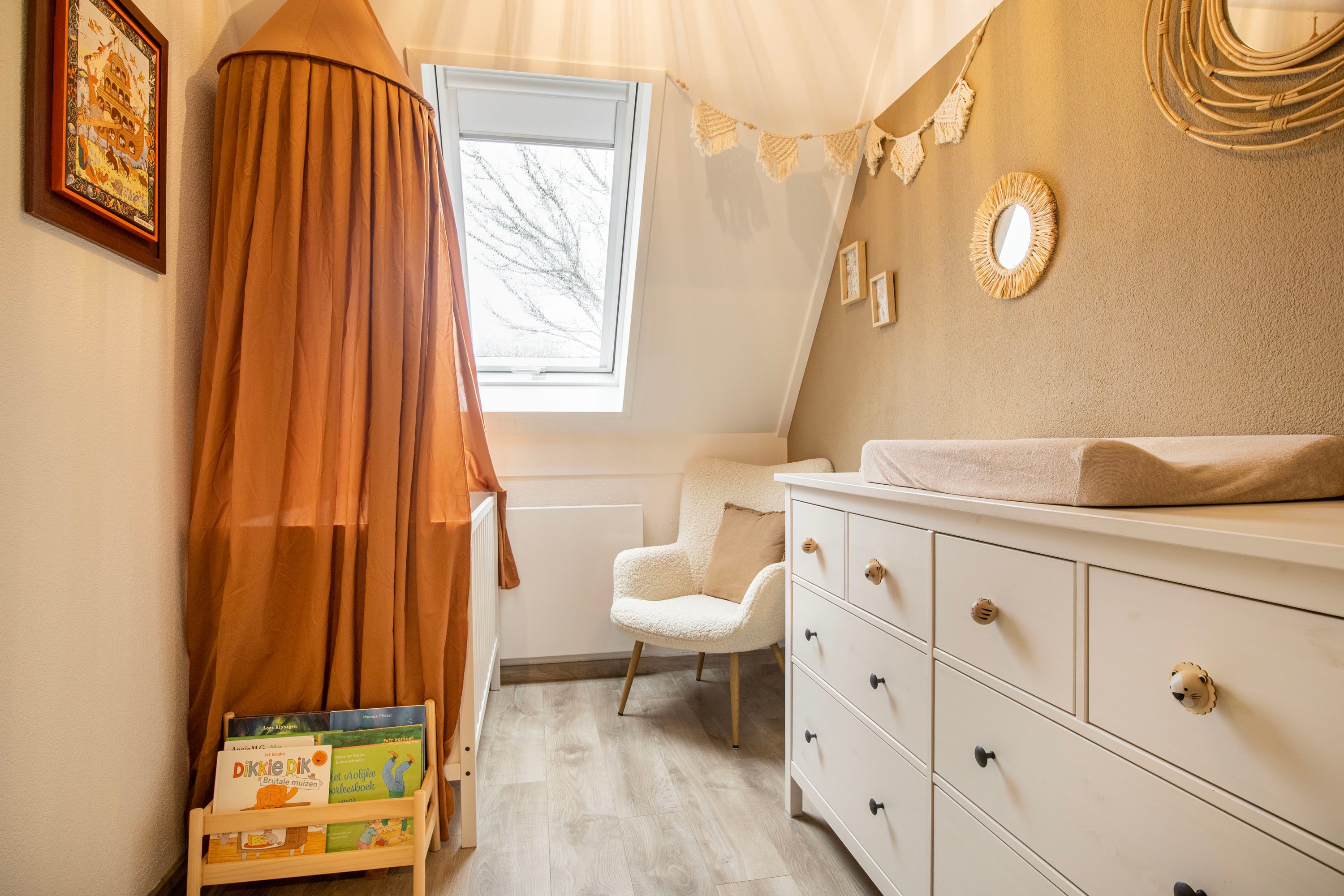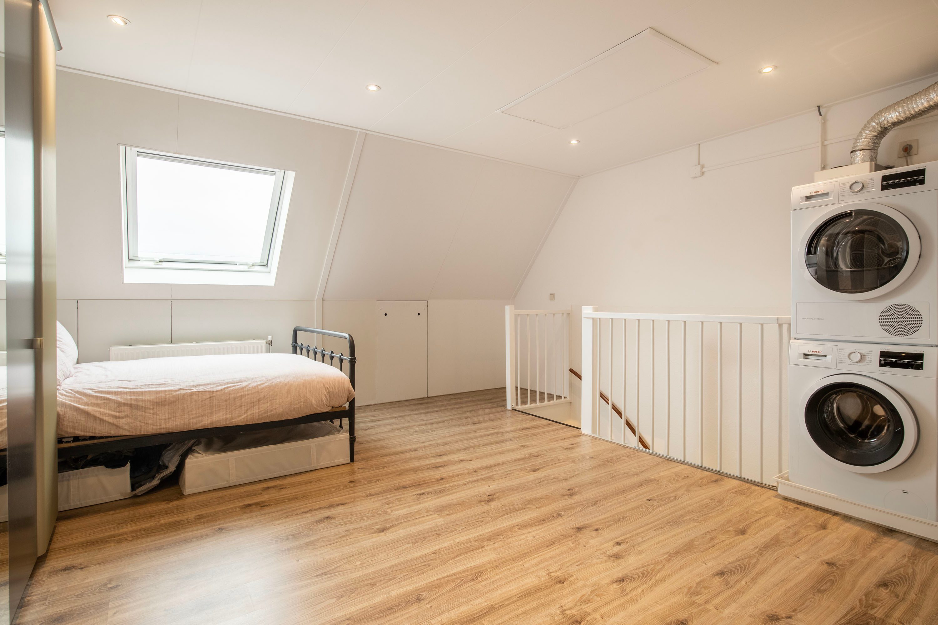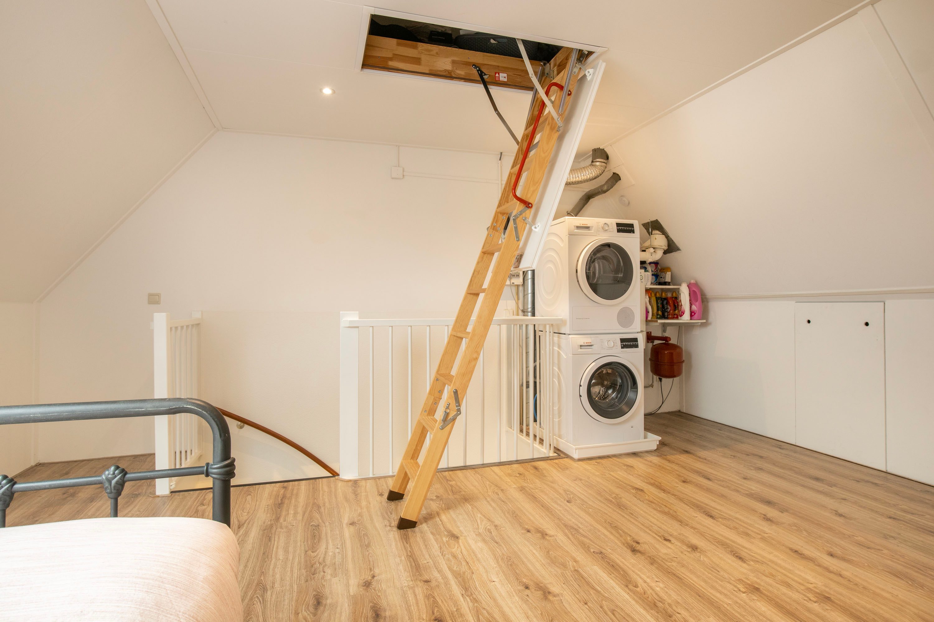 Er is een aansluiting voor de wasmachine en droger, en je vindt hier de mogelijkheid voor een vierde slaapkamer met een dakraam. Achter de schuine kanten is er voldoende ruimte voor het opbergen van diverse spullen. Vanaf deze verdieping heb je ook toegang tot de bergvliering middels een vlizotrap.