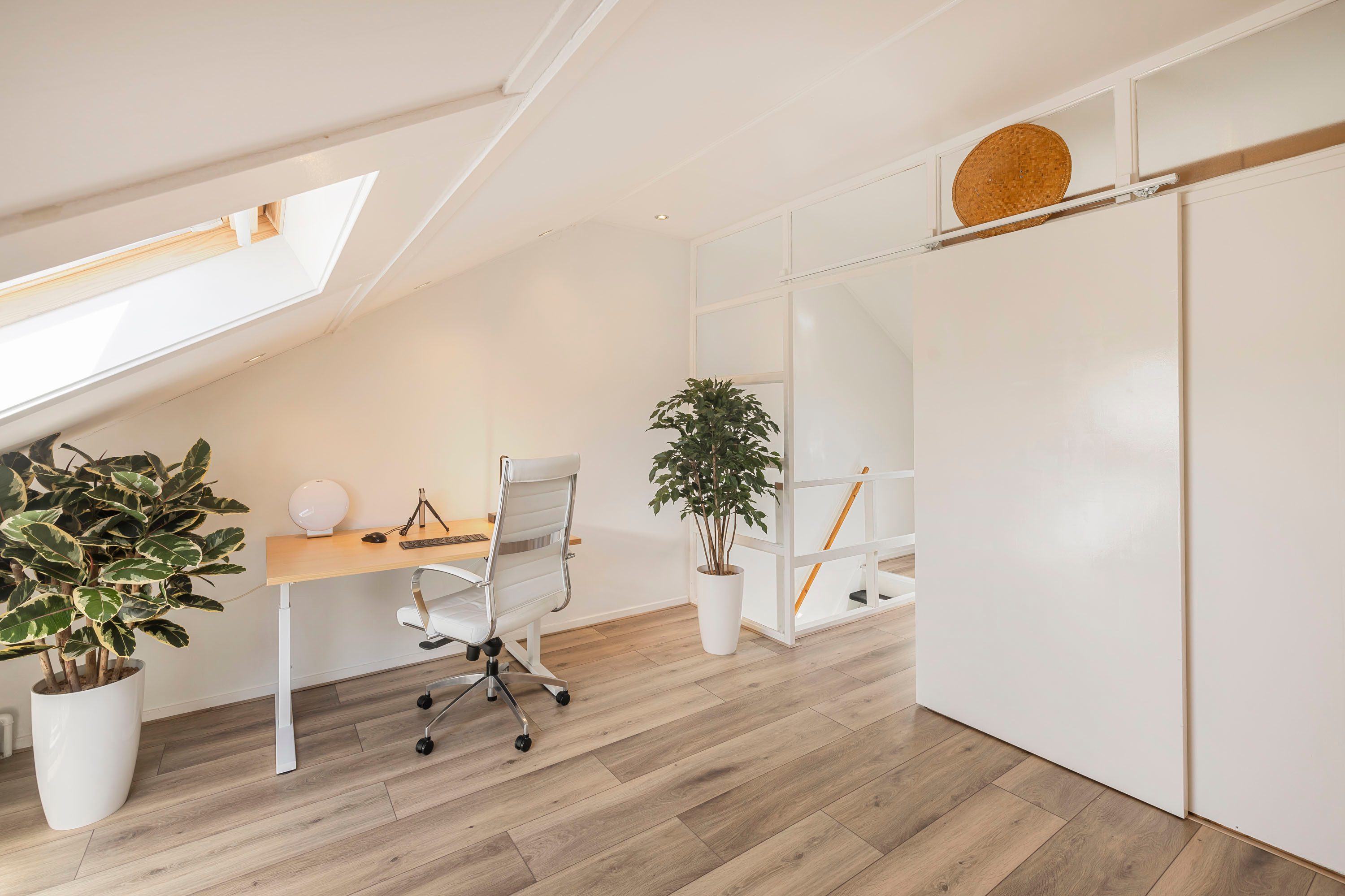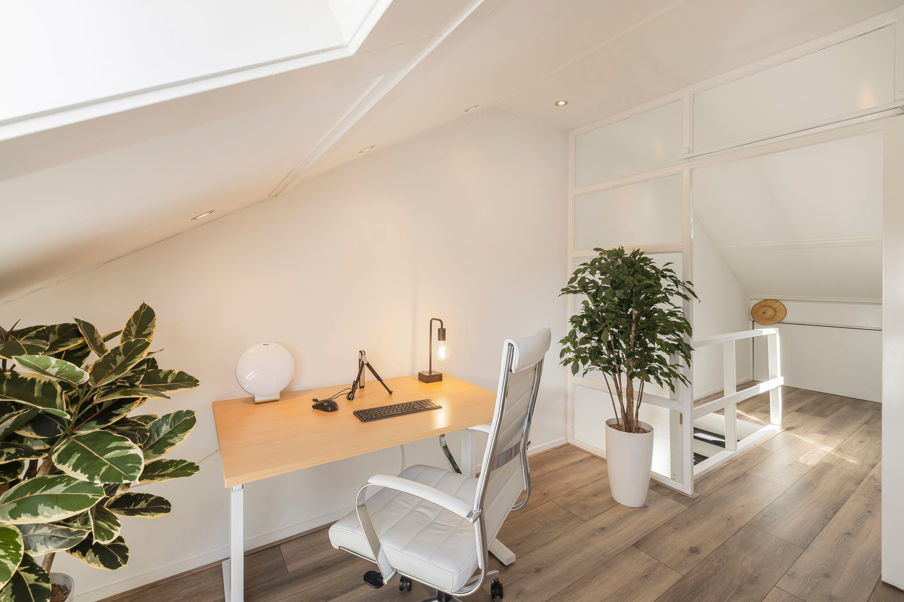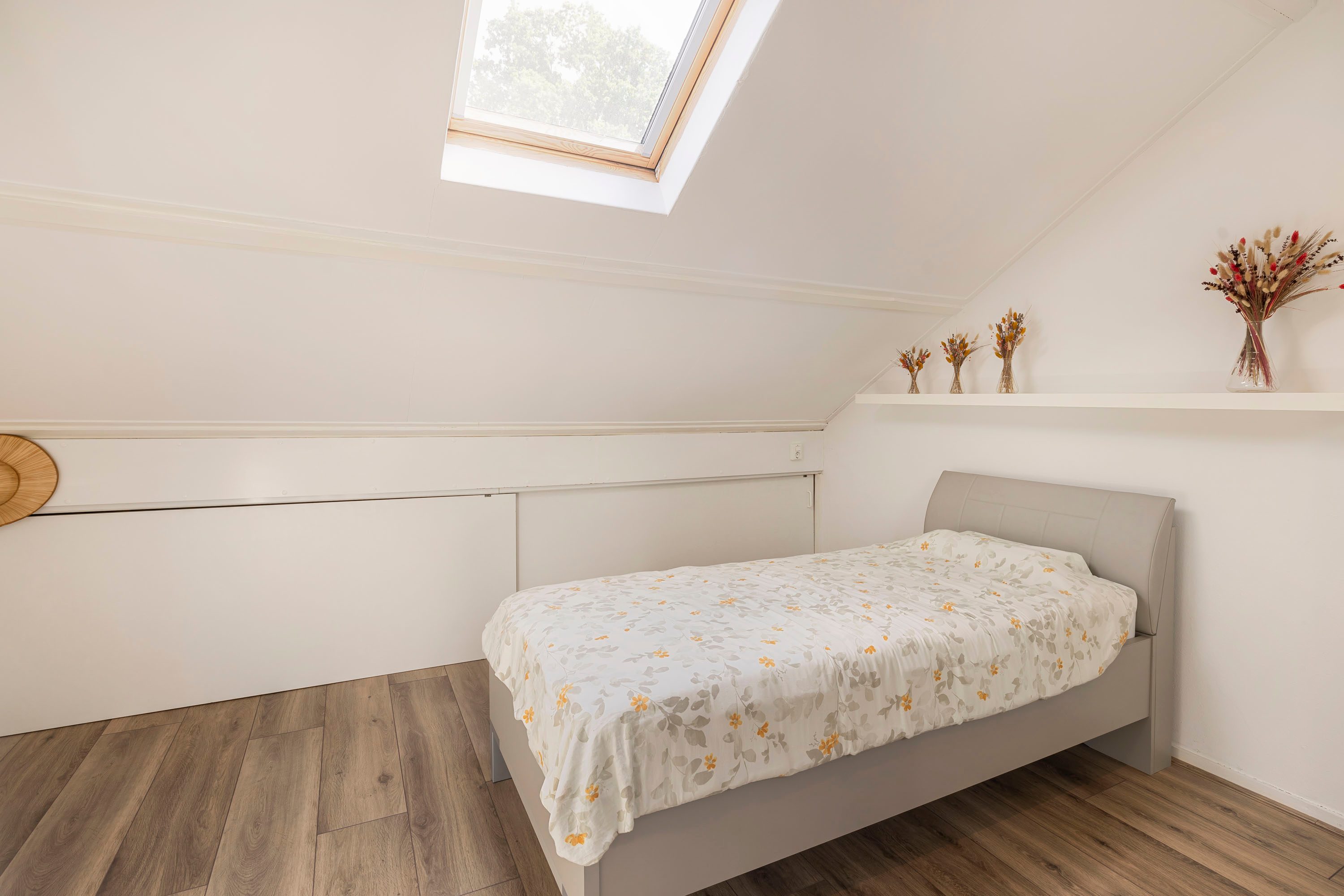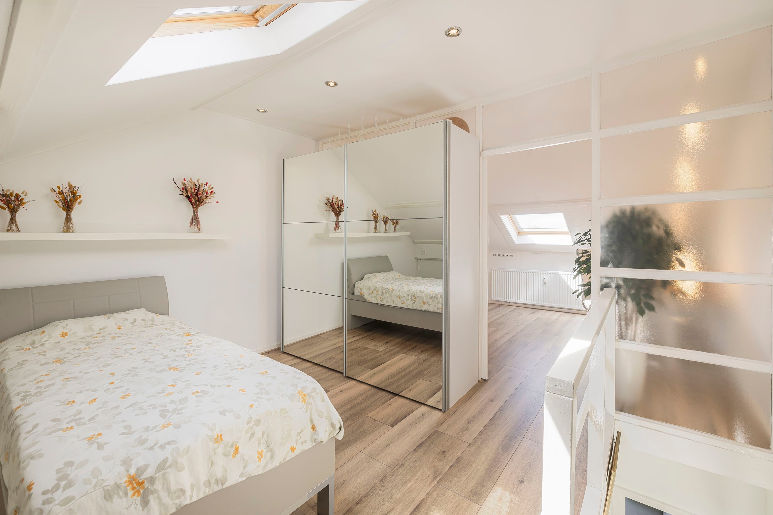 Via een vaste trap bereik je de royale bovenverdieping, waar zich een ruime slaapkamer bevindt. Daarnaast is er, door de glazen tussenscheiding, toegang tot een tweede kamer die geheel naar wens kan worden ingedeeld. Deze extra ruimte is perfect te gebruiken als kastenkamer, thuiswerkplek of bijvoorbeeld hobbyruimte, afhankelijk van jouw behoeften.
