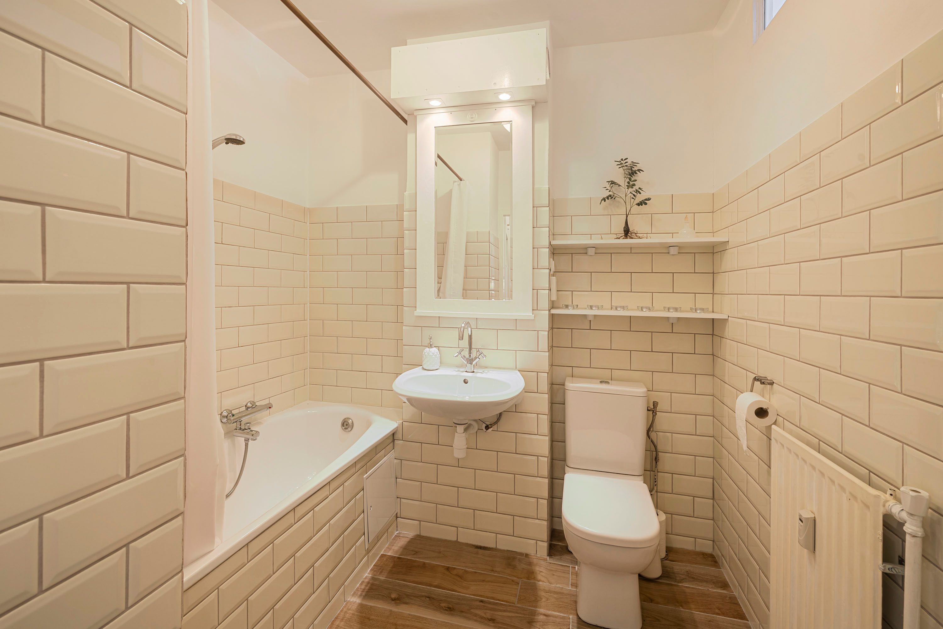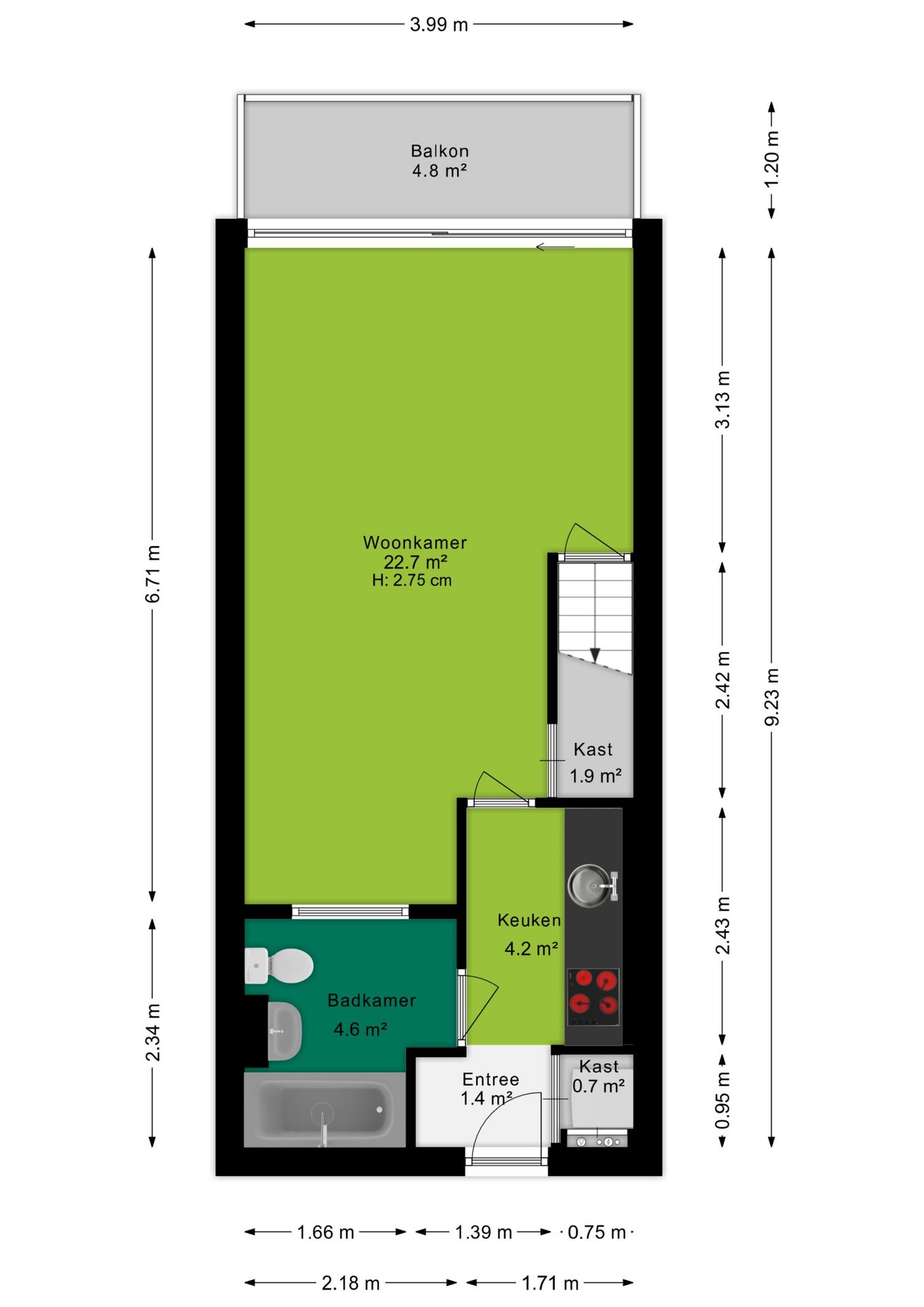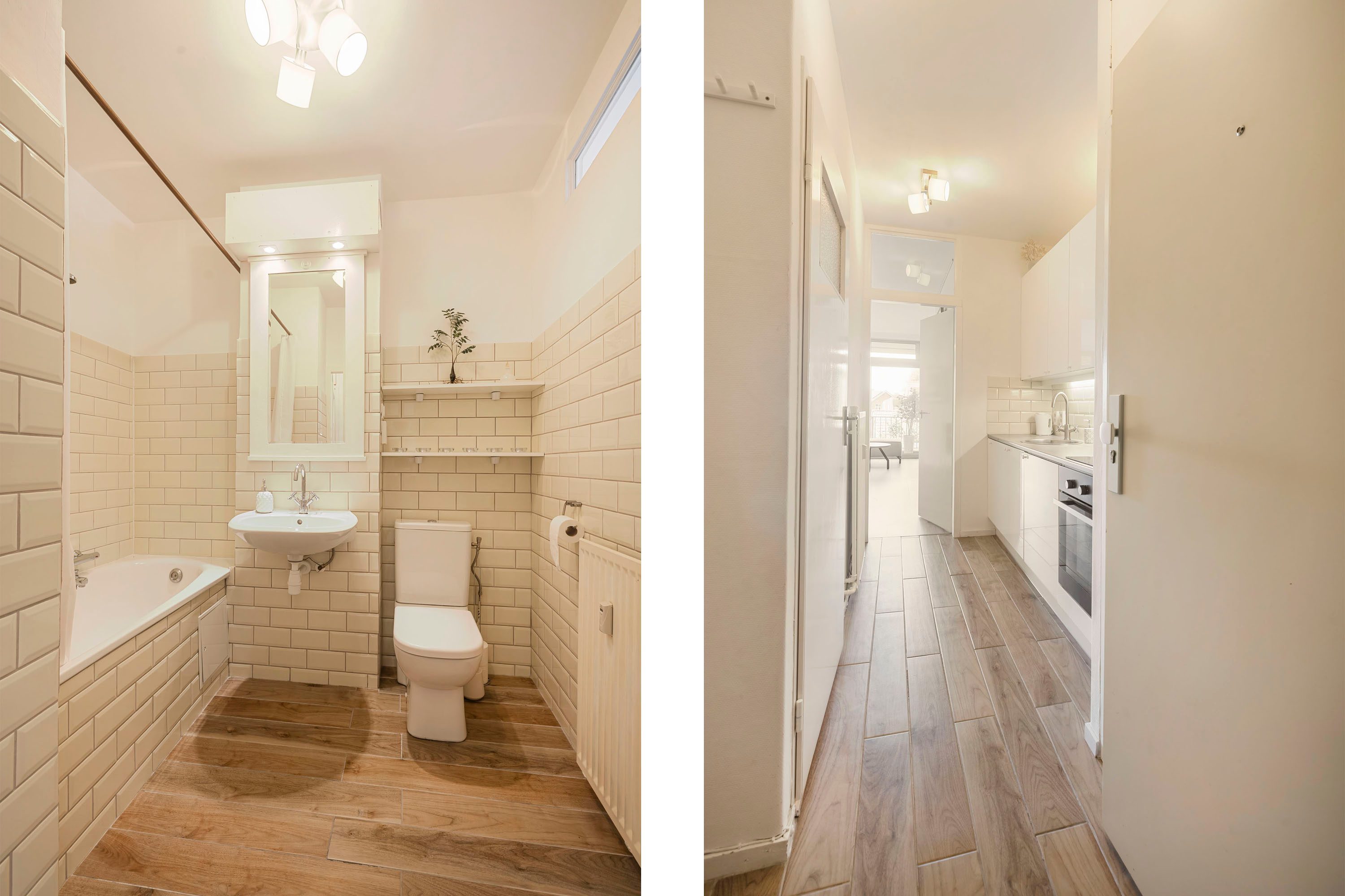 Het woongedeelte valt op door het prettige lichtinval en het groene uitzicht, wat direct bijdraagt aan een uitnodigende sfeer. Via de schuifpui kom je op het balkon, dat een verlengstuk vormt van je leefruimte. Het balkon van circa 5m², gelegen op het westen, biedt een fijne plek om zowel van de middag- als de avondzon te genieten. De praktische trapkast biedt ruimte om spullen uit het zicht op te bergen. Deze buitenruimte nodigt uit om een fijne zithoek te creëren, ideaal voor een kop koffie of thee met een goed boek. De badkamer is ingericht met een ligbad voorzien van douchefunctie, wastafel en een toilet.